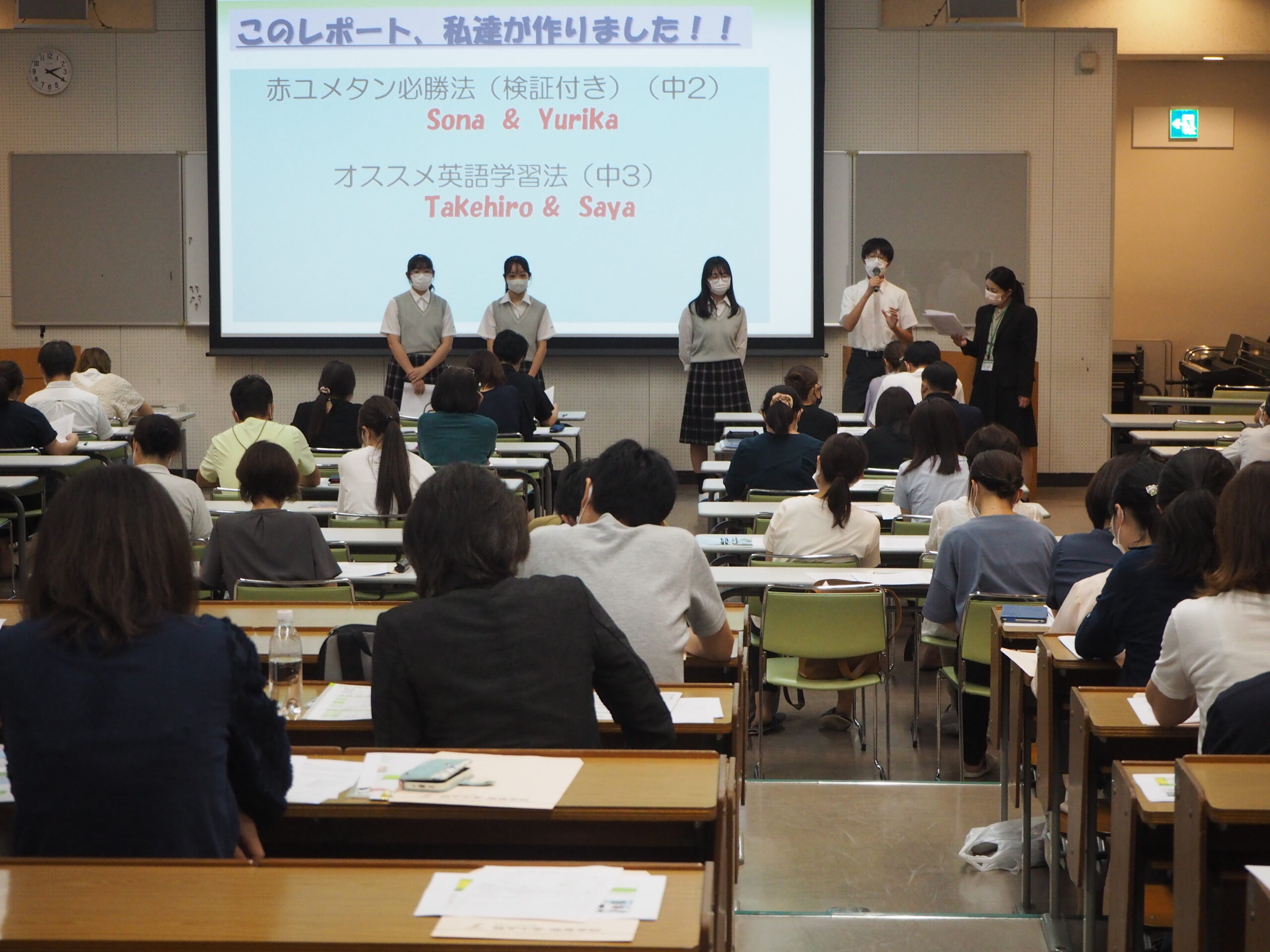 本日、昌平中学校第6回保護者対象説明会および解説授業体験が行われました。IB教育やSDGsについての説明を中心に、昌平中学校の取り組みや生活の様子を紹介しました。また、中学2年, 3年の在校生徒によるレポート「英単語暗記の必勝法とその検証」、「英語の最適な学習方法」の紹介が行われました。どの生徒も、多少の緊張は見られたものの、堂々と発表してくれました。