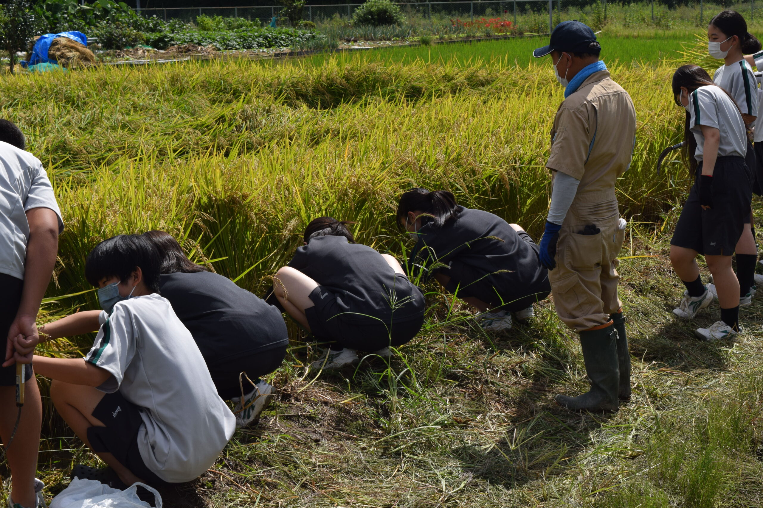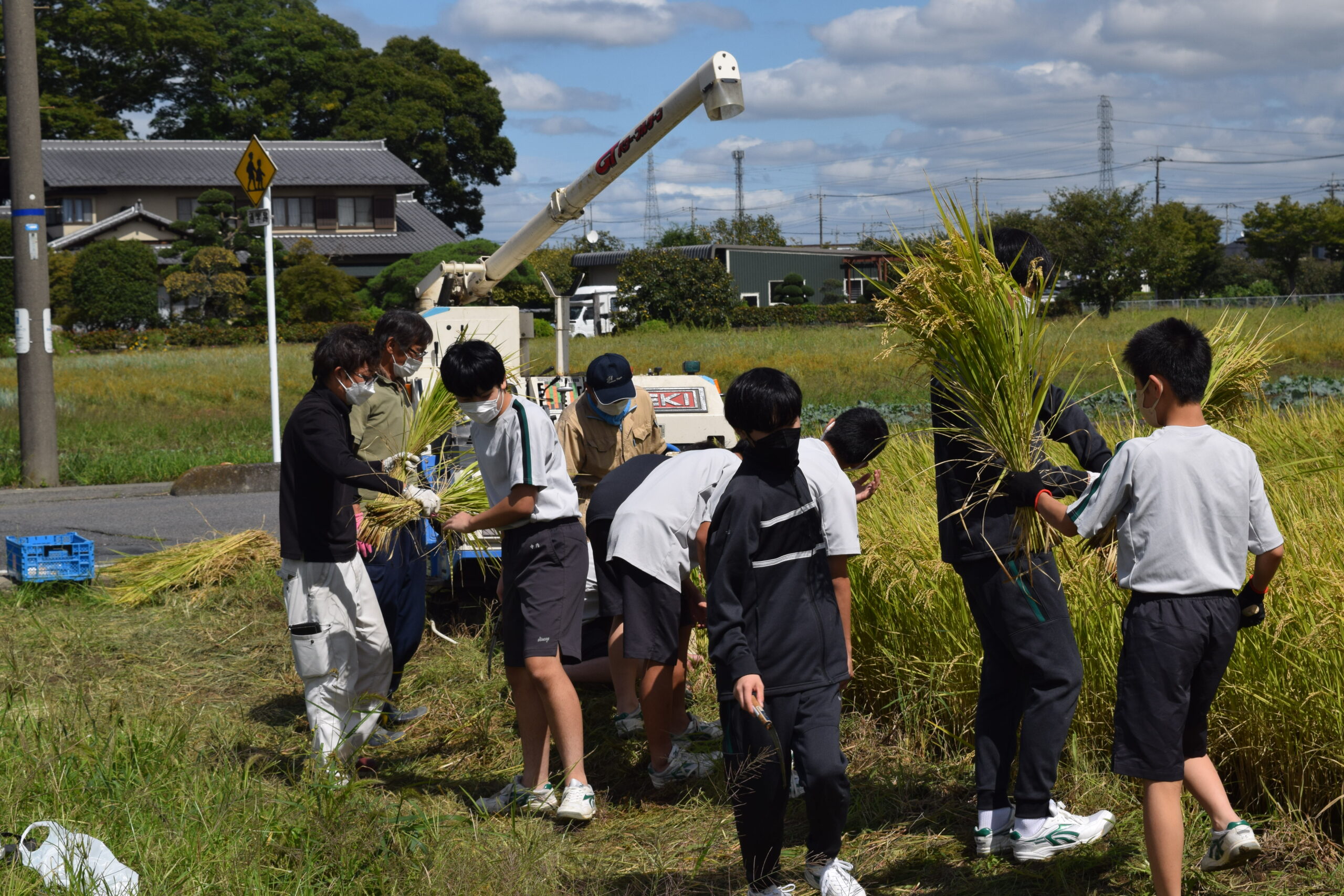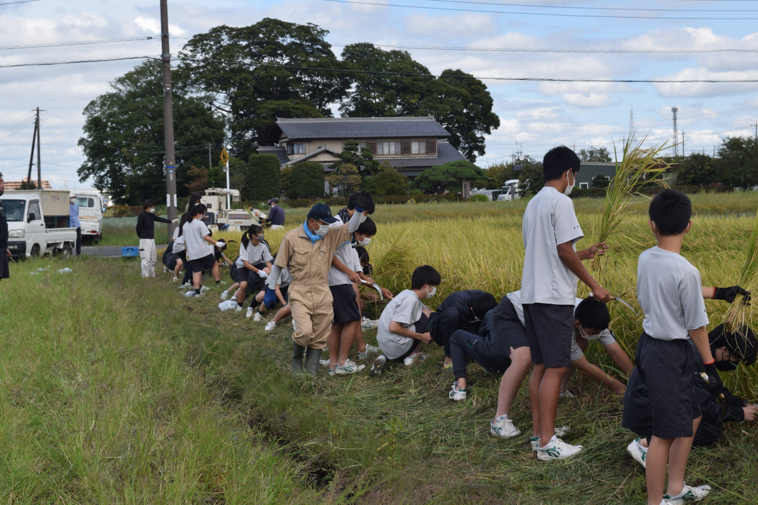 昨日、中学2年生は技術の授業で稲刈りを行いました。