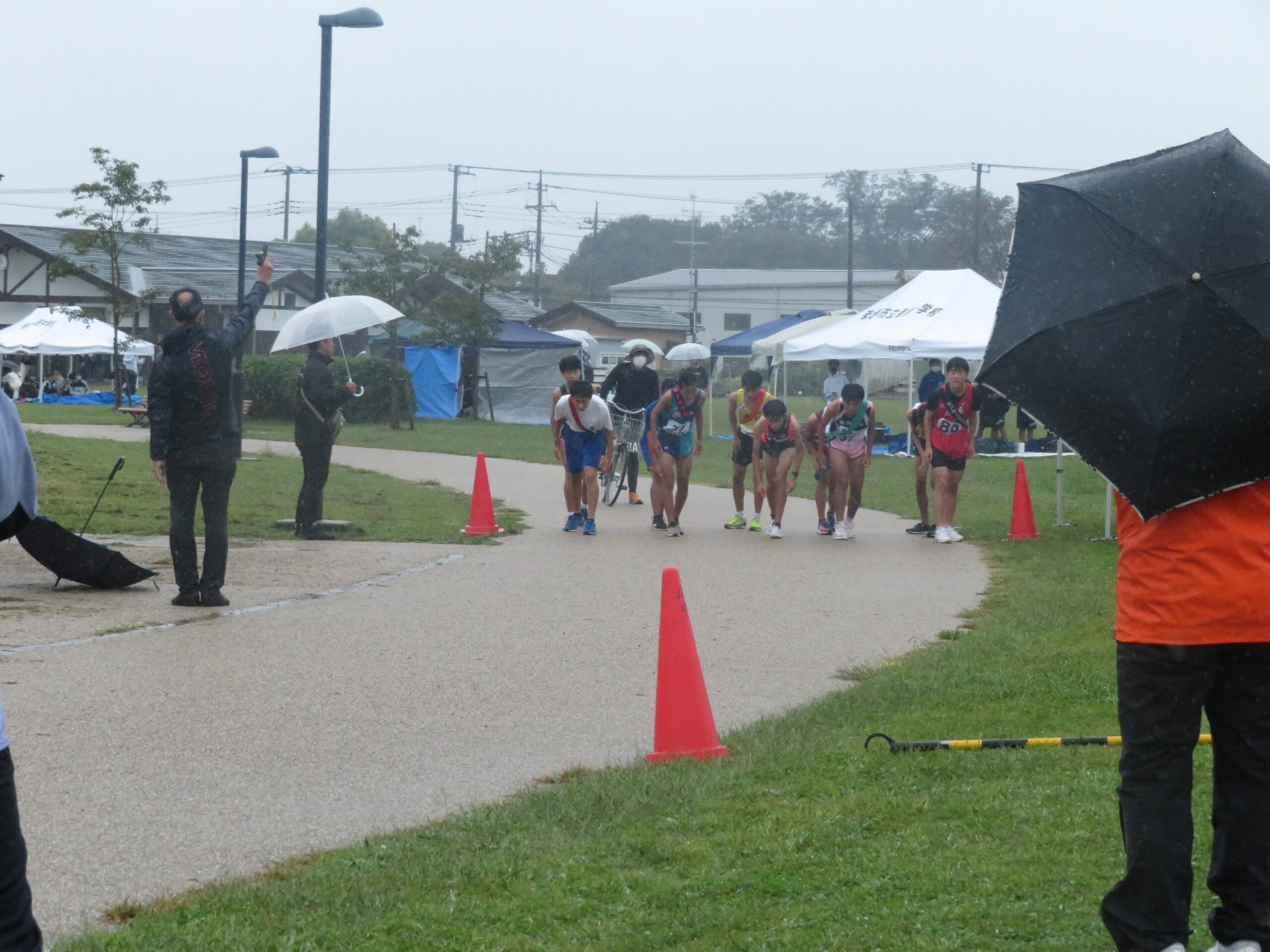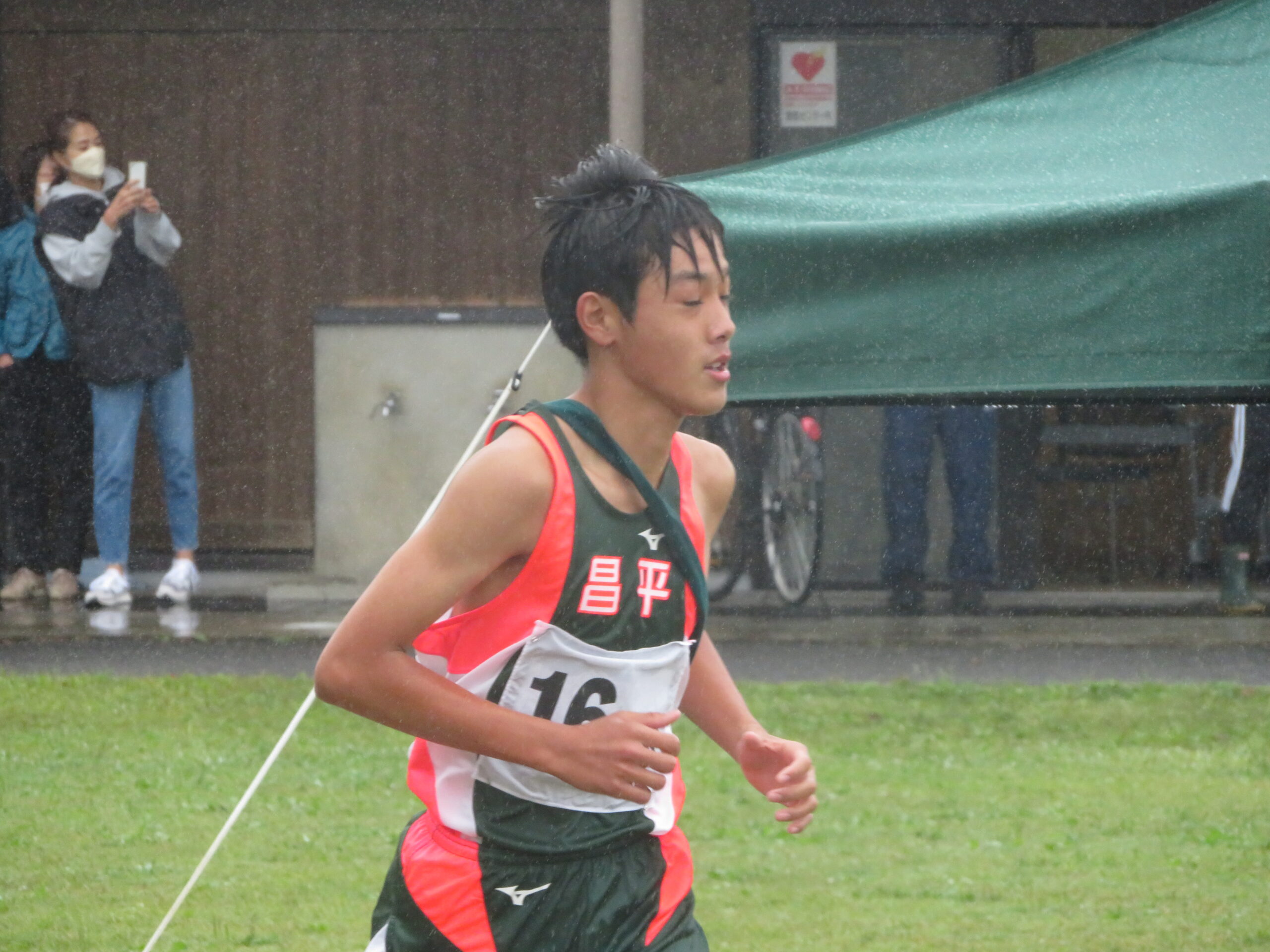 10月6日(木)まつぶし緑の丘公園にて令和4年度「北葛・幸手市駅伝競走大会」が行われました。今日の天気は雨、秋寒の中での大会となってしまいましたが、昌平中学校の選手達は奮起し、駅伝初優勝することができました。なかでも1区渡部智義・2区岩岡一暉が区間賞、3区平野龍空・5区長谷壱丸が区間2位の快走をみせ一区から2位と30秒差をキープしてのフィニッシュでした。