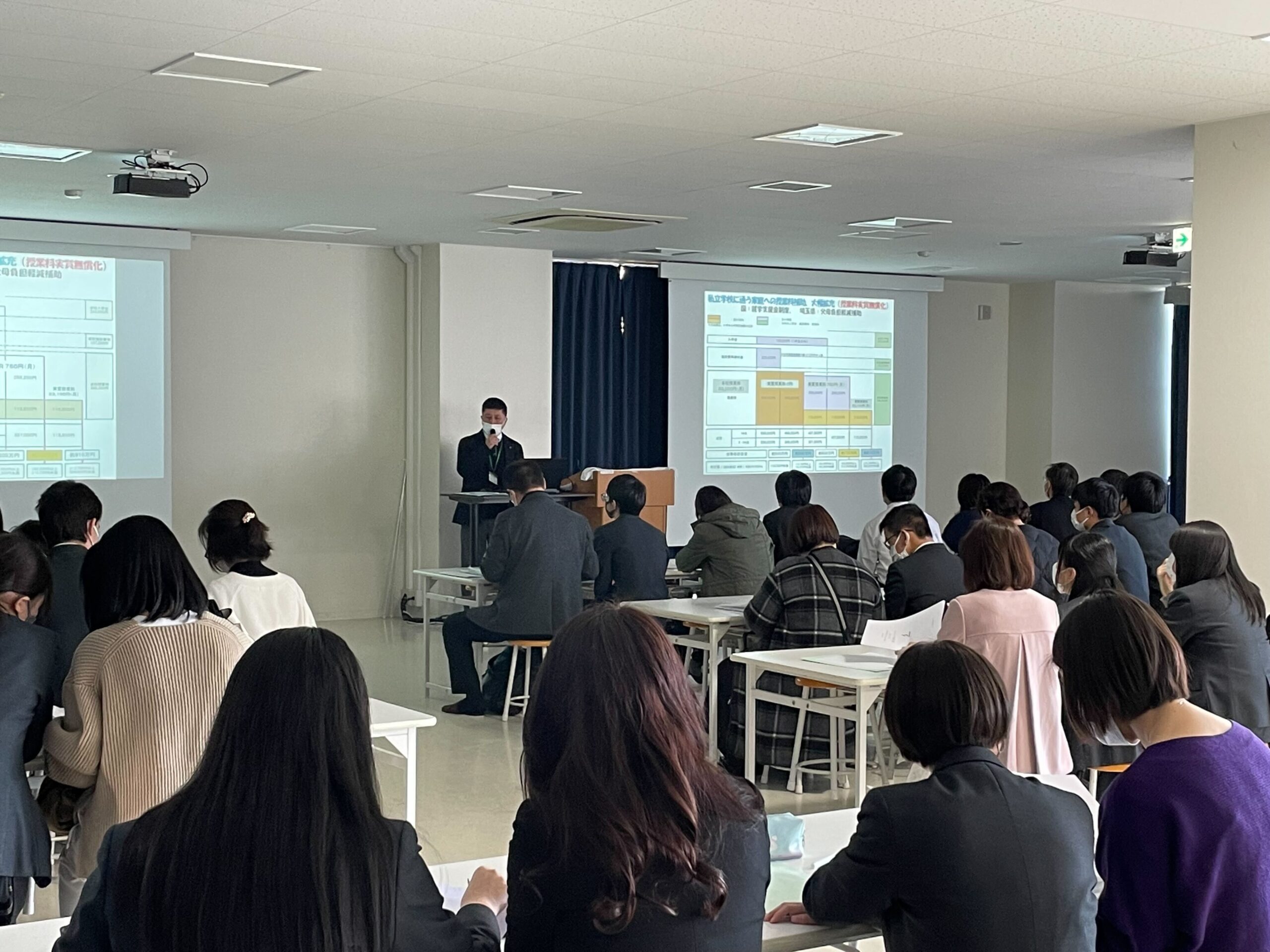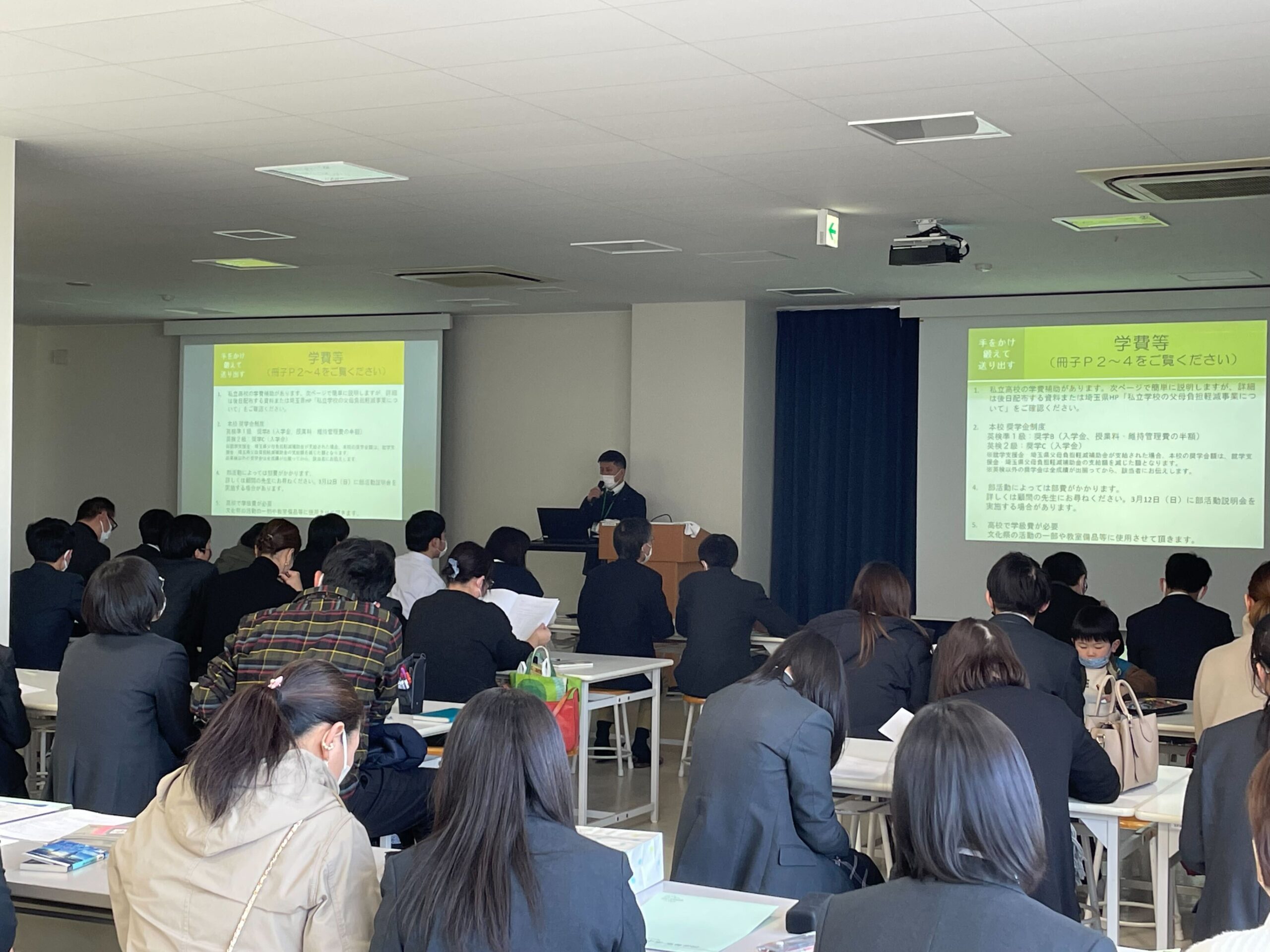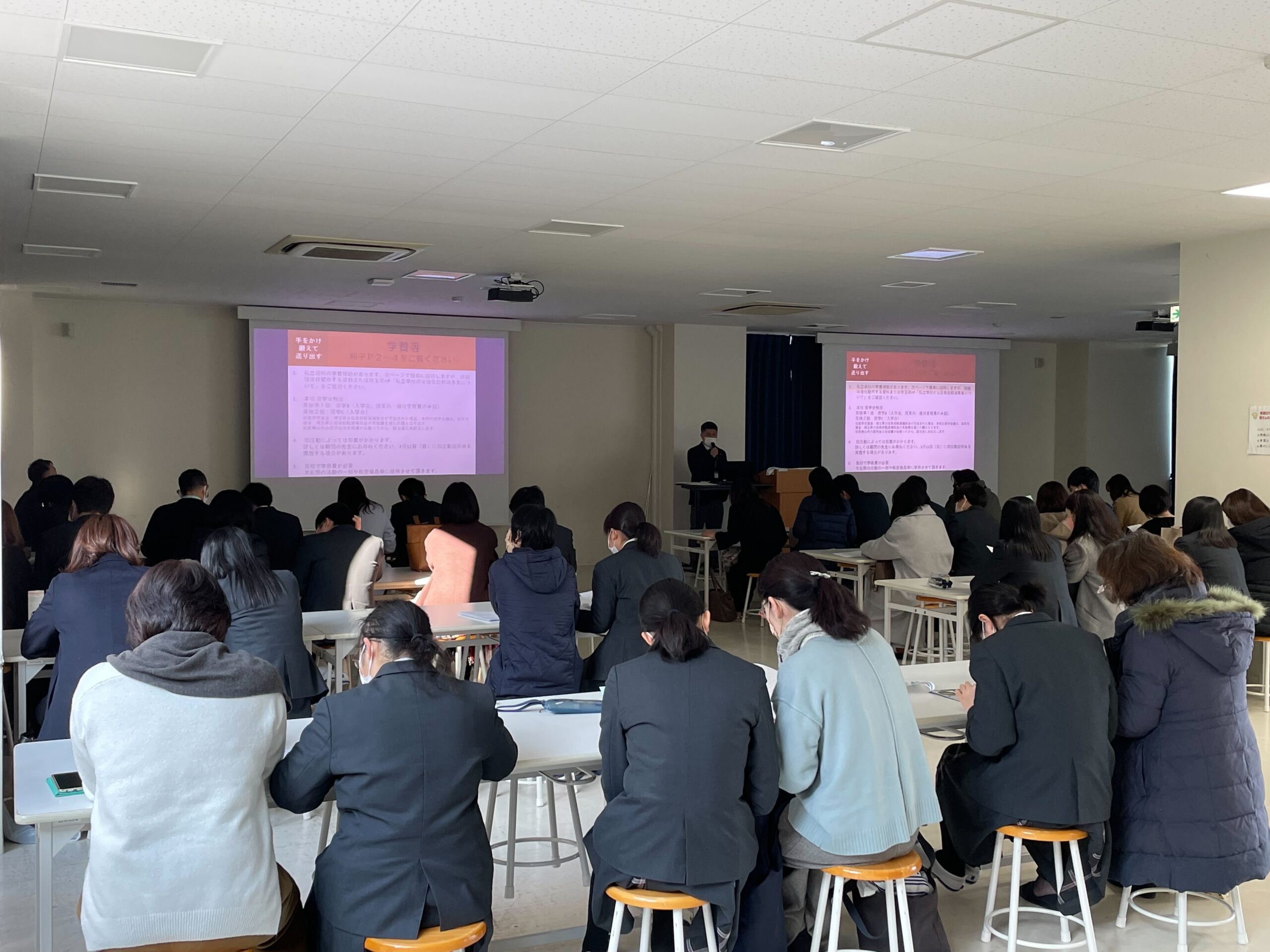 2月4日(立春)に、ランチルームにて保護者会を行いました。高校入学について村上学年主任から、修学旅行についてJTB岩﨑さん(本校の修学旅行を担当)から説明があり、保護者の皆さまには、お子さまと隣同士で座りながら、今後についての大切な話を聞いていただきました。保護者会の後は、サブアリーナにて高校制服の採寸が行われました。