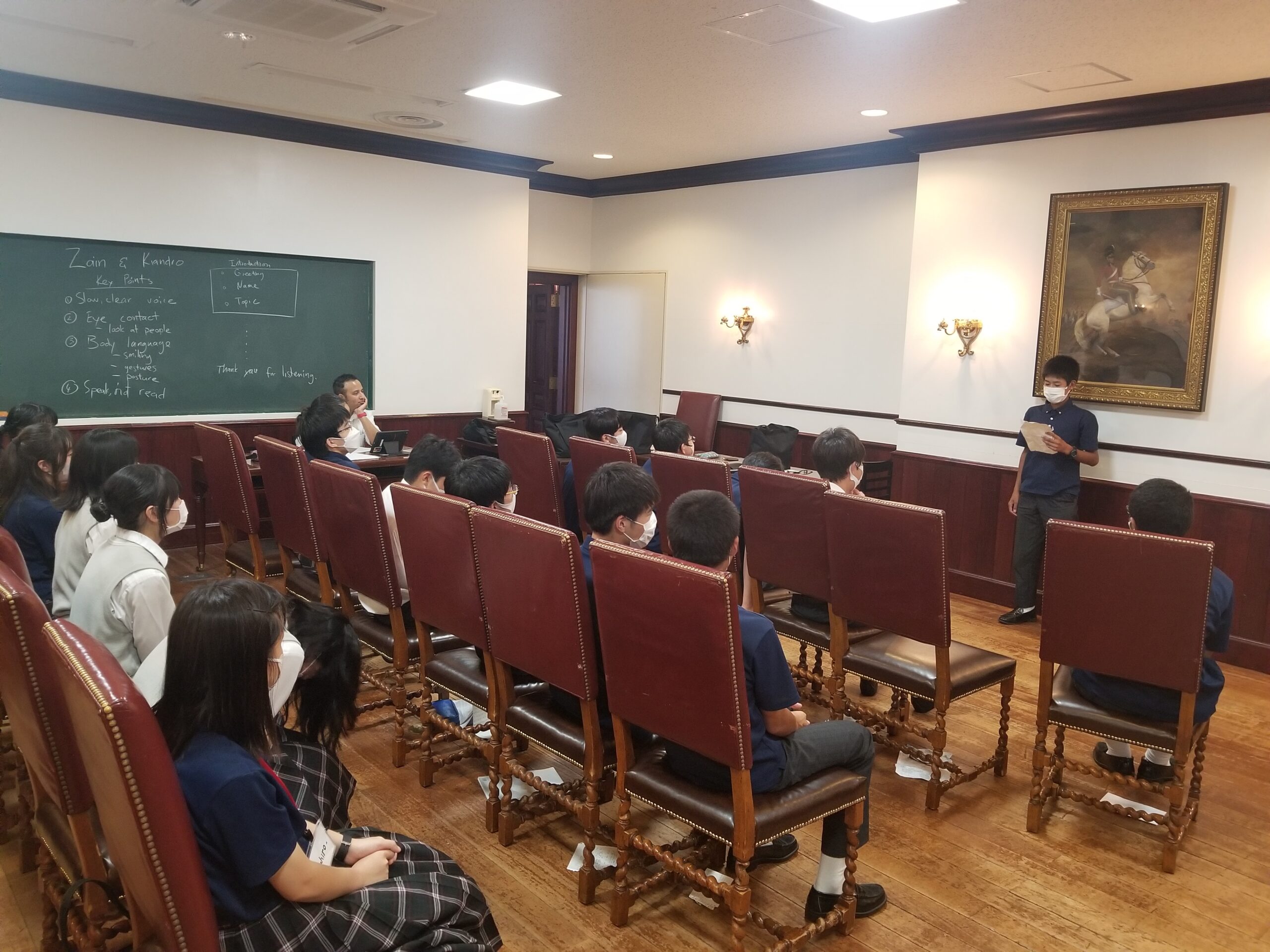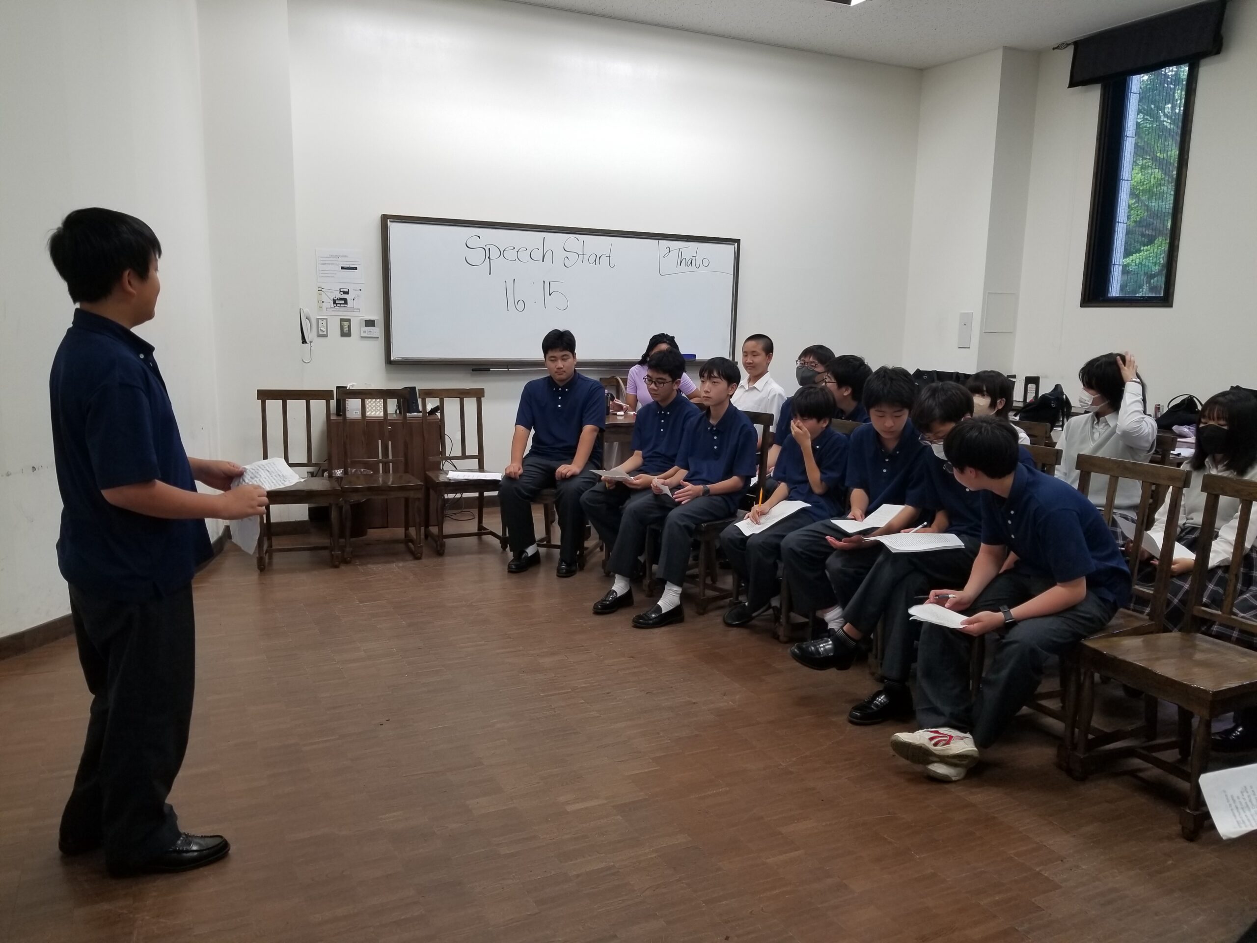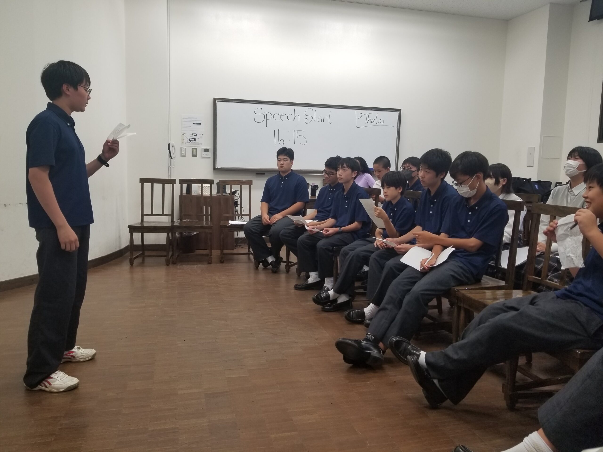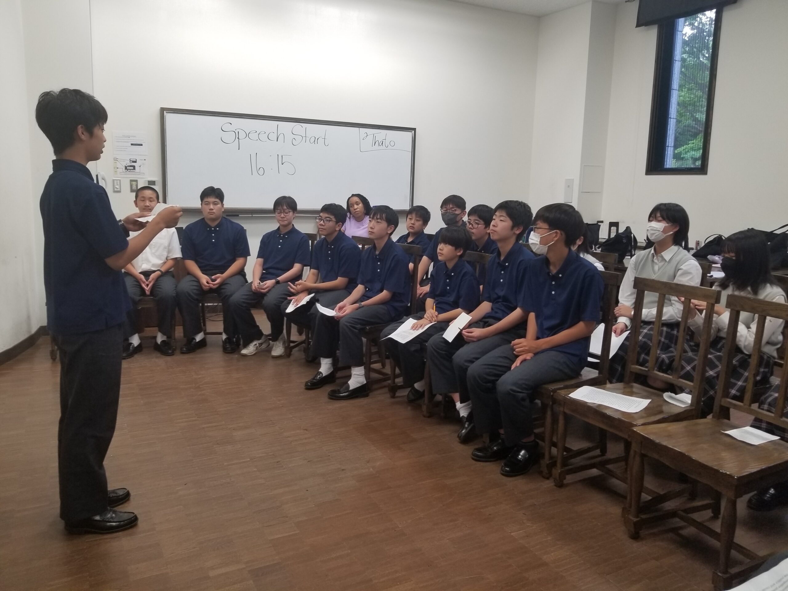 2日目の主な内容は、英語によるスピーチです。特にアイコンタクトやジェスチャーなど、普段はあまり意識しないことも練習し、事前に準備した原稿を元に全員が発表しました。大勢の前で緊張していましたが、自分の考えを一生懸命伝えようとする姿勢が見えました。