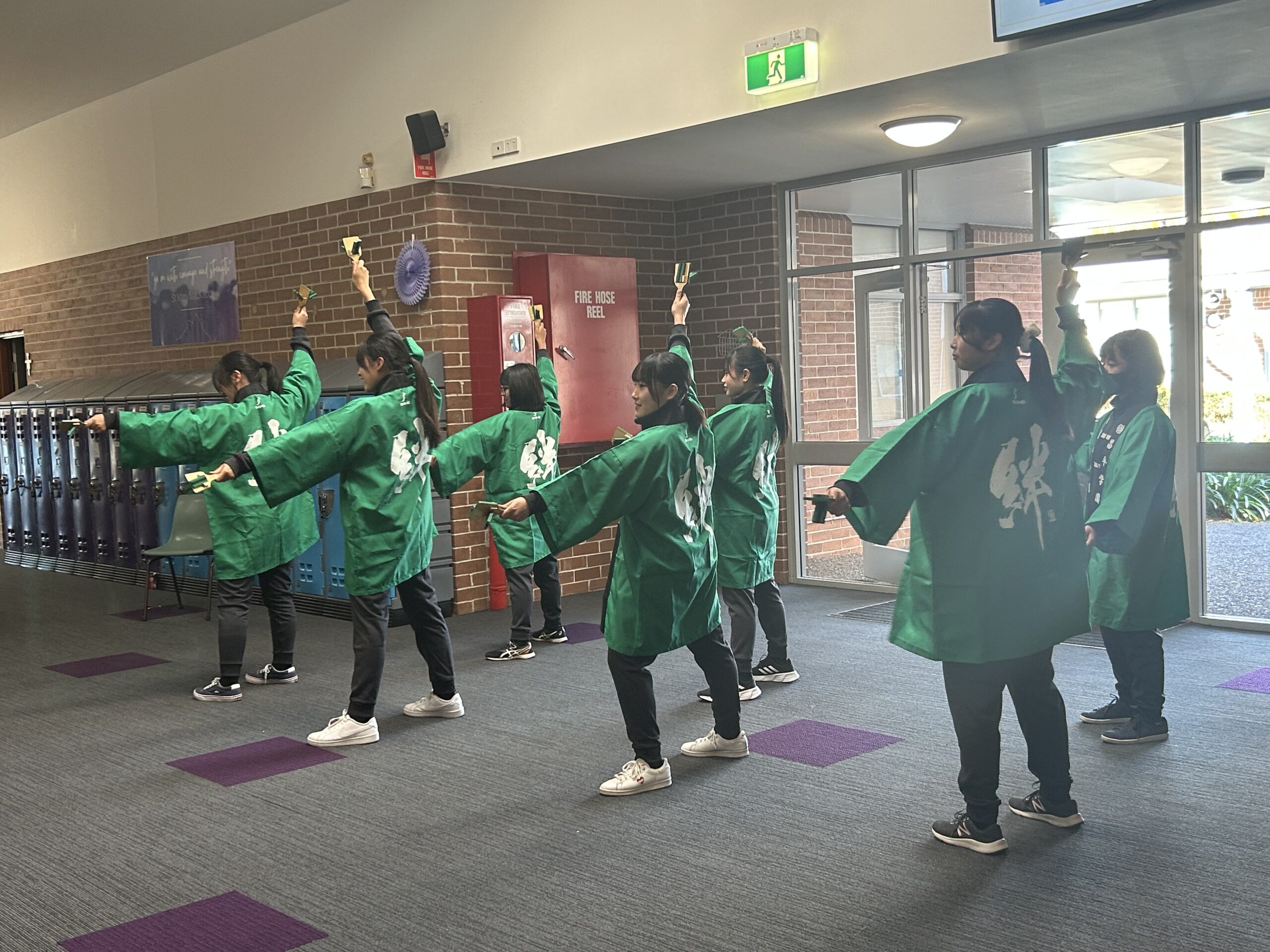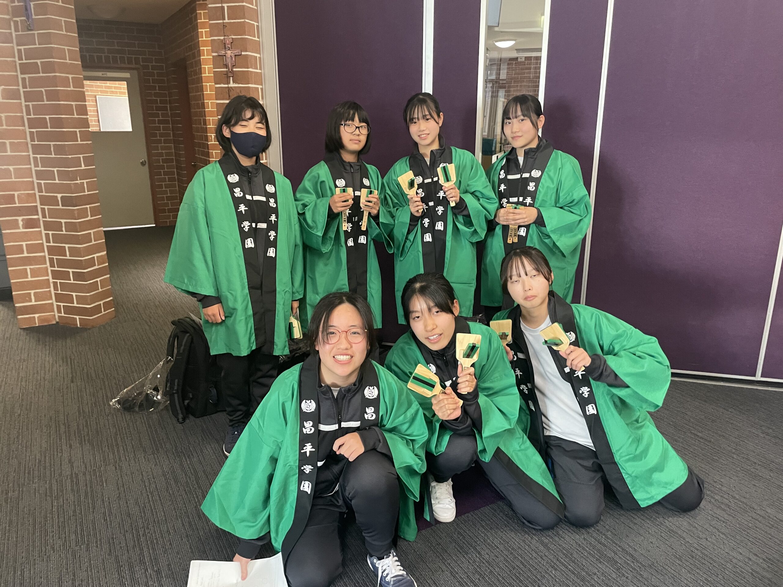 各クラスで商業やアートの授業を受けた後はいよいよ日本文化の紹介です。茶道についてのスピーチをしてから全員で昌平よさこいを踊りました。今日まで自宅やステイ先でたくさん練習してきた甲斐があり、多くの拍手をいただきました。アンコールにこたえて現地校の生徒たちも鳴子を手に一緒に踊り、先生もダンスに加わって大変盛り上がりました。