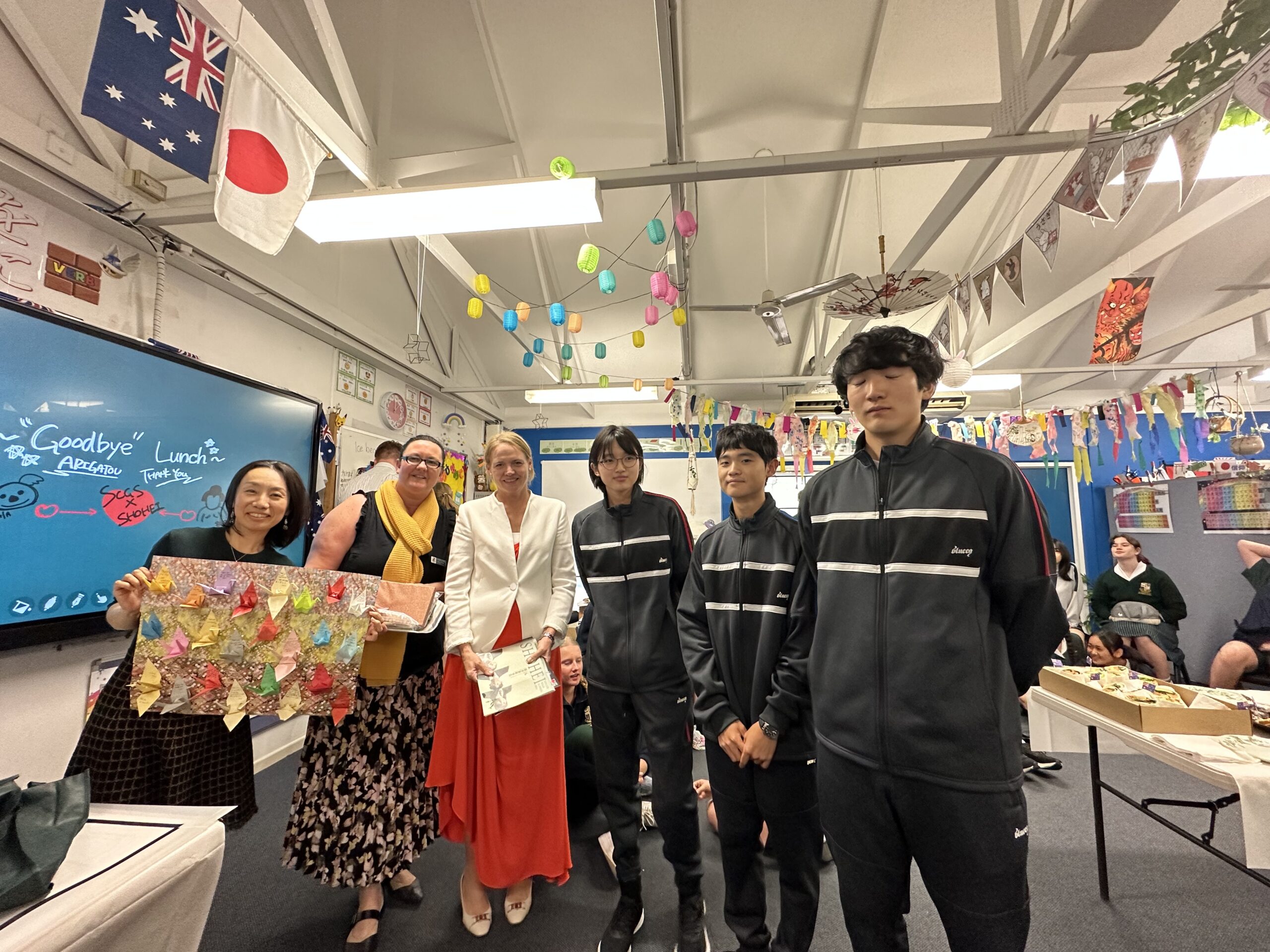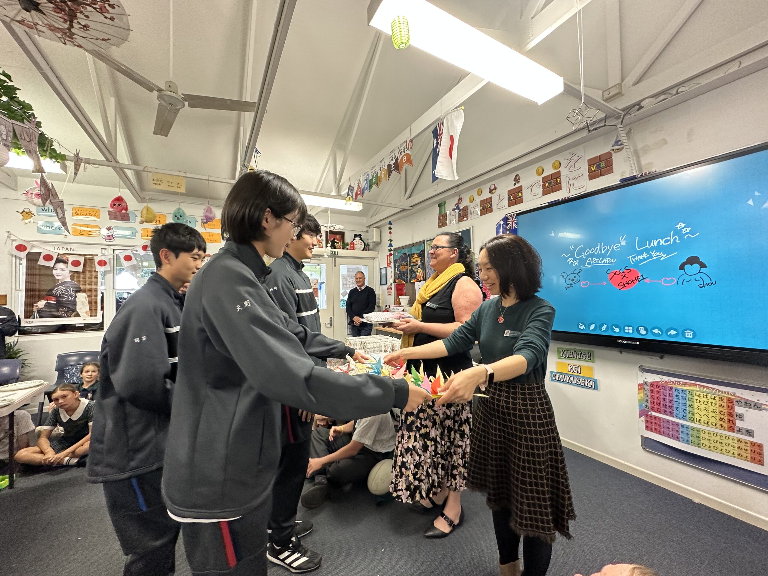 お昼休みには、学校でのバディやホストファミリーと“Good bye” lunchをとりました。そこで折り鶴で作ったメッセージカードと日本から持ってきた記念品をプレゼントし、昌平生を代表して、高校2年のゆいさんが御礼のスピーチをしました。充実した日々がいよいよ終わりを迎えることが実感される瞬間で、そこかしこで別れを惜しむハグがみられました。