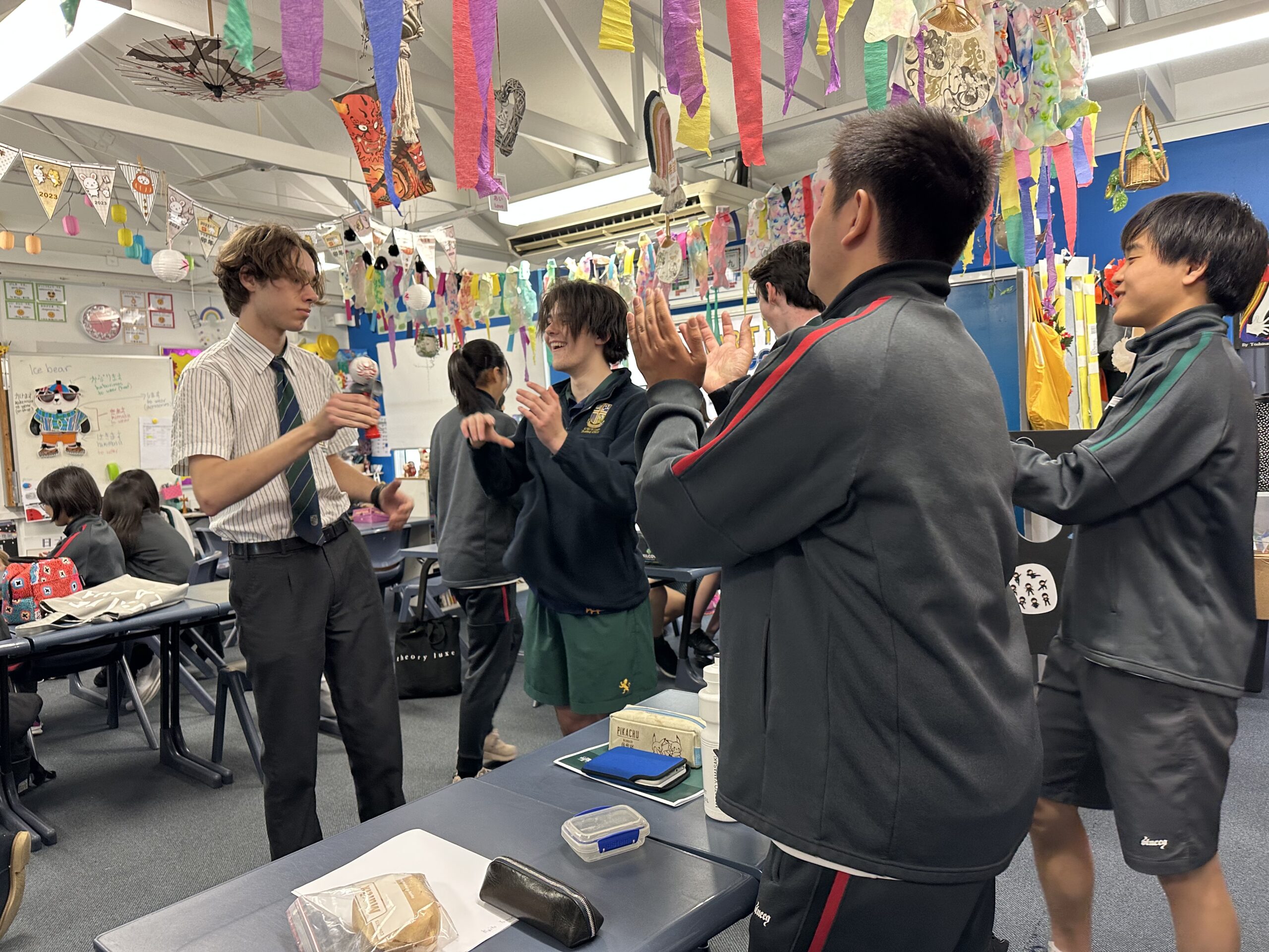 今日は、いよいよ授業最終日です。すっかりSCGSのルーティンにもなれた昌平生。バディと一緒のクラスで学んだり、高校1年生の日本語のクラスで英語と日本語を使ってゲーム(けん玉、折り紙、カタカナ)をしたりしました。すっかり打ち解けた生徒たちの姿に、こちらも思わず笑顔になります。