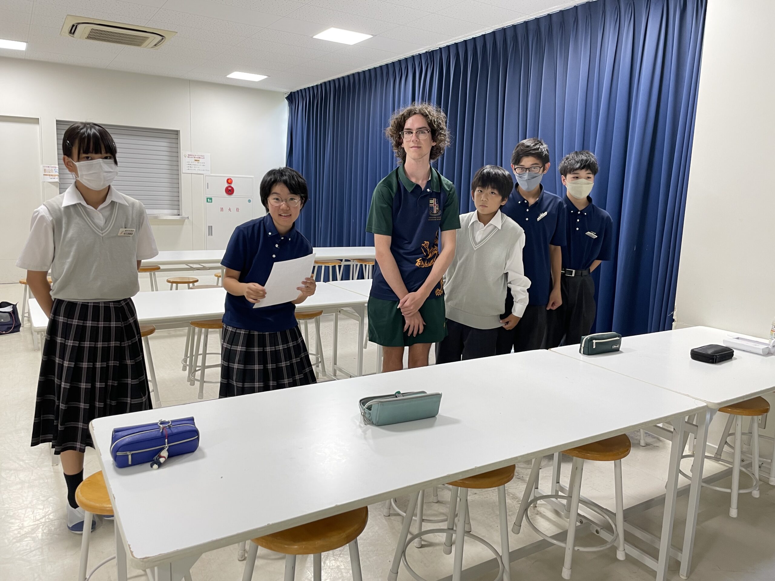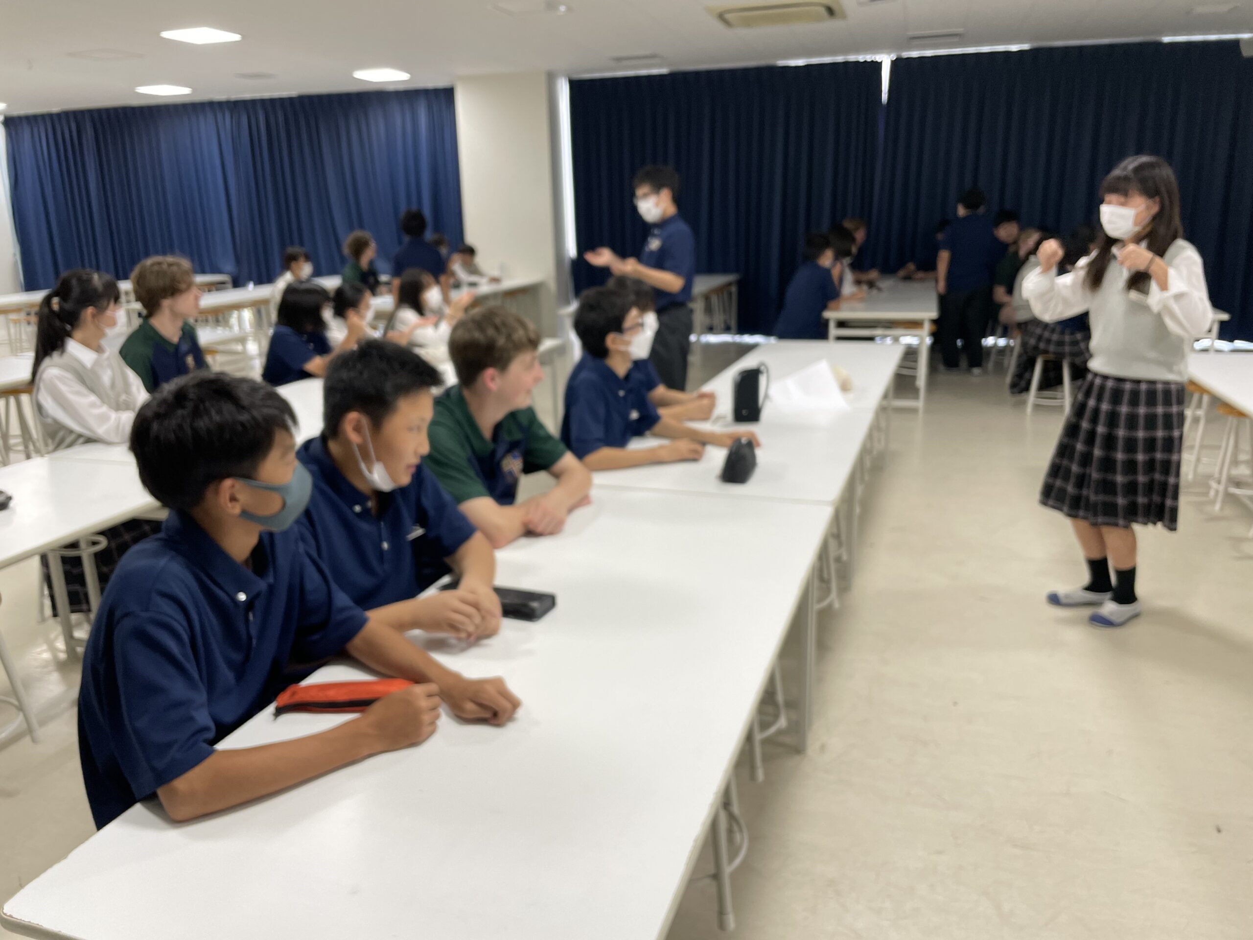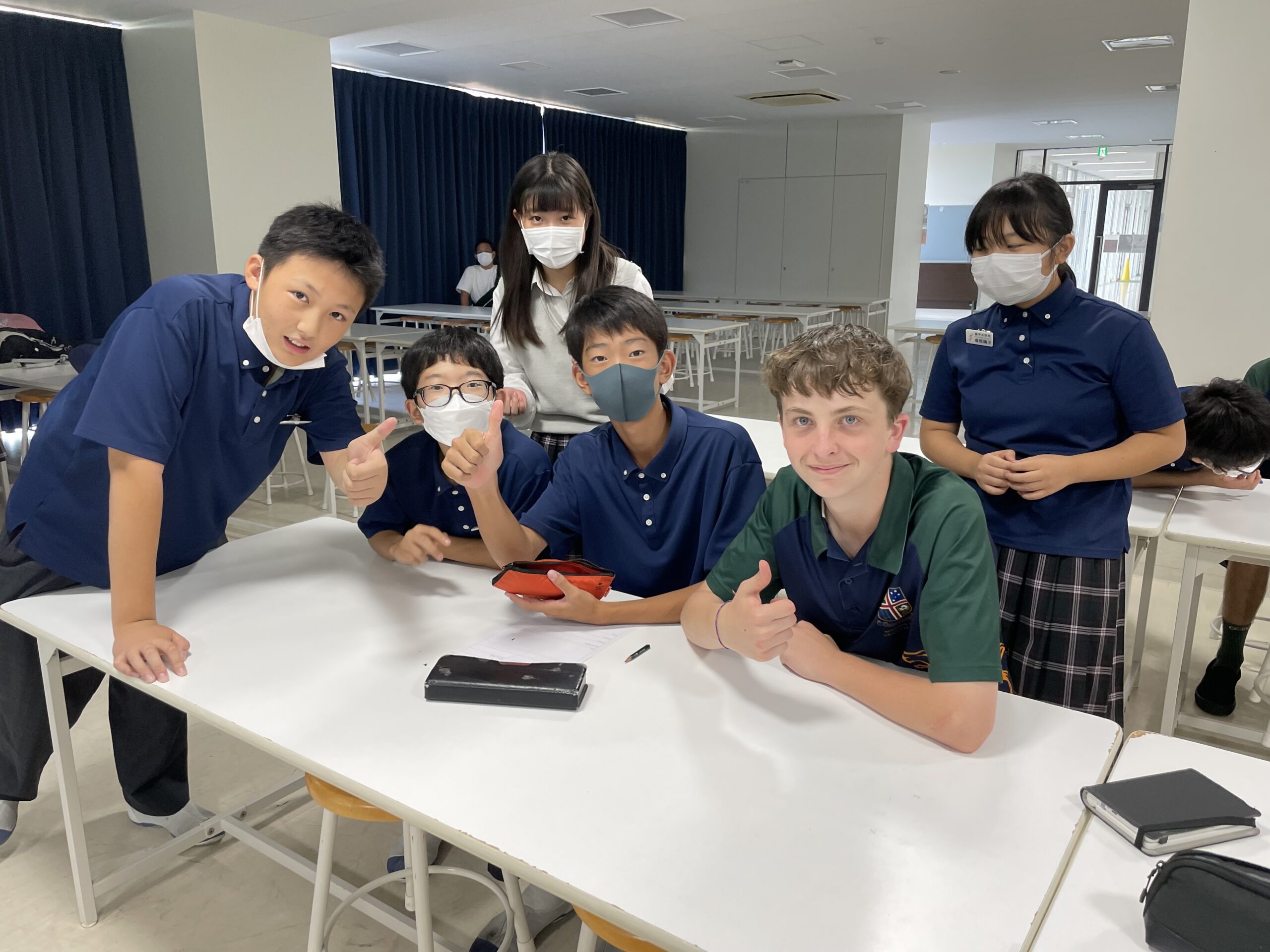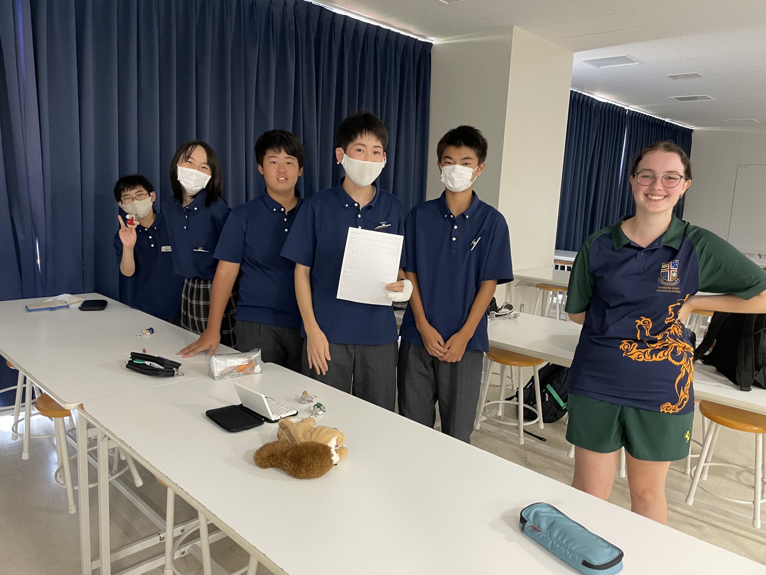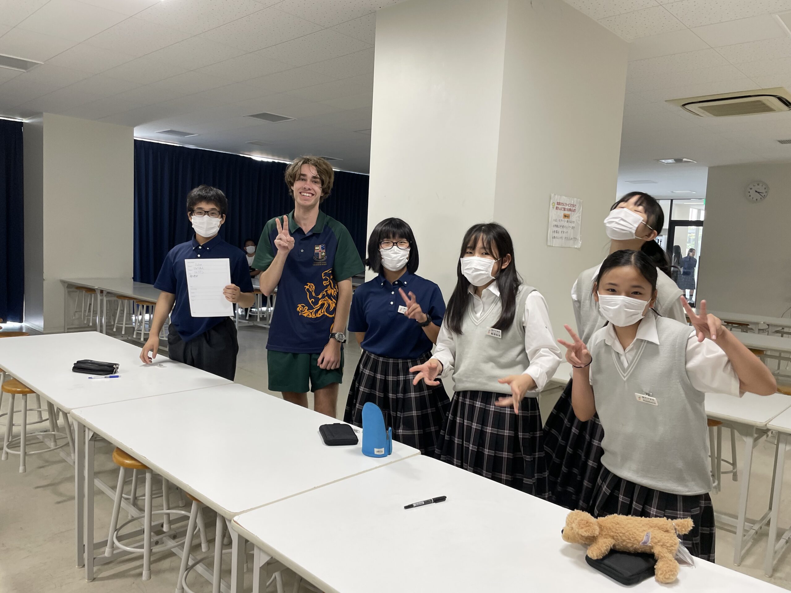 オーストラリアの姉妹校の一つ であるサンシャインコースト・グラマースクールの生徒を招いて、中学1年生で特別授業をしました。中1ですが限られた力でも「どうにかして」伝えることが何よりも大事。英語とジェスチャーなどを組み合わせることで伝わることは何倍にも増えます。最後に漢字の名前を考えてプレゼントしました。例えばアイビーさんに「愛美」、ゼインくんに「善印」、きちんと意味も説明しました。みんながとても気に入ってくれて、嬉しそうな笑顔が1年生にはきちんと伝わっていました。英語の学習はもちろん大事ですが、ジェスチャーや表情豊かに伝えることもコミュニケーションだということを体感することのできた1時間でした。
