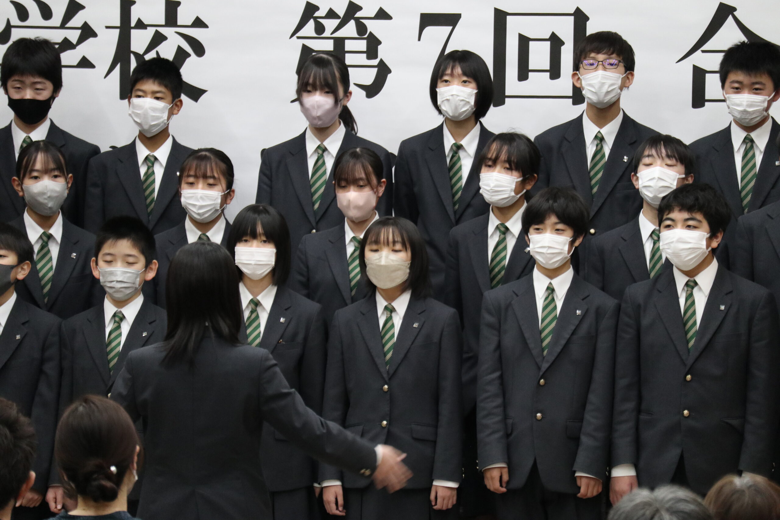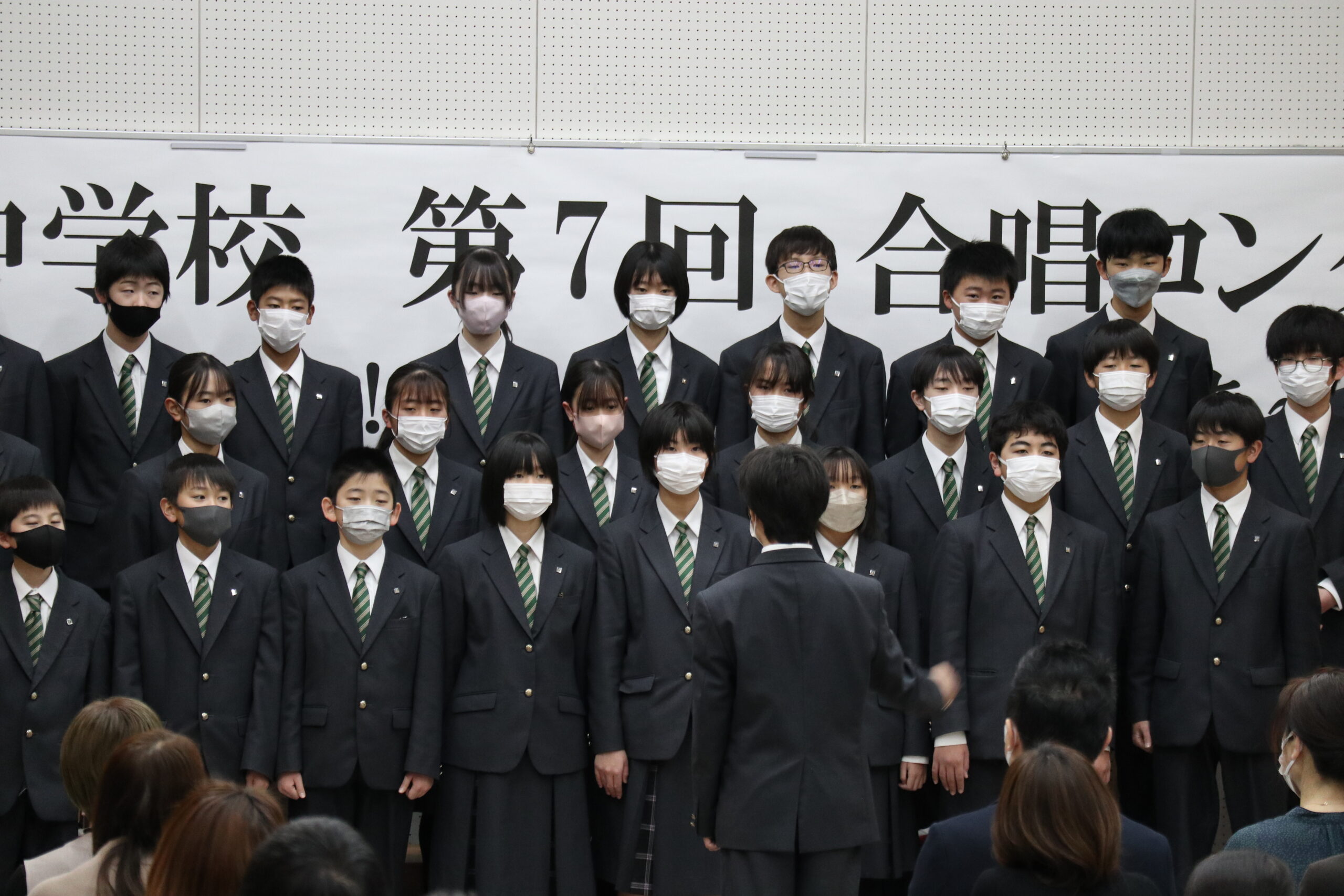 保護者、先生方が見守る中、課題曲「桜散る頃」自由曲「COSMOS」の2曲を、堂々と披露してくれた1年2組でした。