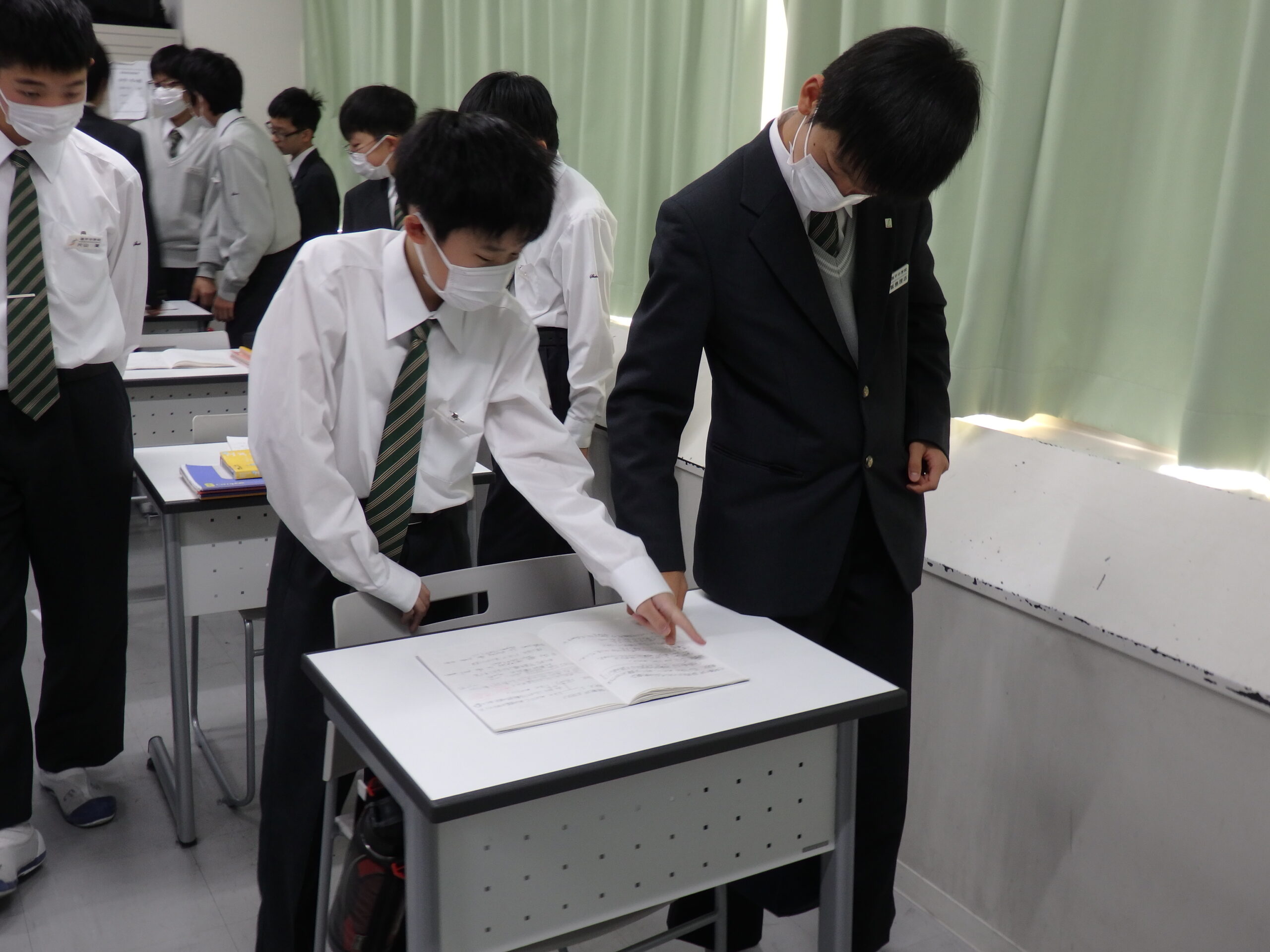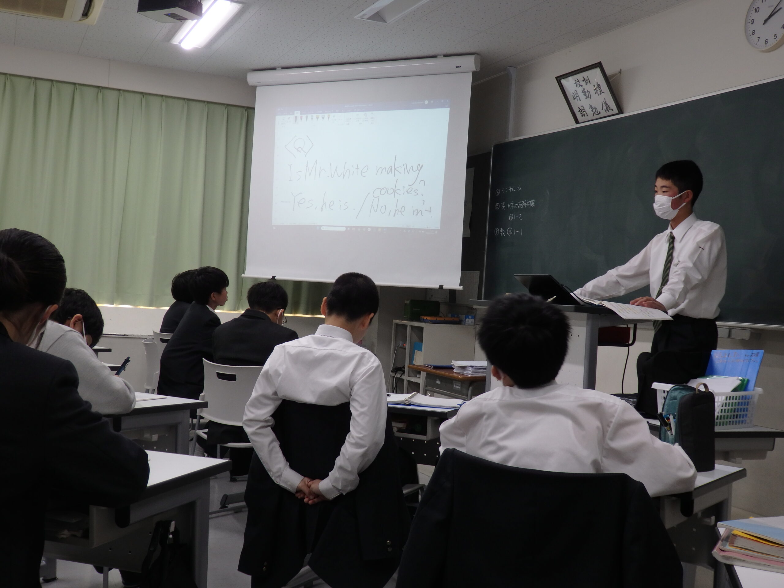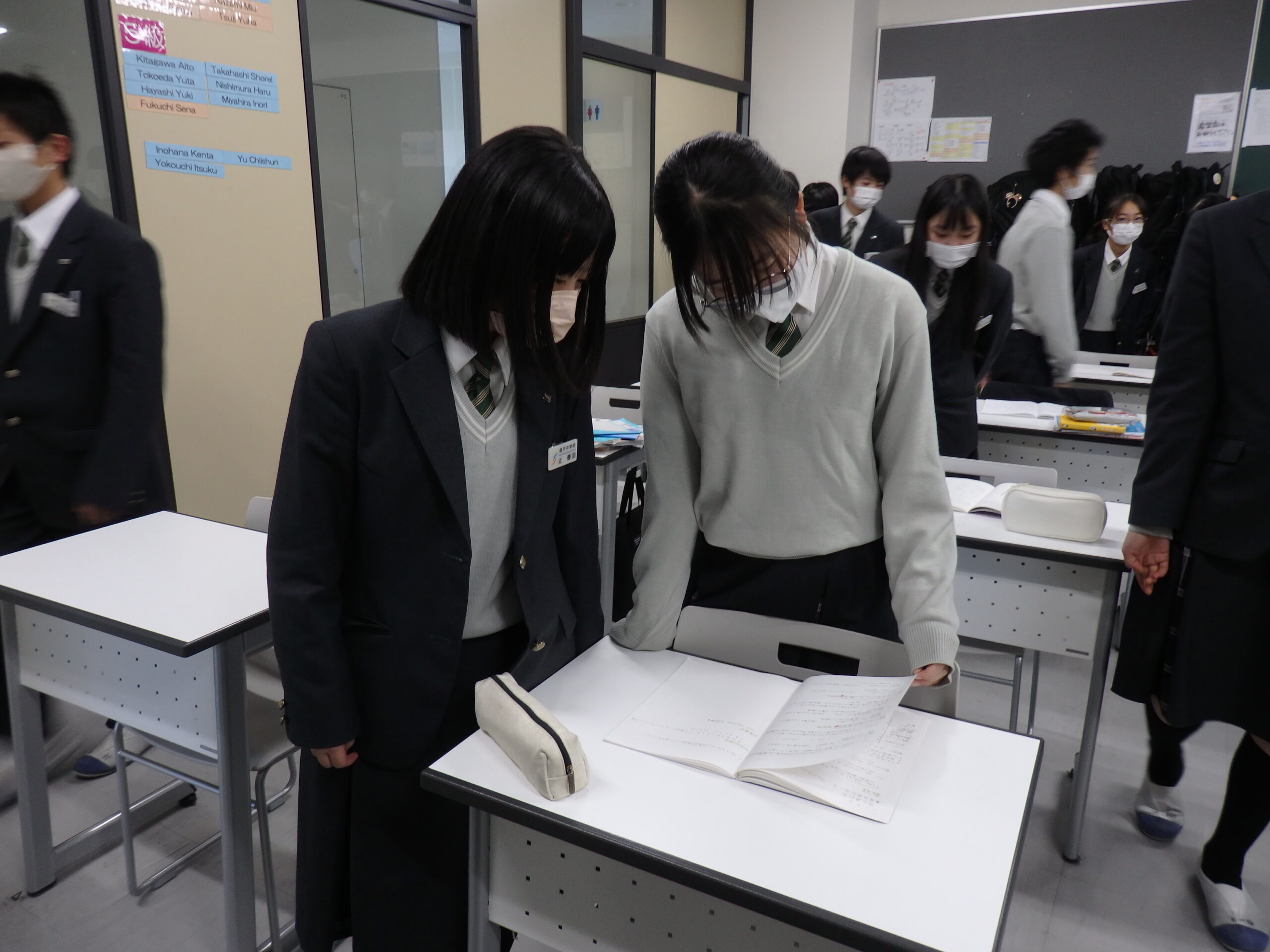 中学1年生の英語G(文法)の授業では、新しい単元に入るときにリサーチノート(予習ノート)にその単元を予習します。リサーチノートは全員で共有し、上手だと思うノートを3冊選んでサインをします。クラスメイトのサインがたくさん自分のノートに書いてあるとやる気が出ますね!予習なので難しいチャレンジではありますが、新しい文法をみんなに説明します。間違ってもクラスメイトが助けてくれます。お互いに助け合い英語の力を高めていきます。難しい壁にもチャレンジ精神を持って登っていく、入学から8か月、1年生は非常にたくましく成長しています!!