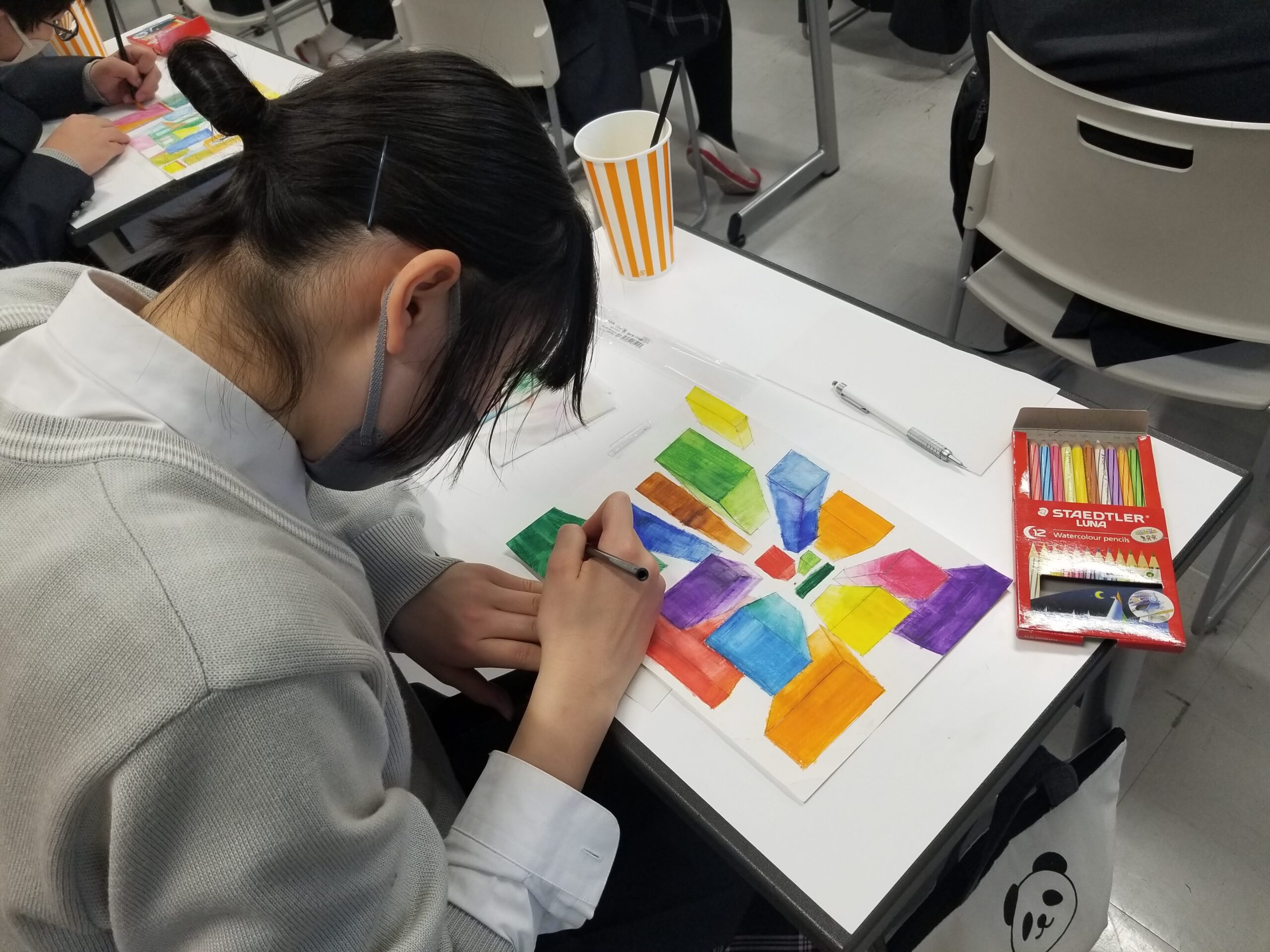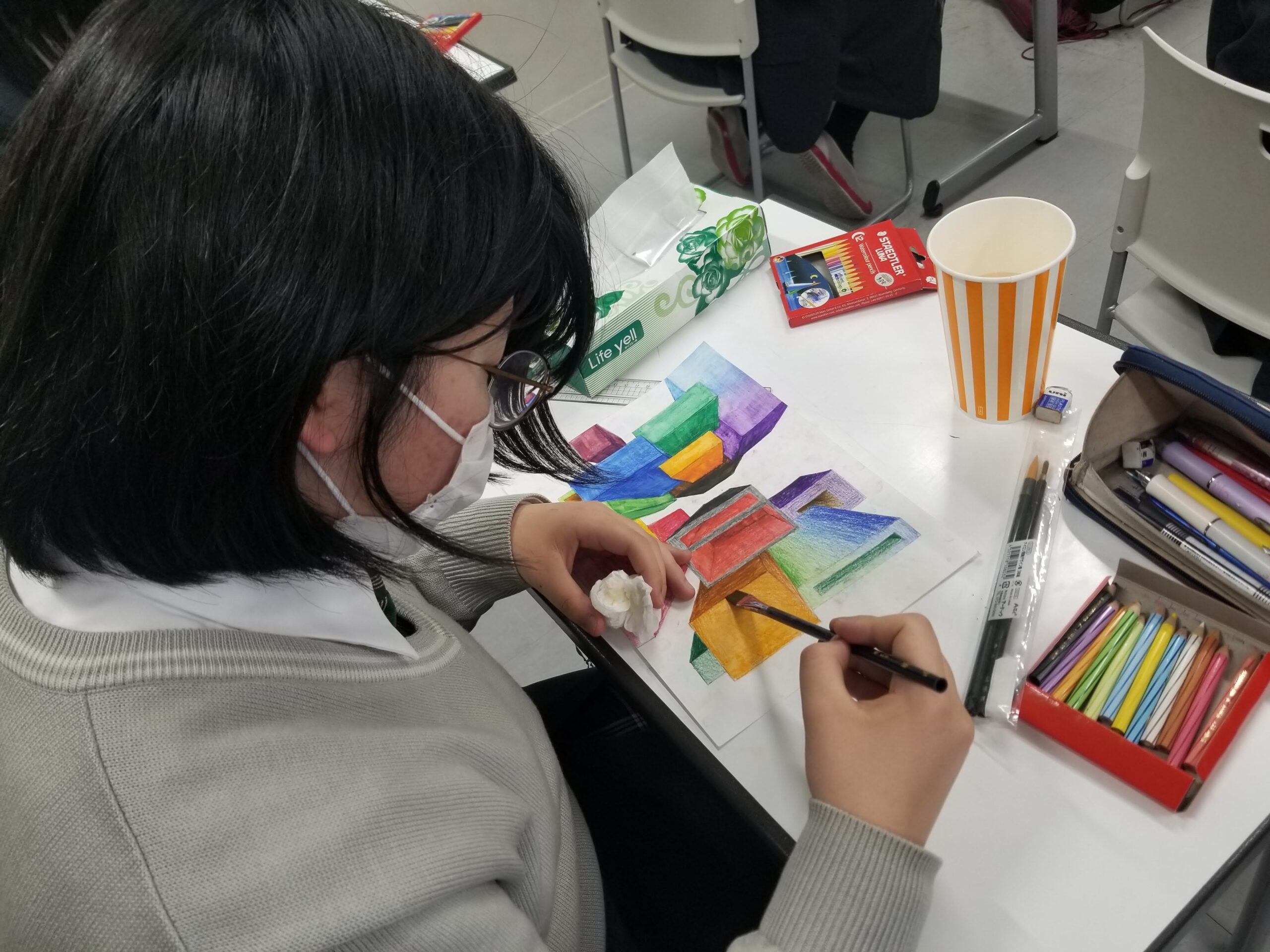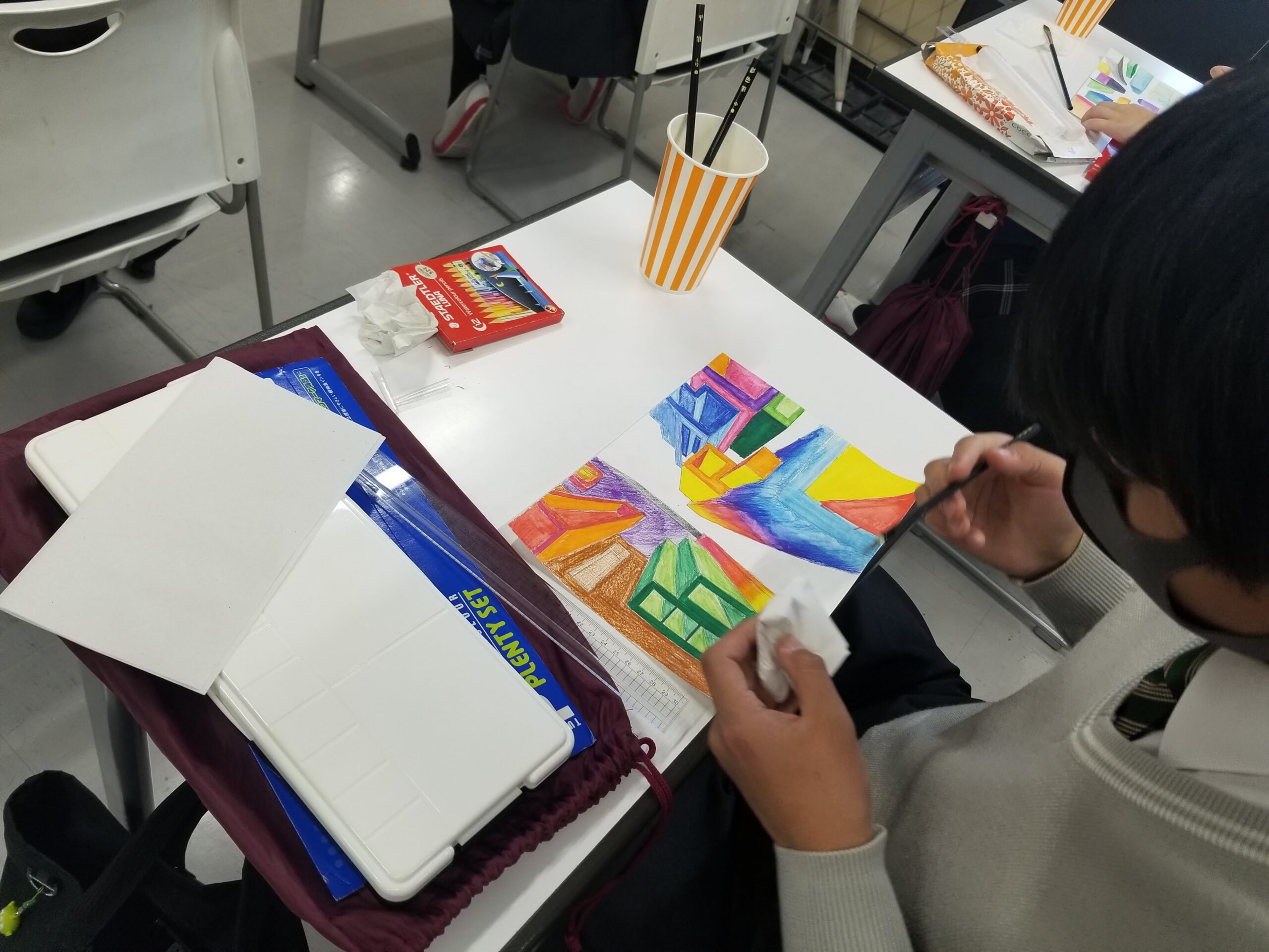 美術の授業では、透視図法を活用した遠近感の表現に挑戦しています。造形要素を駆使し、箱型を構成して空間を表現します。材料として水彩色鉛筆を使用し、透明技法による滲みやぼかしなどの技術も学んでいます。色の塗り方について、面の方向や形の前後感などが分かるようになり、技術の向上を感じることができました。