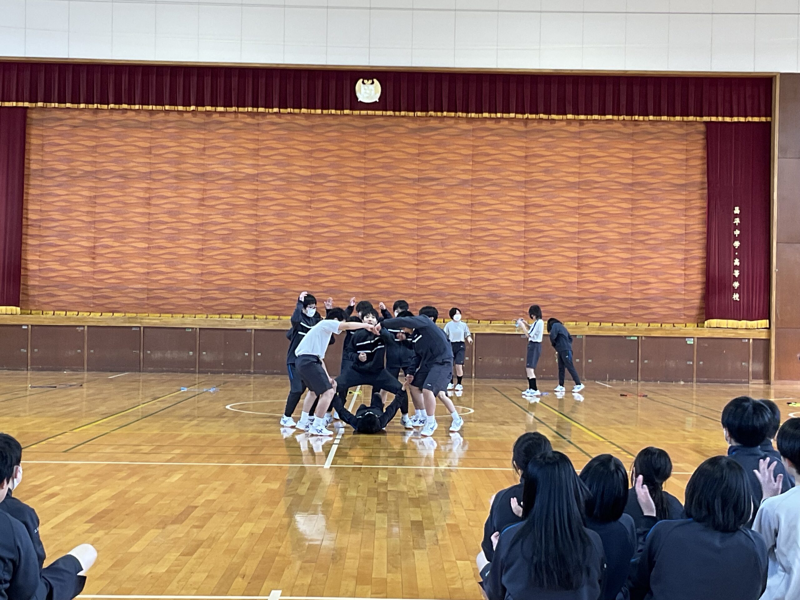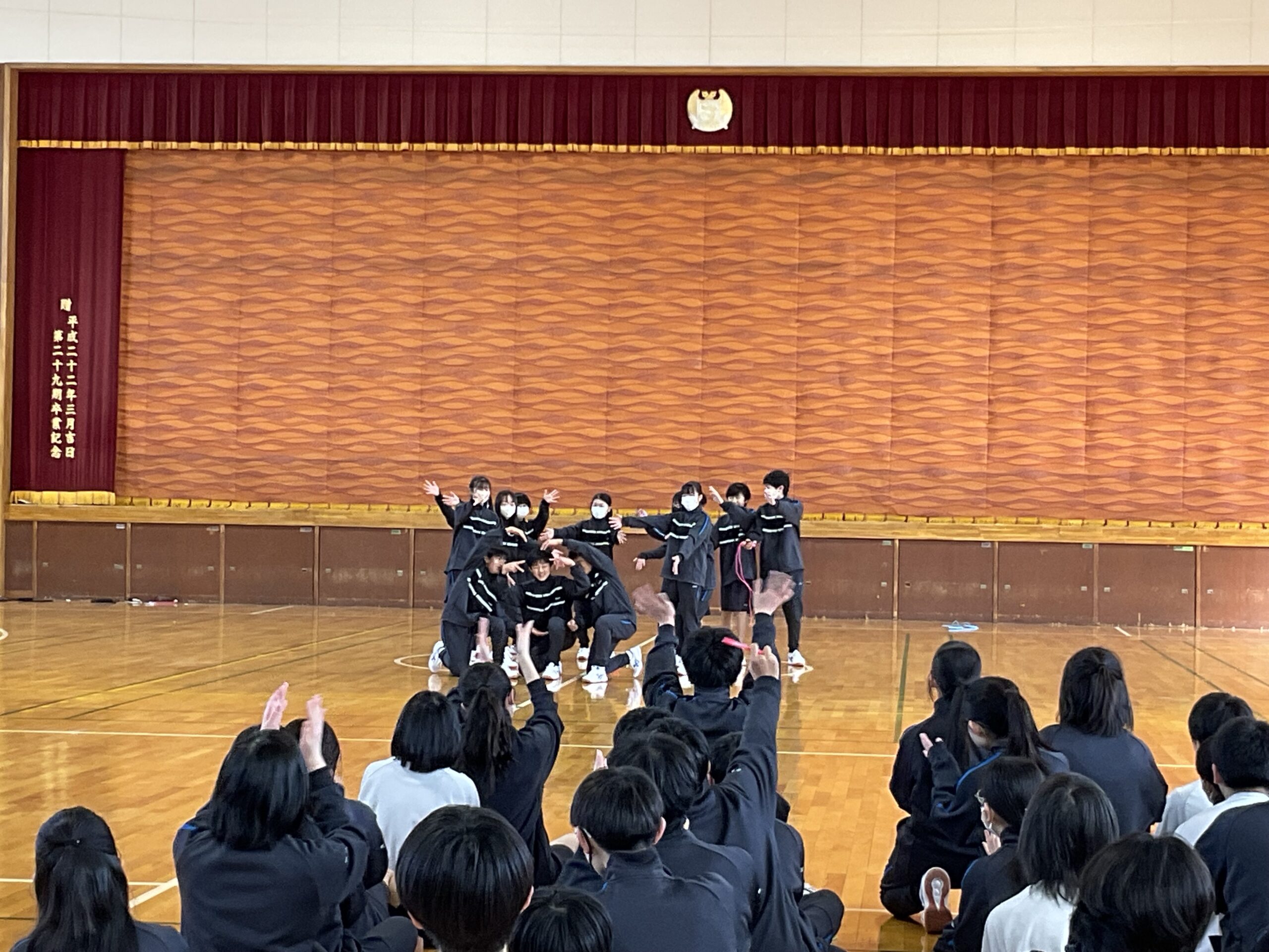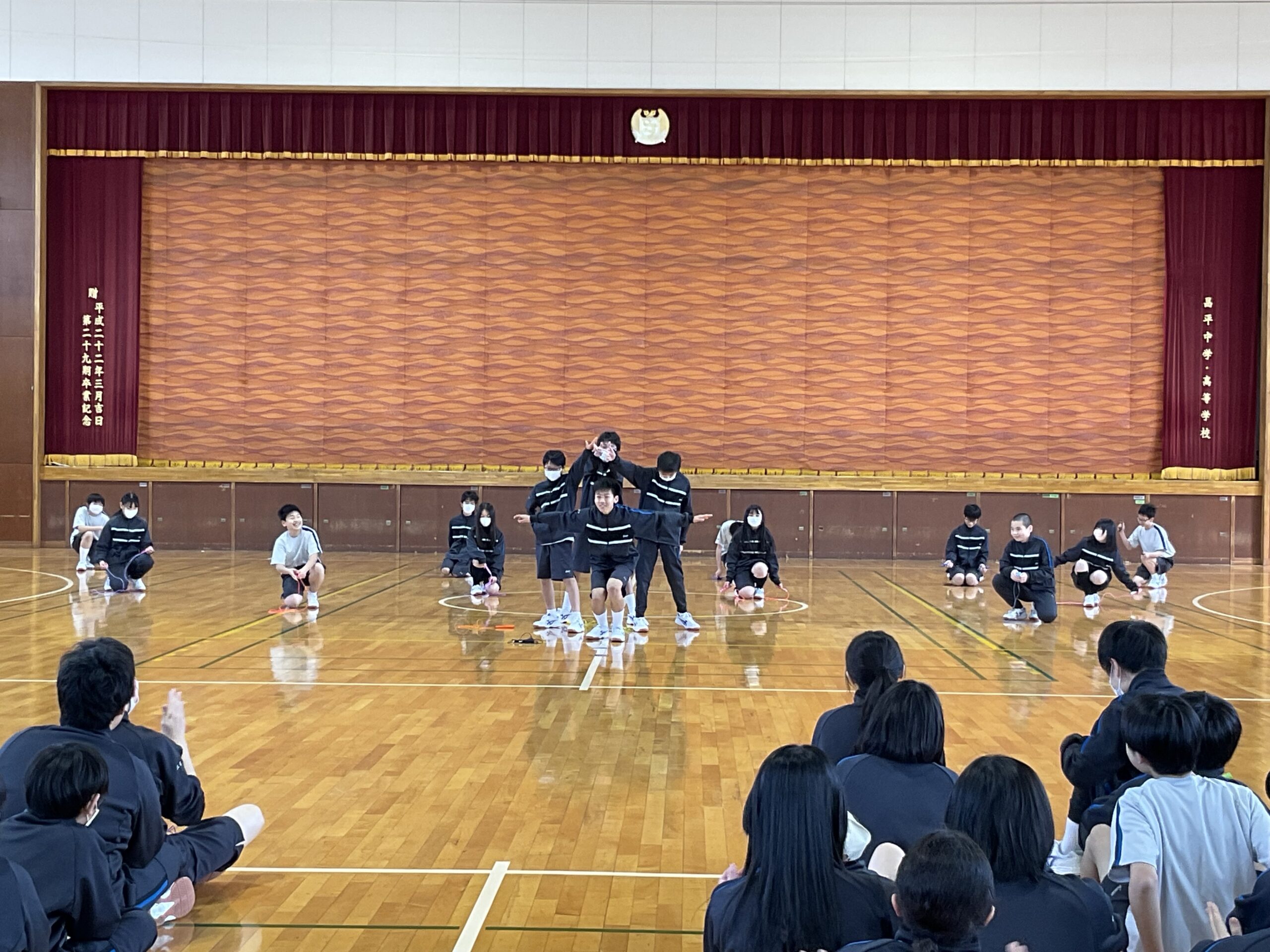 中学1年生がの体育の授業で、リズム縄跳びの発表会を行いました。1年生の各担任の先生方も応援に駆け付けたなか、各クラス2班に分かれ、課題曲のYOSOBIの「アイドル」に合わせて、様々な縄跳びの技とダンスを融合したパフォーマンスを披露しました。各クラスのカラーがよく出た発表になりました。各担任の先生方からはお褒めの言葉をいただき、ここまで全員で頑張ったという充実した表情で授業を終えることができました。