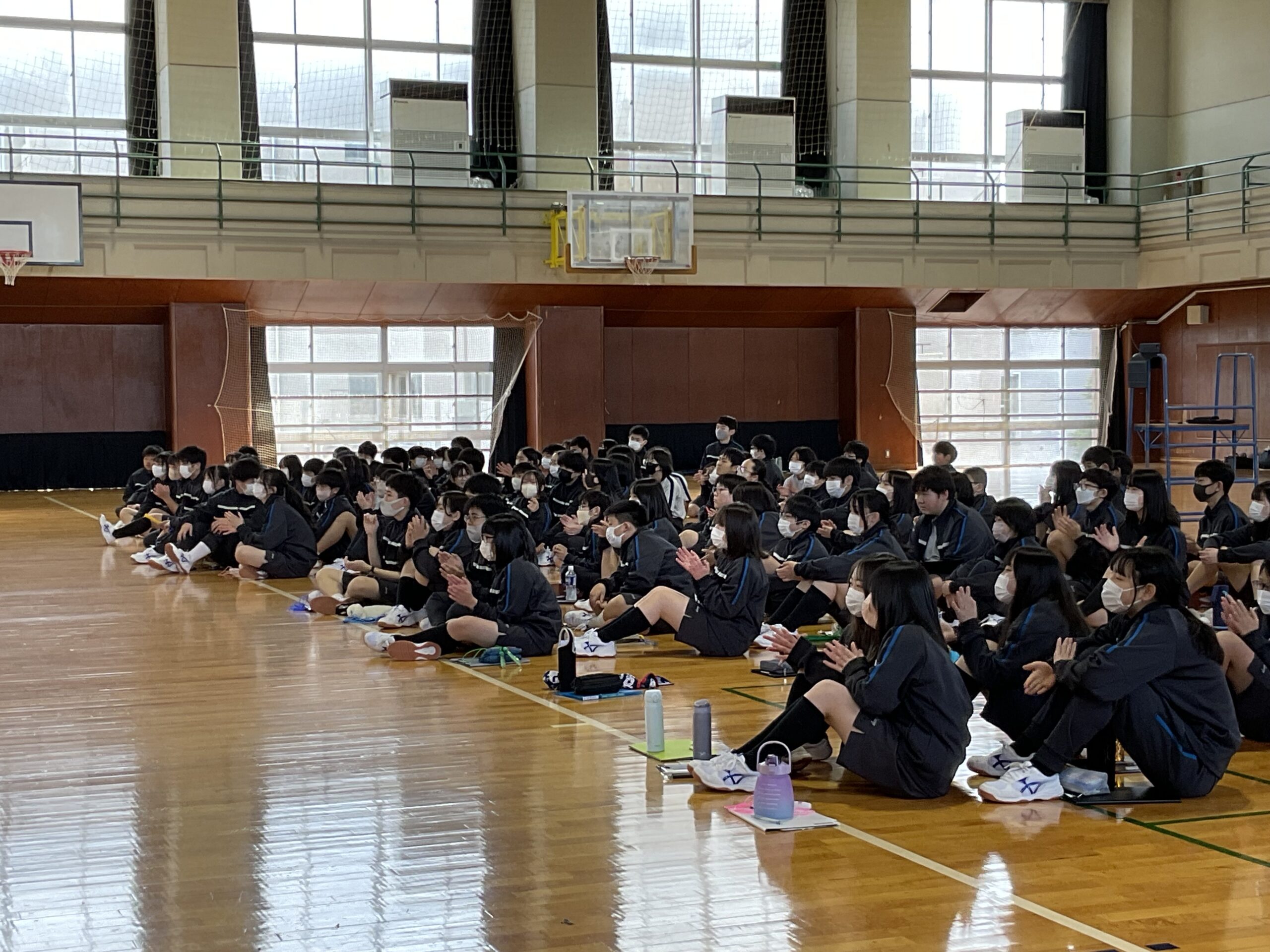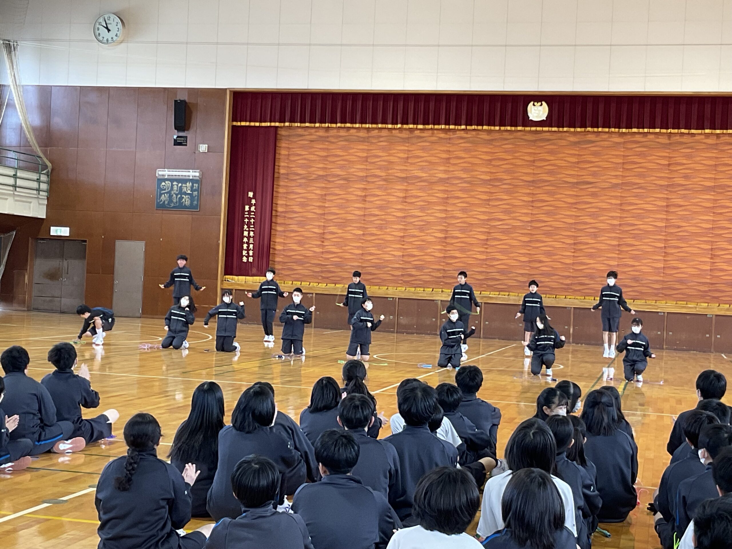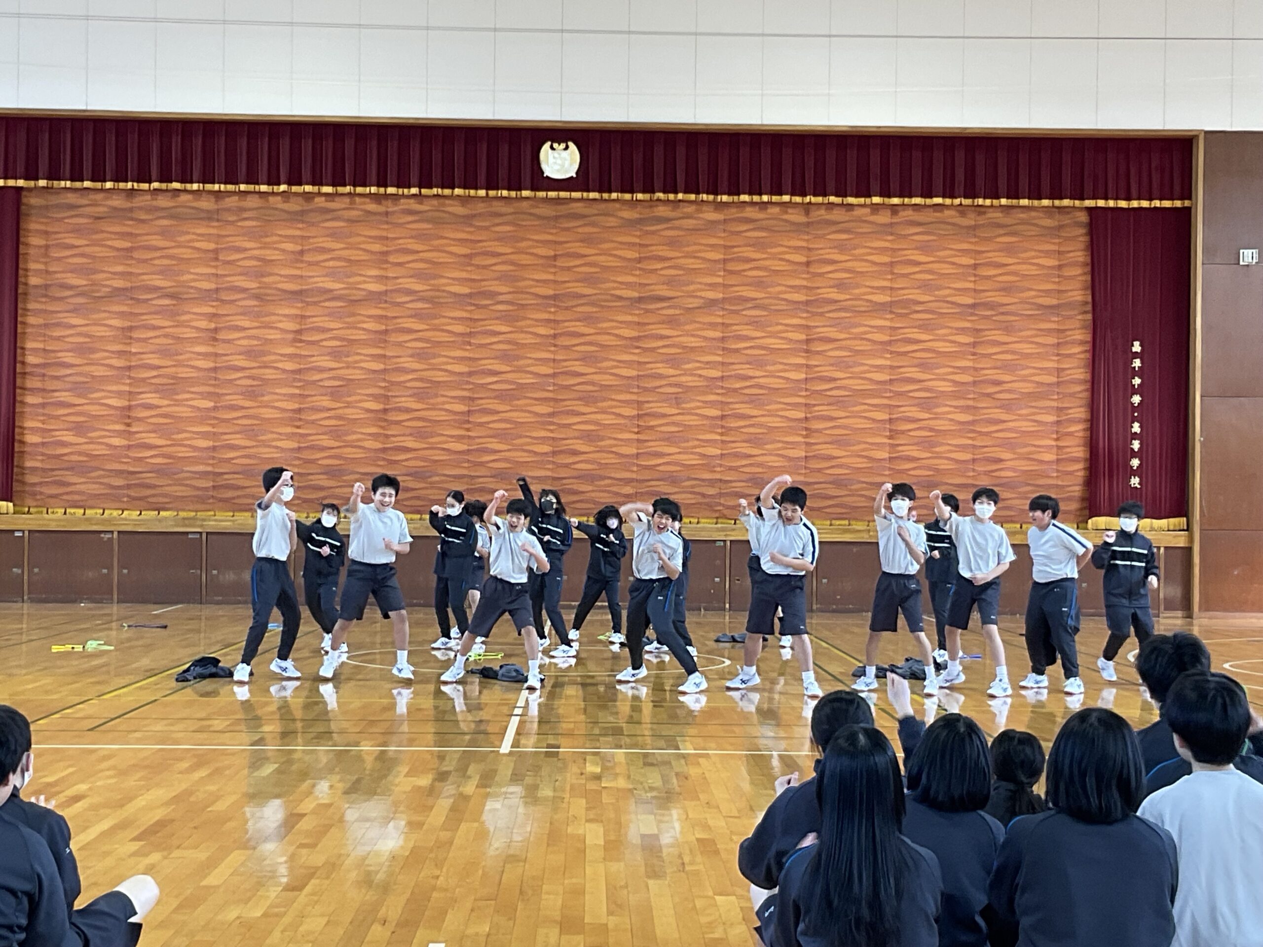 中学1年生がの体育の授業で、リズム縄跳びの発表会を行いました。1年生の各担任の先生方も応援に駆け付けたなか、各クラス2班に分かれ、課題曲のYOSOBIの「アイドル」に合わせて、様々な縄跳びの技とダンスを融合したパフォーマンスを披露しました。各クラスのカラーがよく出た発表になりました。各担任の先生方からはお褒めの言葉をいただき、ここまで全員で頑張ったという充実した表情で授業を終えることができました。