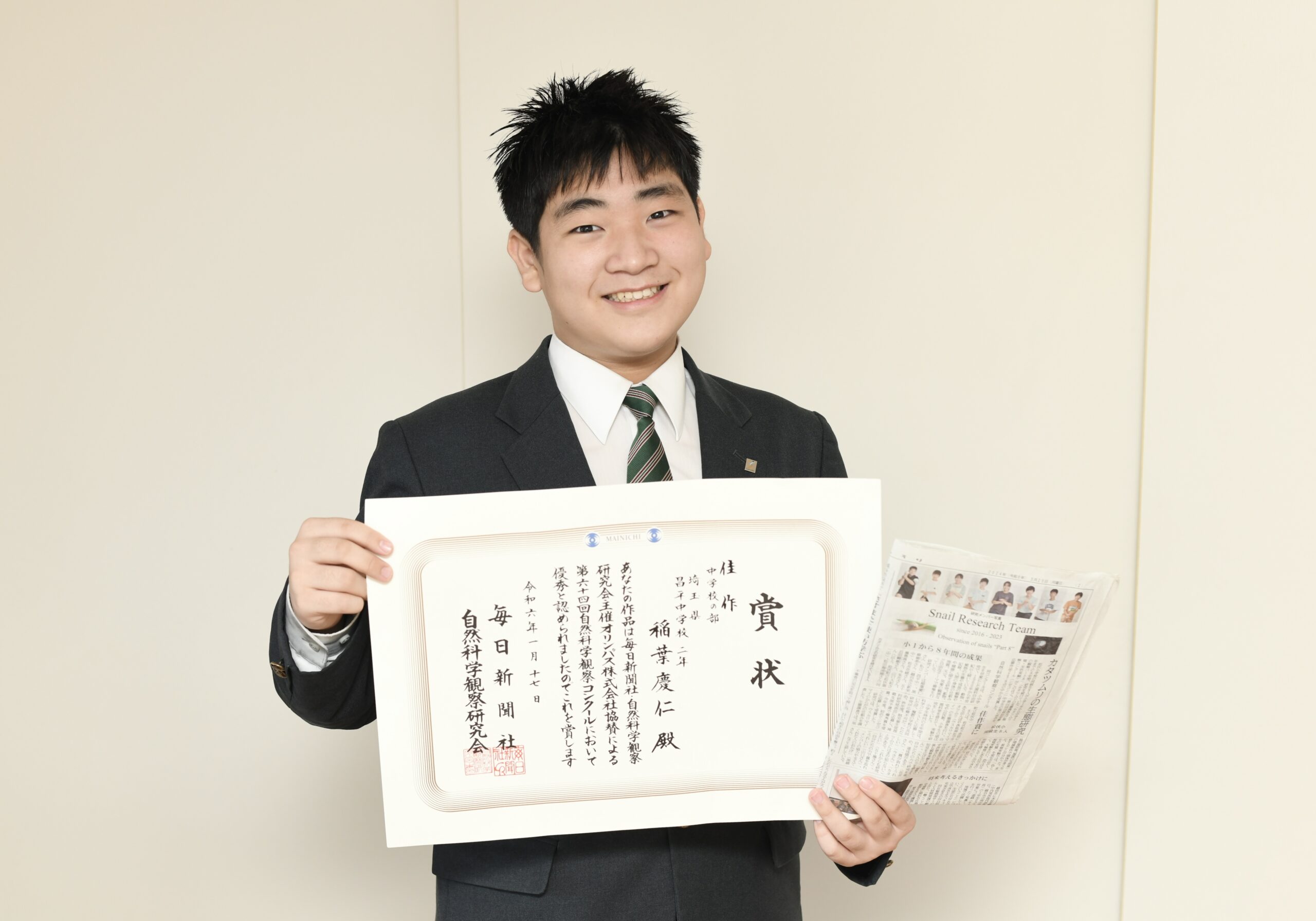 本校中学3年生の稲葉慶仁(いなばけいと)君の研究「カタツムリの観察-パート8」が第64回自然科学コンクールの佳作に入賞いたしました