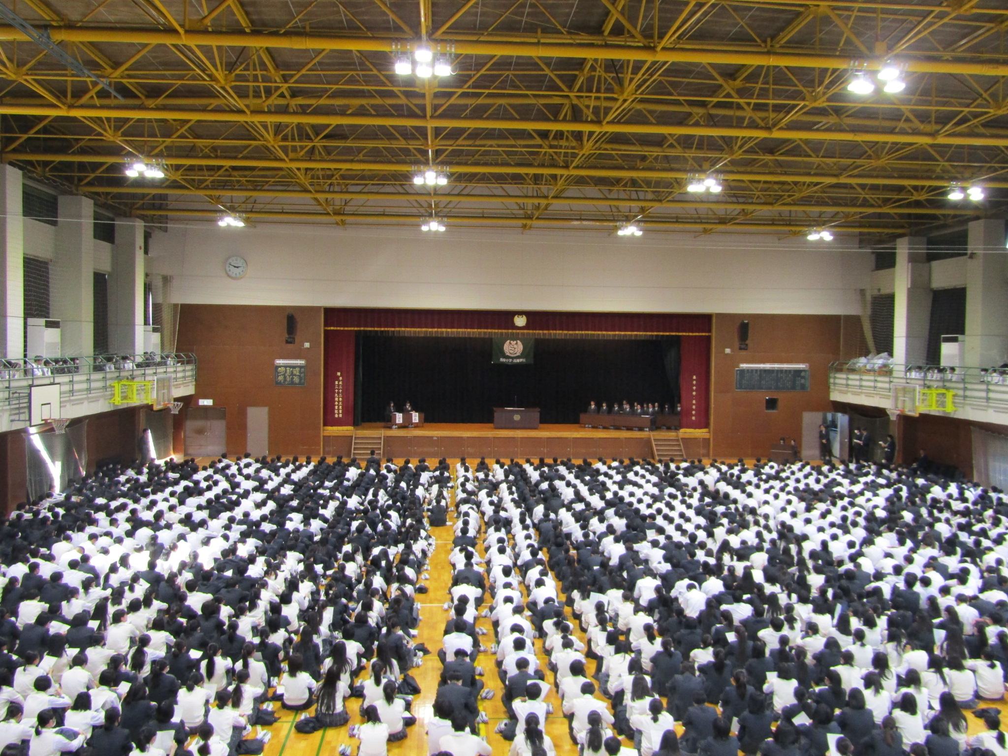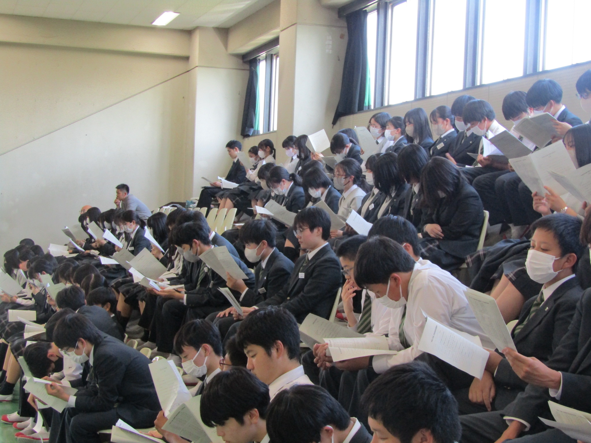 全校生徒が体育館に集まり、活動報告・決算報告等が行われ、生徒達は真剣に資料に目を通していました。