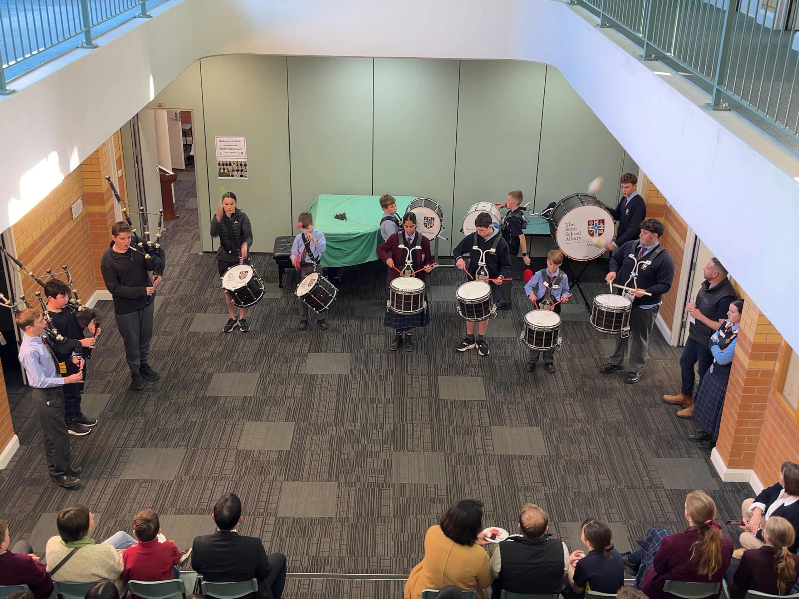 水曜朝の全校集会(Chapel)で公式な紹介と歓迎を受けると、午後のお茶会(Aussie Afternoon Tea)では、バグパイプとドラムの演奏(Pipe Band Session)を披露してもらいました。そしてもちろん(!?)、私たちはお返しに「昌平よさこい」を踊り、感謝の気持ちを表現しました。その後は、広大なフィールドでオージーフットボール(Aussie Football)を体験することに。元プロ選手のマックスコーチの手ほどきで、生徒は楕円球を巧みに操っていました。