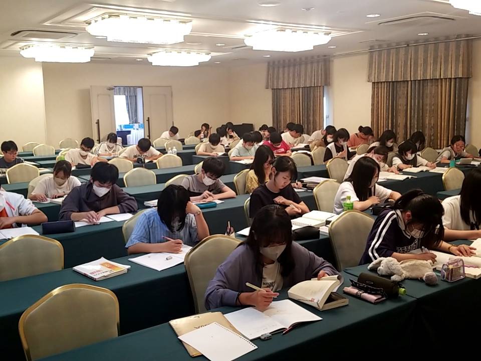 中学3年生(希望者)を対象に、本日から千葉県にありますインターナショナルリゾートホテル湯楽城にて学習合宿を実施しています。初日の今日は、開会式の後に習熟度別の授業を行い、さらに、自分で考えた学習メニューに集中して取り組みました。目標は、人生で一番勉強した3日間にすることです。積極的に質問する様子もあり、生徒はよく頑張りました。