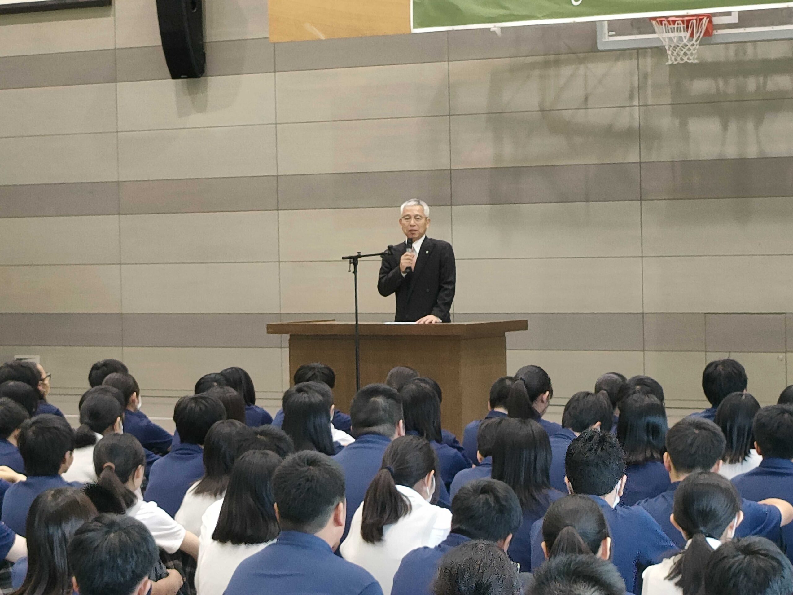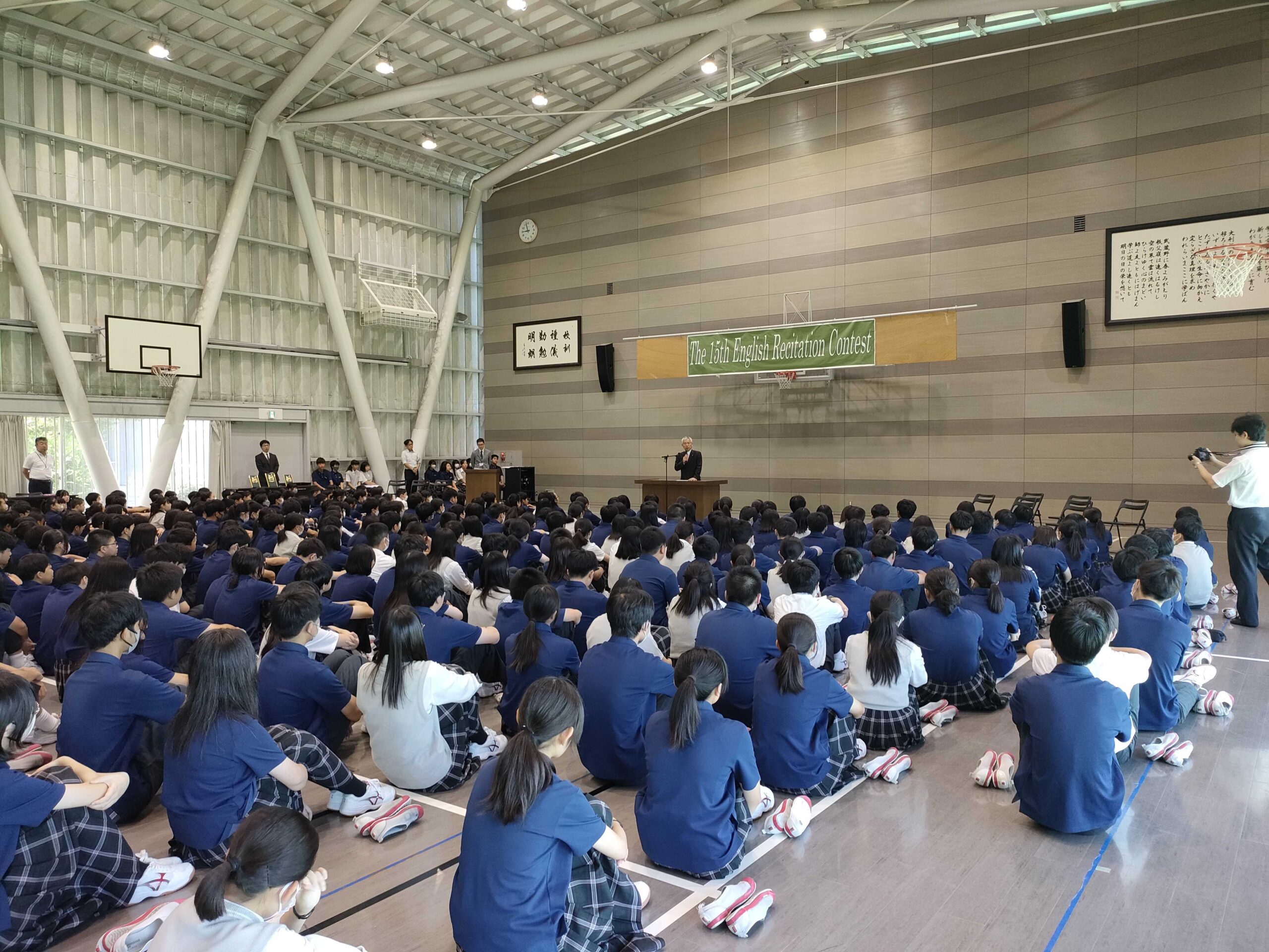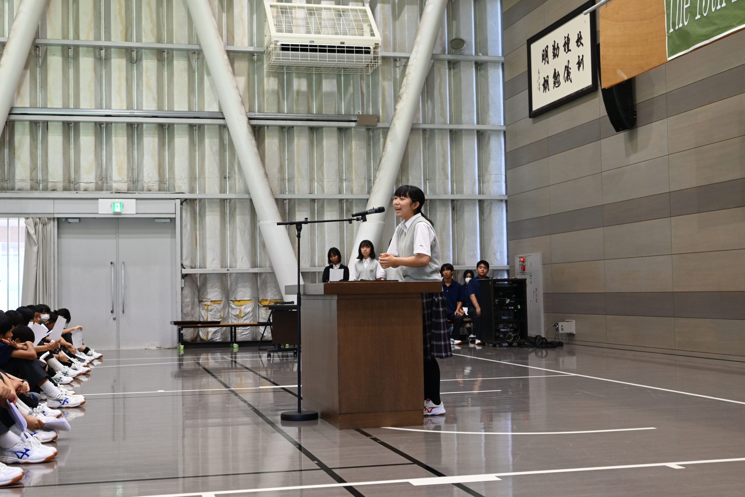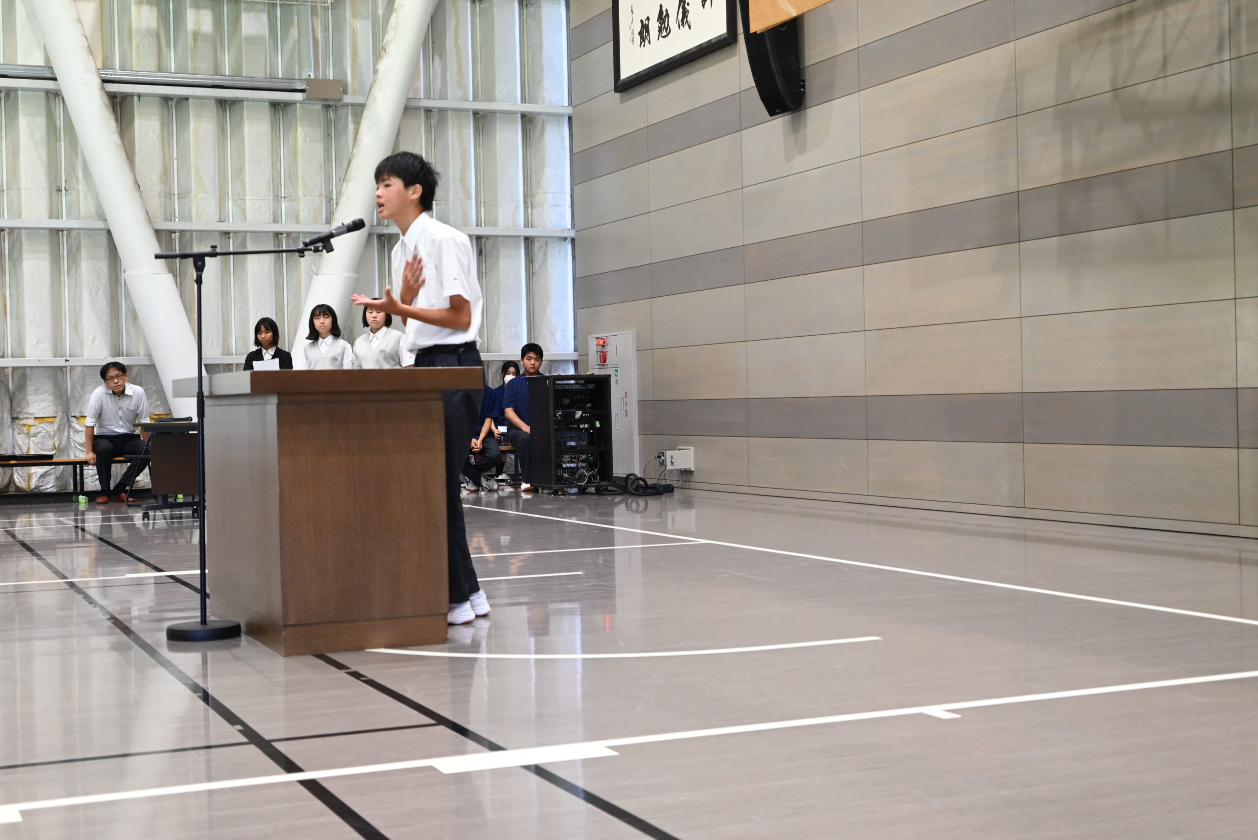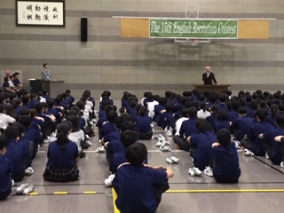 習慣であるホームルームクラスでの10分の朝読書の後は、サブアリーナ(体育館)での始業式、英語レシテーションコンテストと続きました。英語レシテーションコンテストには、一学期のクラス内選考、先週行われた予選を経て入賞した各学年2人の代表生徒6人が出場しました。出場者は堂々と、自分の解釈と想いをスピーチに込めて全校生徒の前で発表することができました。