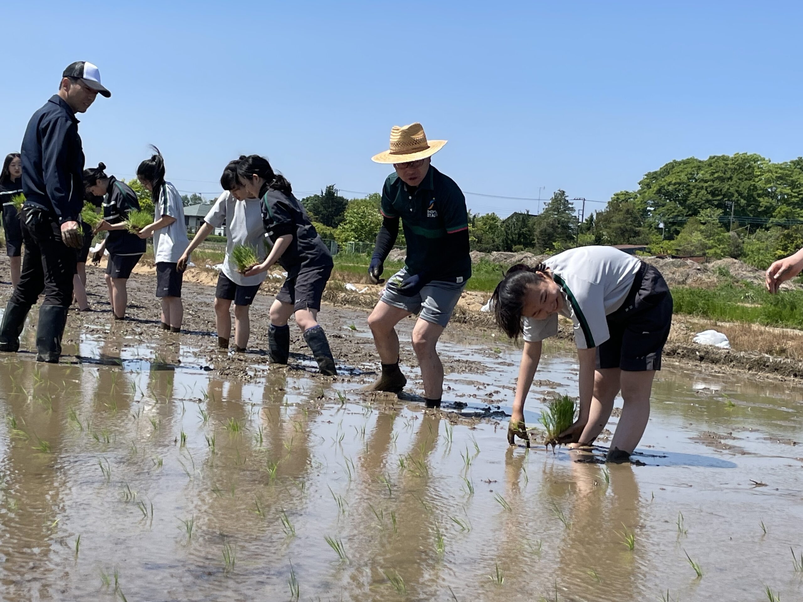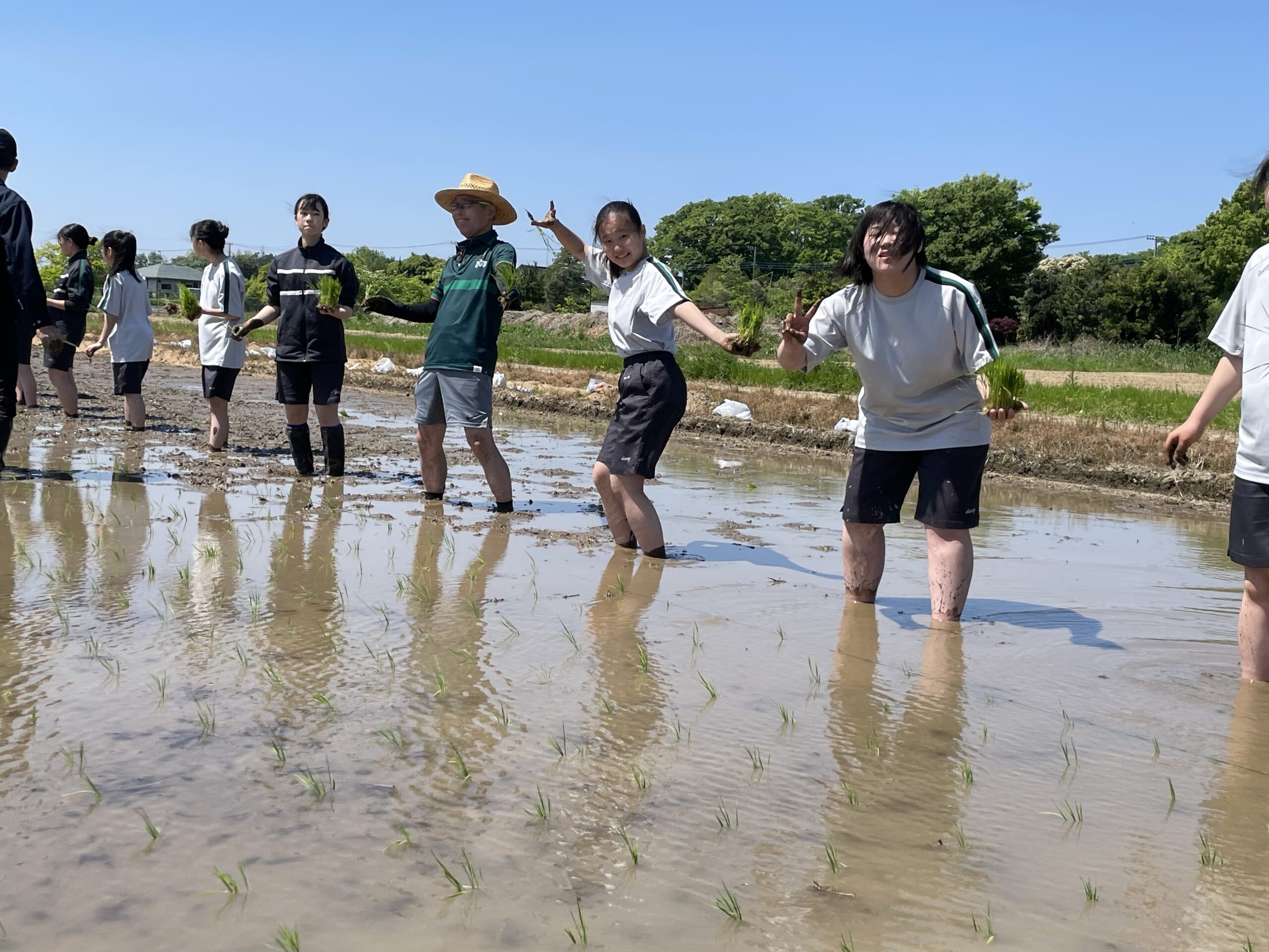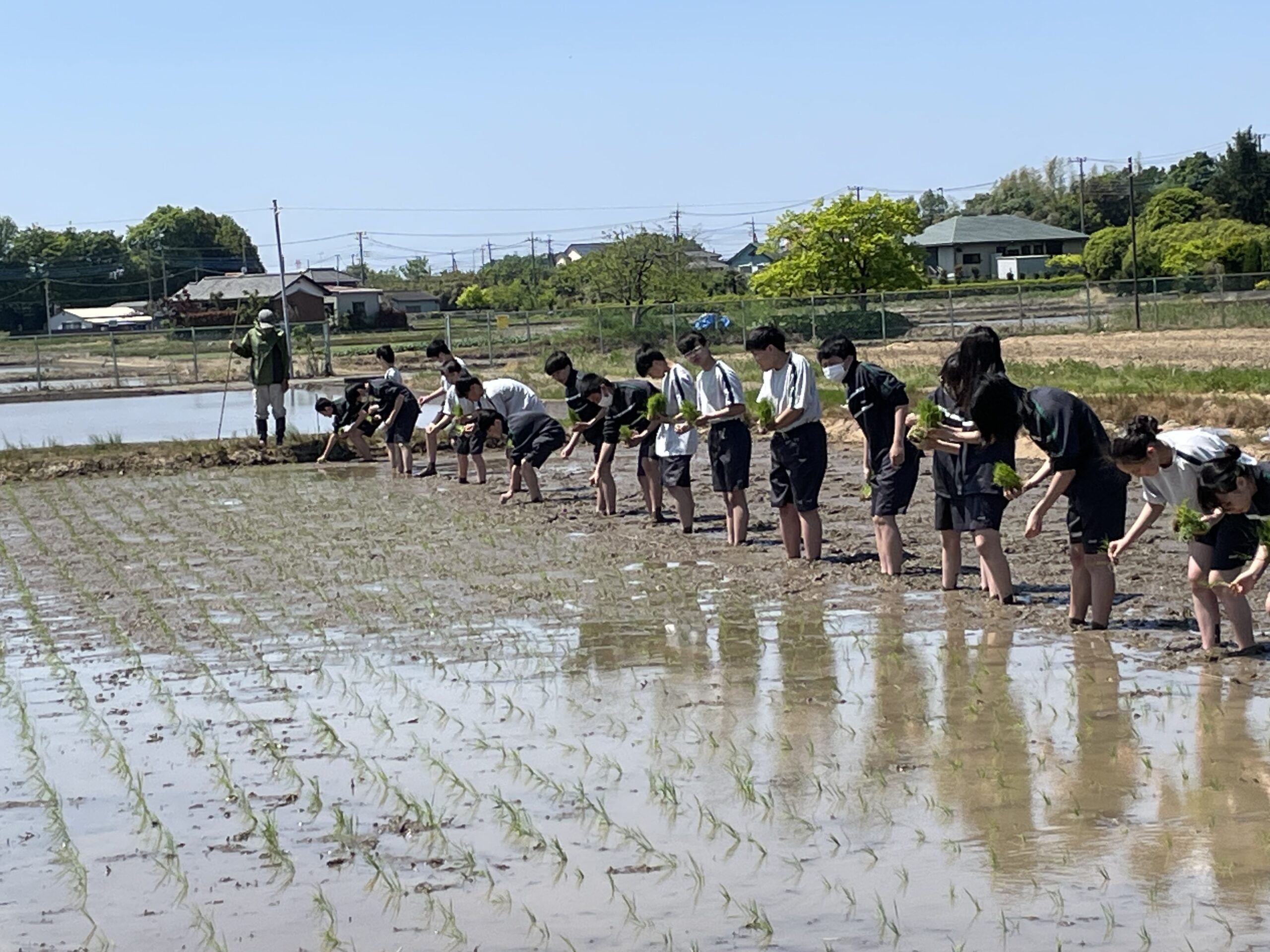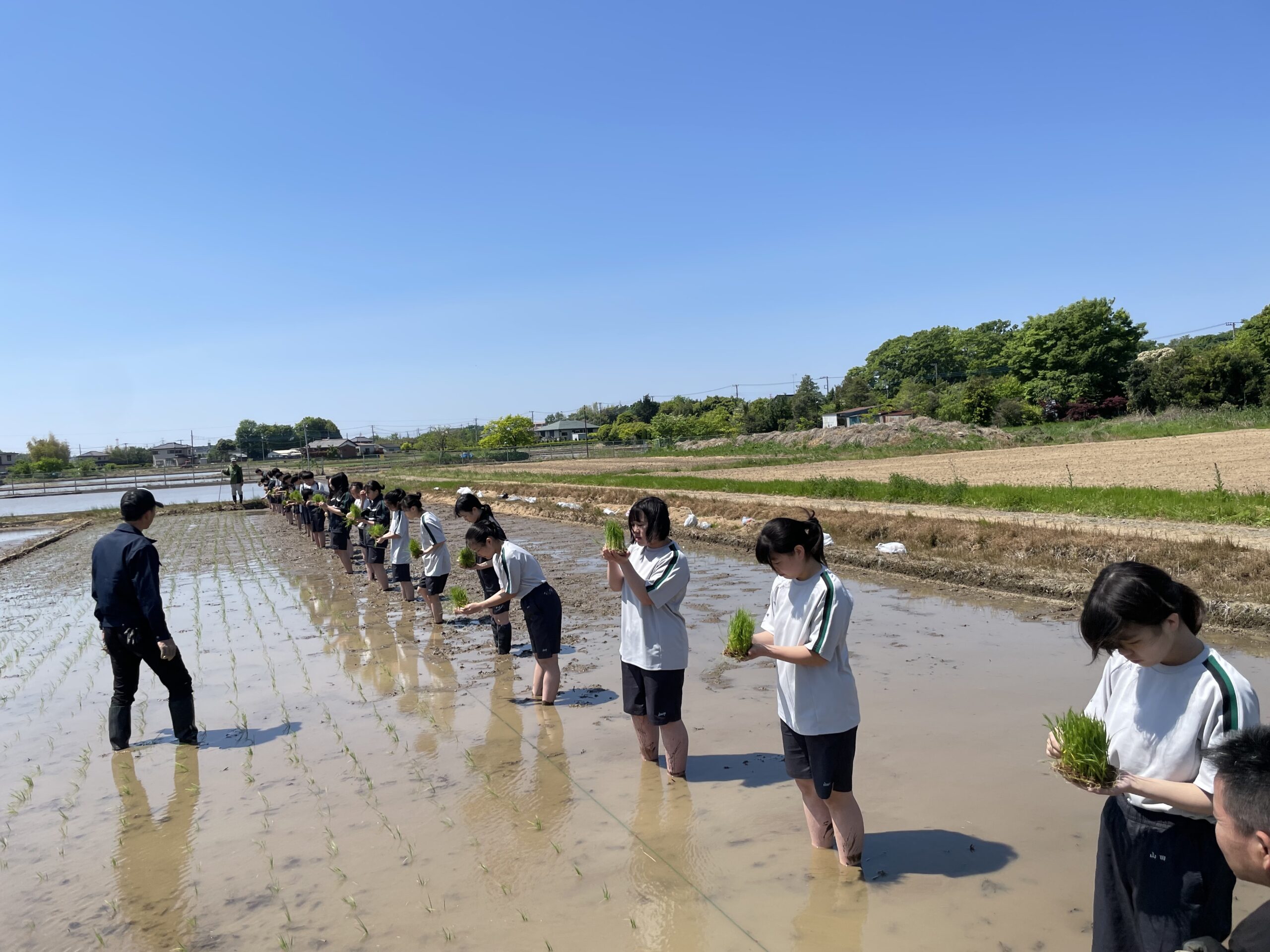 よく晴れ渡った本日、2年生が田植えを行ないました。裸足で水の張られた田んぼに足をつけ、3本くらいずつしっかりと泥の中に根を入れていきます。3本くらいがお米が育って稲刈りをするときに片手でつかんで刈り取れる量だそうです。風に吹き飛ばされてしまいそうなこんなに小さく細い稲が、自分達の片手でつかめるくらい立派な稲穂になると思うと秋が楽しみですね。田んぼは通学路の途中にあるので、成長の過程が見られるのもうれしいですね。