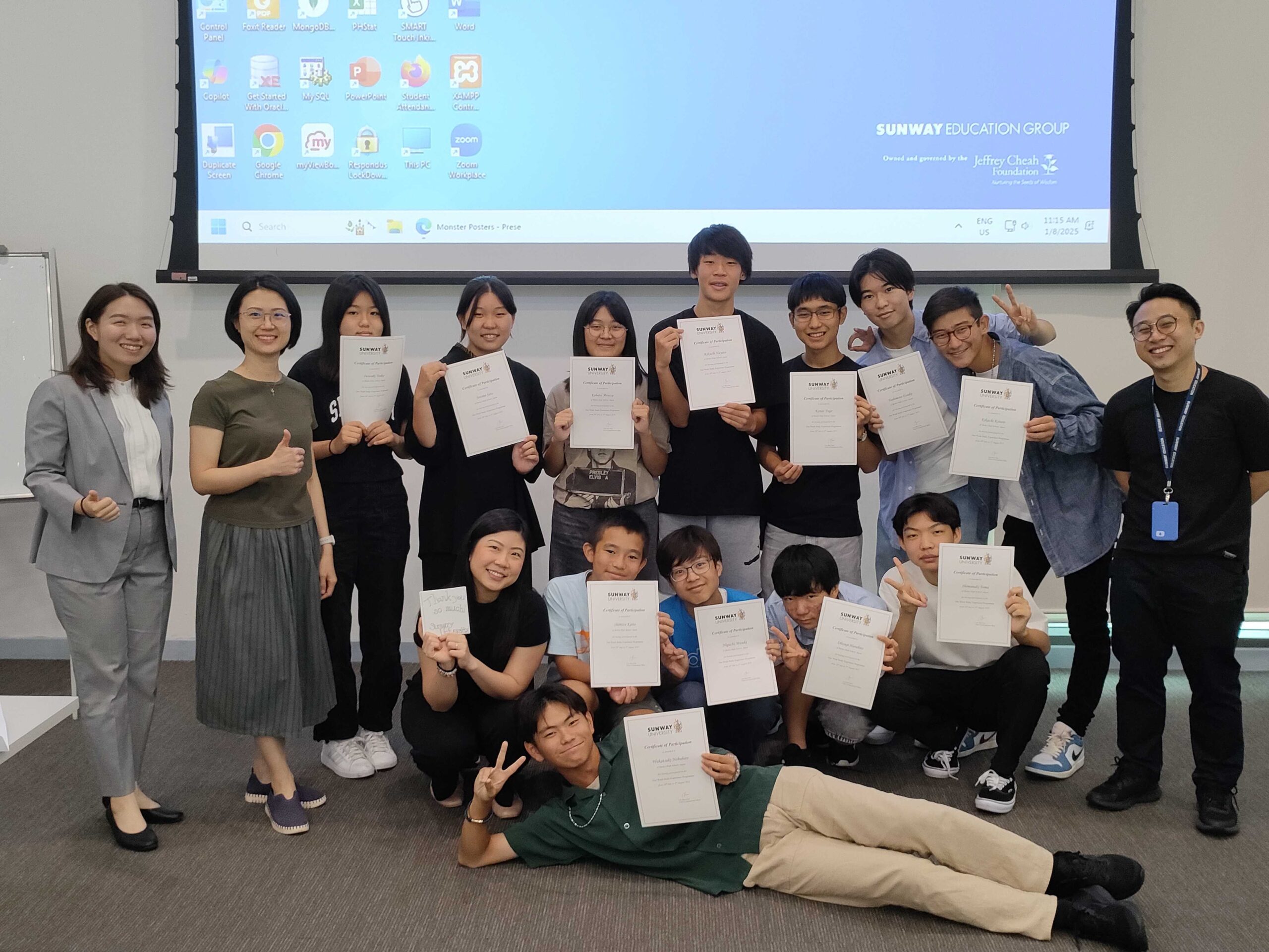 最後に、Day6は授業のフィナーレということもあり、生徒一人一人がお世話になったサンウェイ大学の教職員の方々を前に感謝の気持ちを込めたプレゼンテーションを行いました。発表では、自身のアート作品の紹介だけでなく、この研修を通じた学び・気づき・成長についても共有しました。そして何よりも、今回の研修プログラムはサンウェイ大学の方々の協力なくしては実現できませんでした…!生徒・引率教員一同御礼の気持ちを込めてメッセージカードを作り、お渡ししました。記念写真に写る生徒たちの表情が達成感に満ち溢れていて素敵ですね!!関係者の皆さん、本当にありがとうございました!We’ll be Back Soon!!