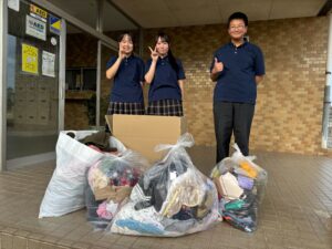私たちが活動している「“届けよう、服のチカラ”プロジェクト」では、杉戸町の全小学校や幼稚園、保育園、その他の地域の教育機関にもご協力いただいています。そのうちの一校、杉戸第二小学では約1か月間にわたり子ども服の回収にご協力いただきました。本日、地域宣伝回収課の生徒たちが学校を訪れ、回収していただいた服を受け取りました。