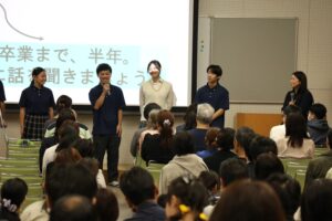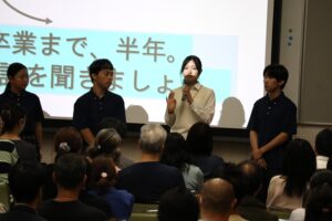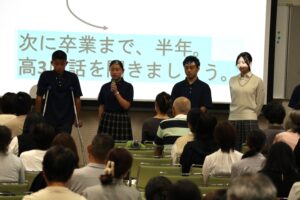 視聴覚ホール会場では、中学1年生(2名)と高校3年生(一貫クラス:3名)が登壇し、