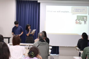 ランチルーム会場では、中学3年生(2名)が自作の英文原稿とスライドを駆使して