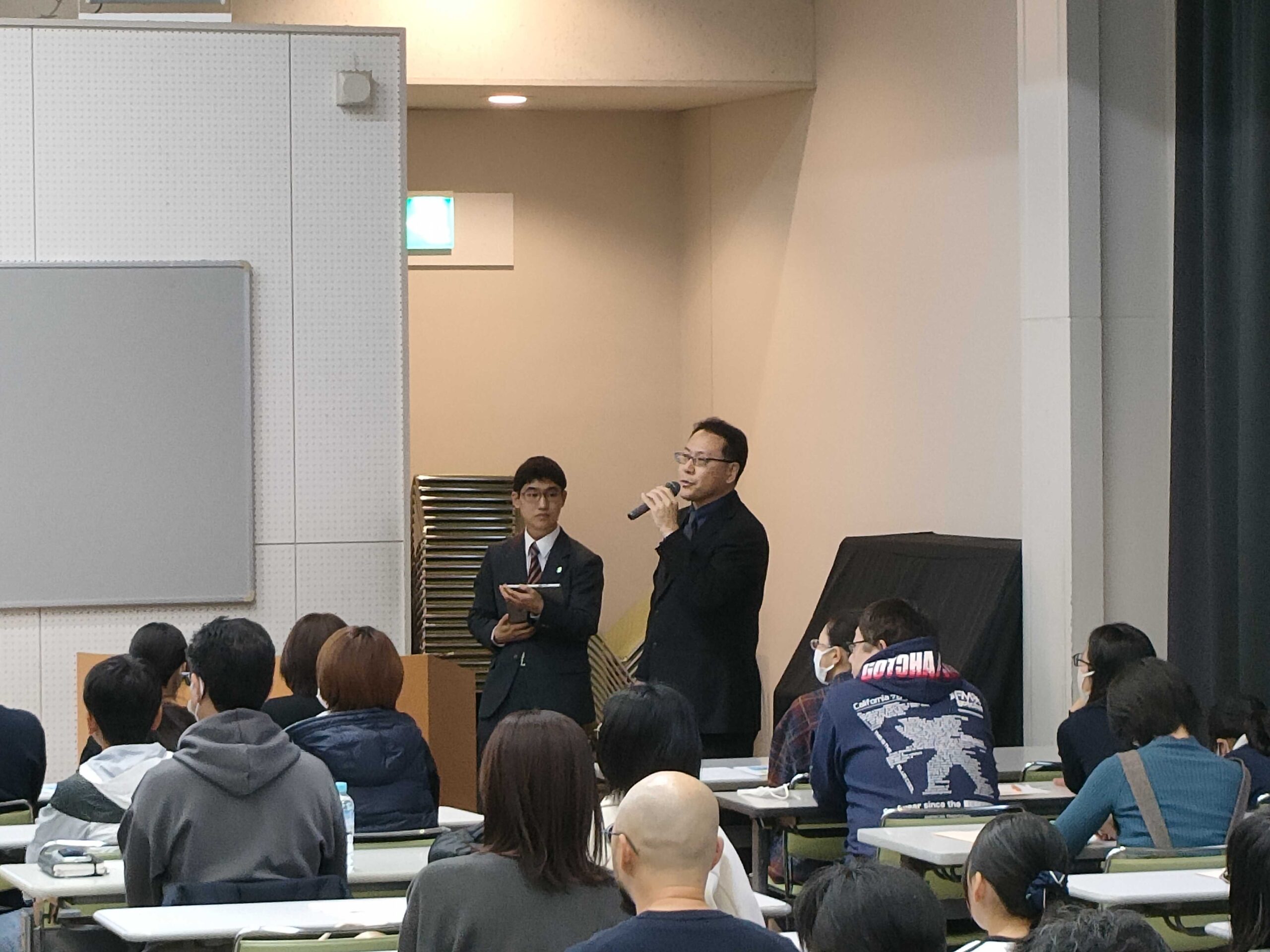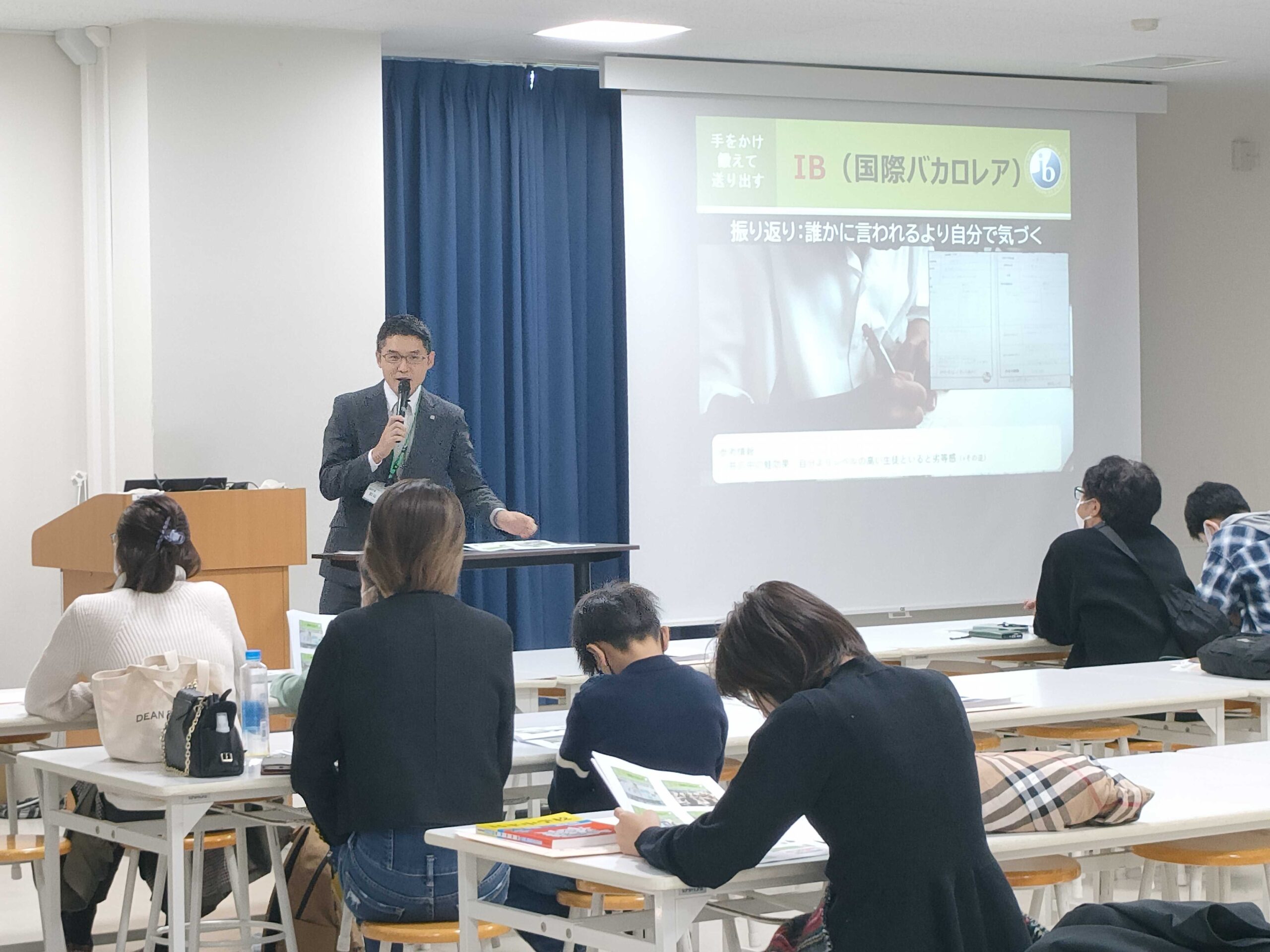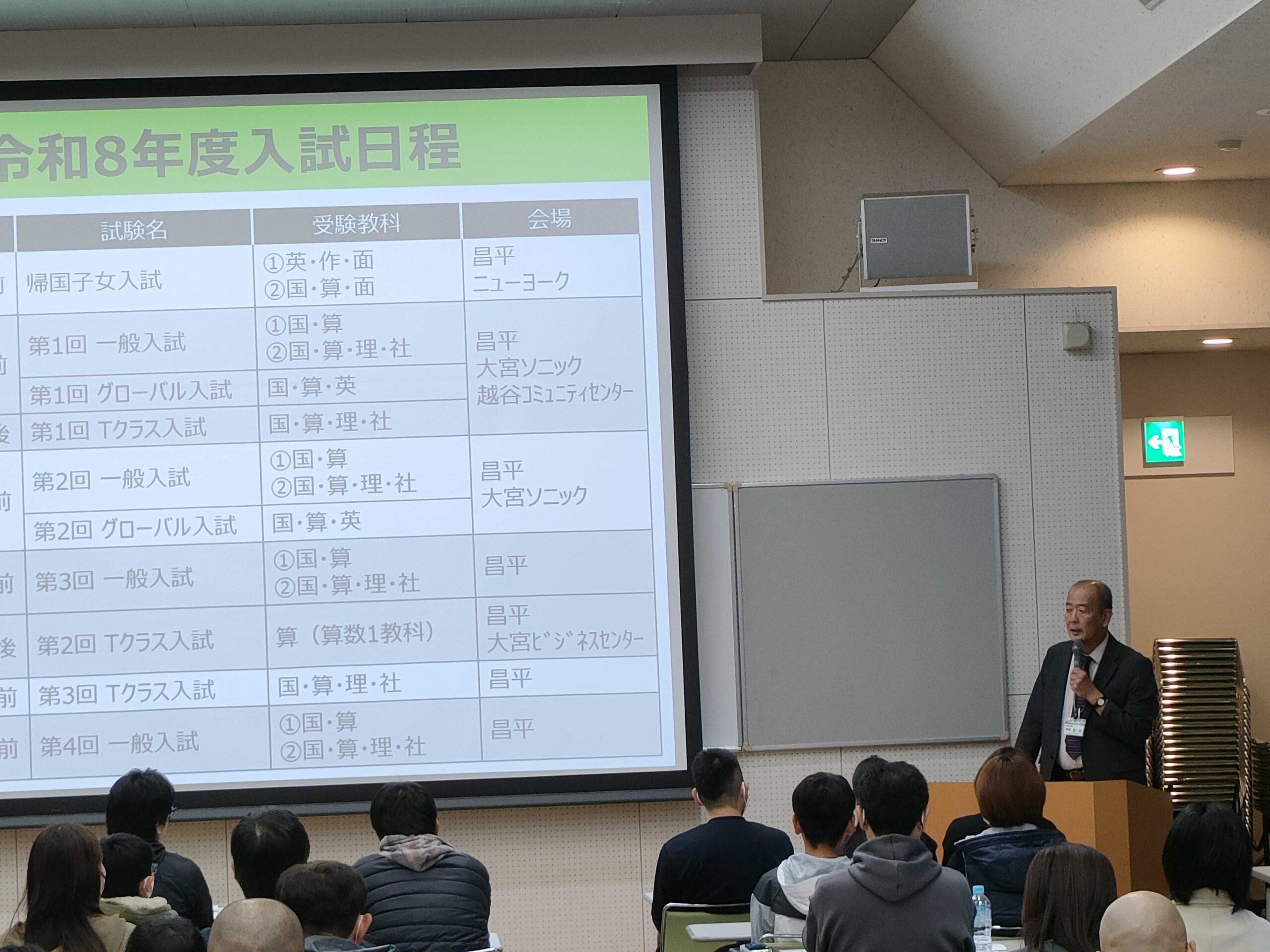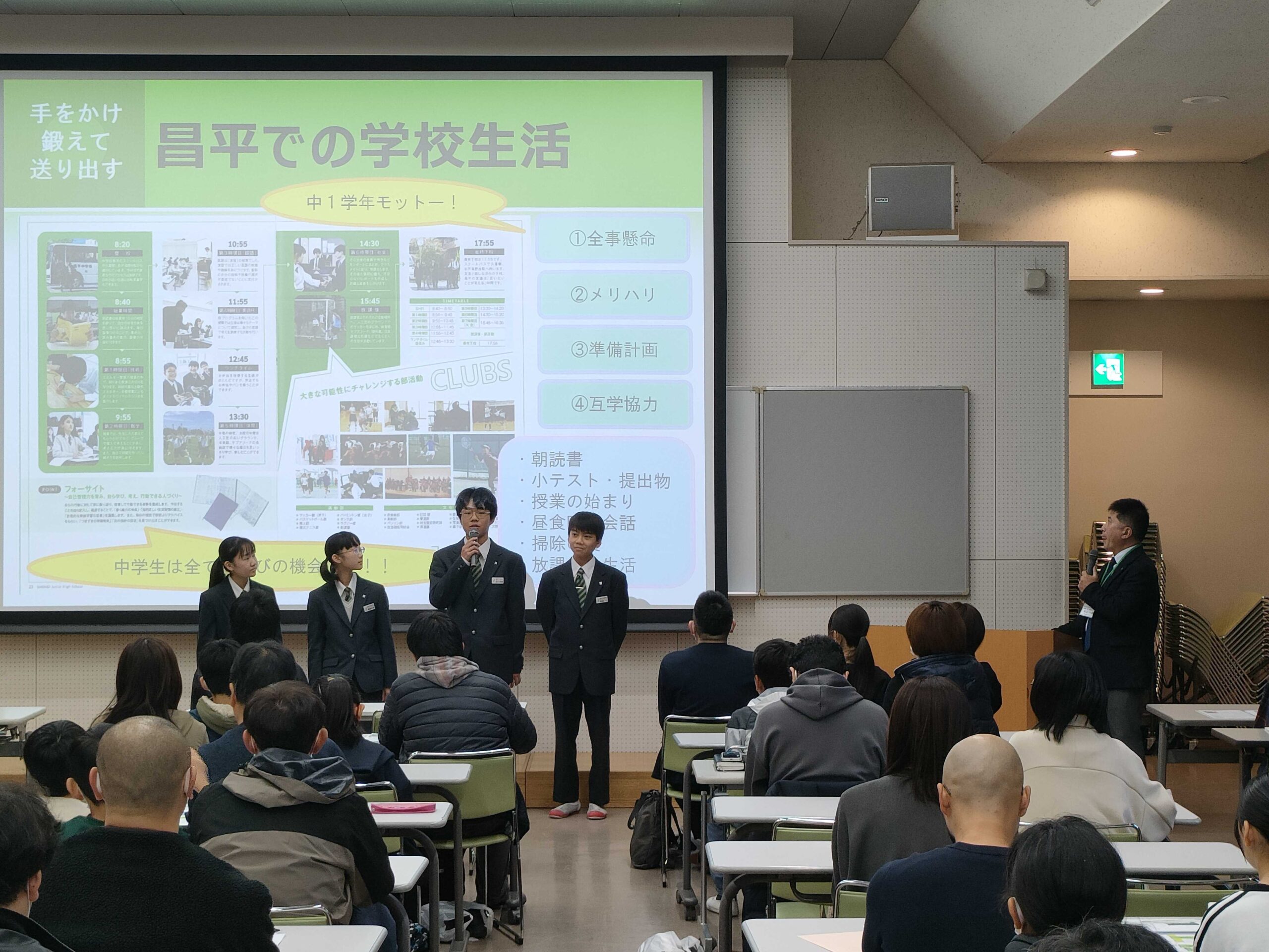 11月8日(土)に、今年度では8回目となる中学校説明会が行われました。説明会はランチルーム(初めて説明会にお越しいただいた方)、視聴覚ホール(以前にも説明会へお越しいただいた方)の2会場に分かれて行われました。新規の説明会では、「本校の教育について」「IB教育とSDGsについて」「本校の英語教育について」を、再来校の説明会では「昌平中の部活動(社会歴史研究部)」、「昌平の体育教育について」、「日常生活について(中学1年生)」をメインにお伝えさせていただきました。また、今回も生徒が発表することを通じて、普段の実践をアウトプットする良い機会となりました。