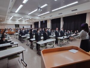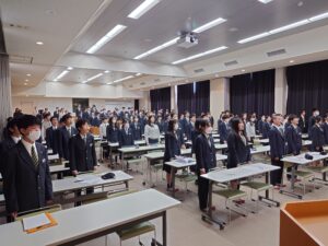 まずは全体で校歌を歌い、各クラスごとに課題曲を発表しました。