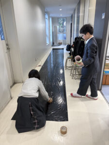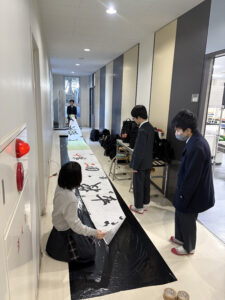 生物・化学部の1年生は、熱気球作りをしています。今は、大きな黒いビニールを紡錘形に切っているところです。静電気が起こりやすい素材を使っているので、近くにいた生徒たちの髪の毛が逆立っていますね。