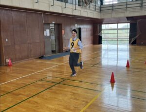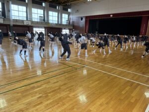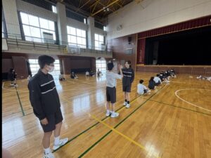 まずは準備運動からスタート。体育委員の掛け声に合わせて、全員でしっかりと体をほぐしました。