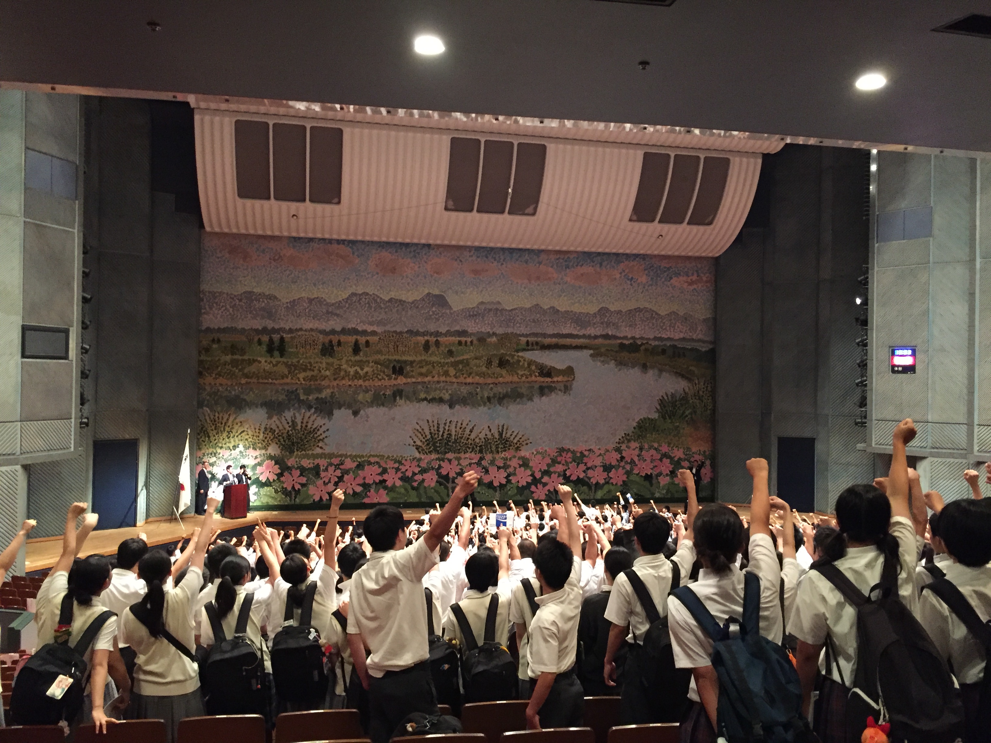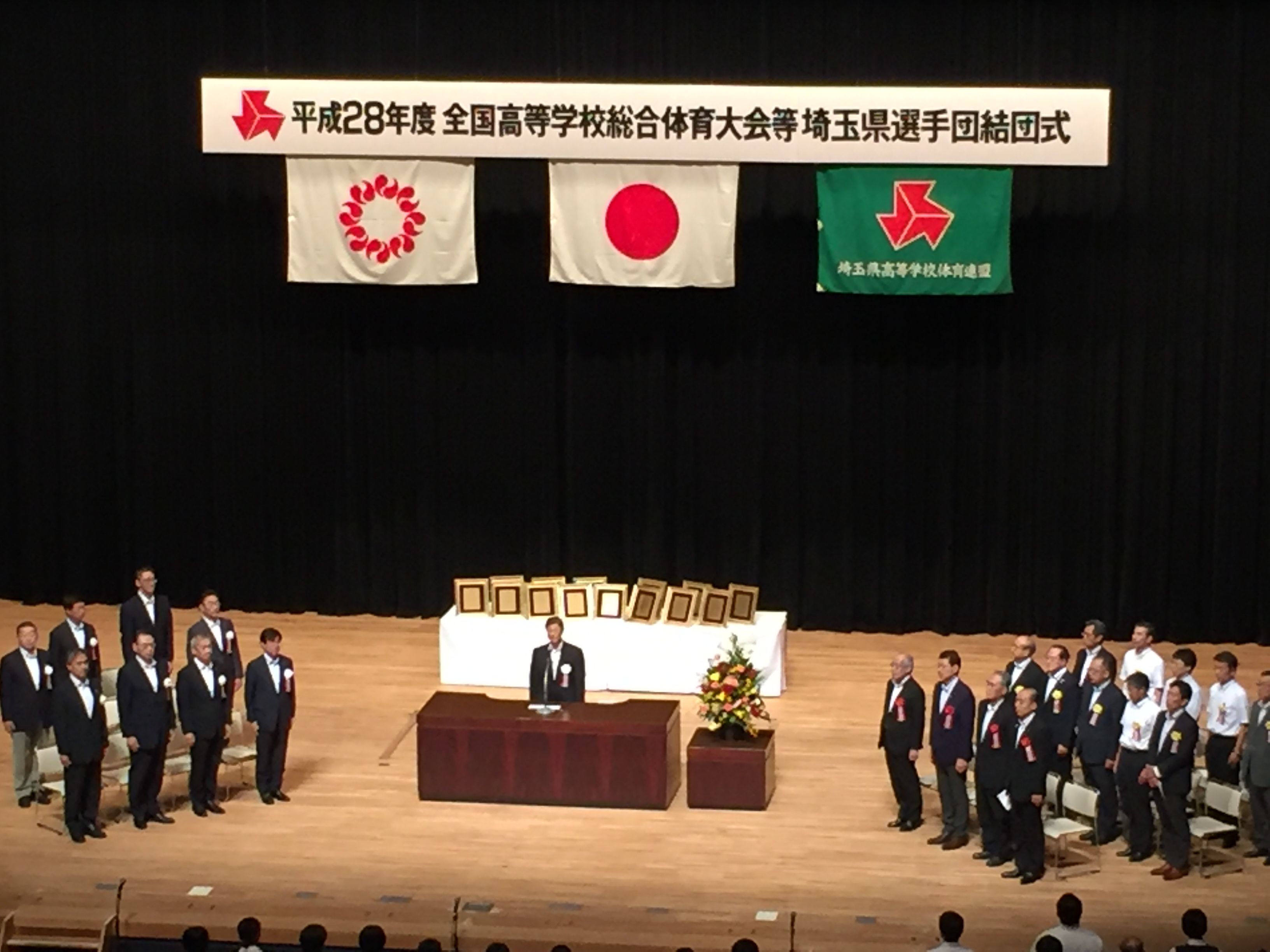 7月12日(火)に、さいたま市文化会館にて平成28年度全国高等学校総合体育大会の「埼玉選手団 結団式」が行われました。各競技の選手が紹介され、県高体連杉山剛士会長から「相手と競うだけでなく、自己管理などの自分との戦いに勝ち、スポーツ王国・埼玉代表としての誇りを持って戦い抜いて下さい」と激励のことばを頂きました。