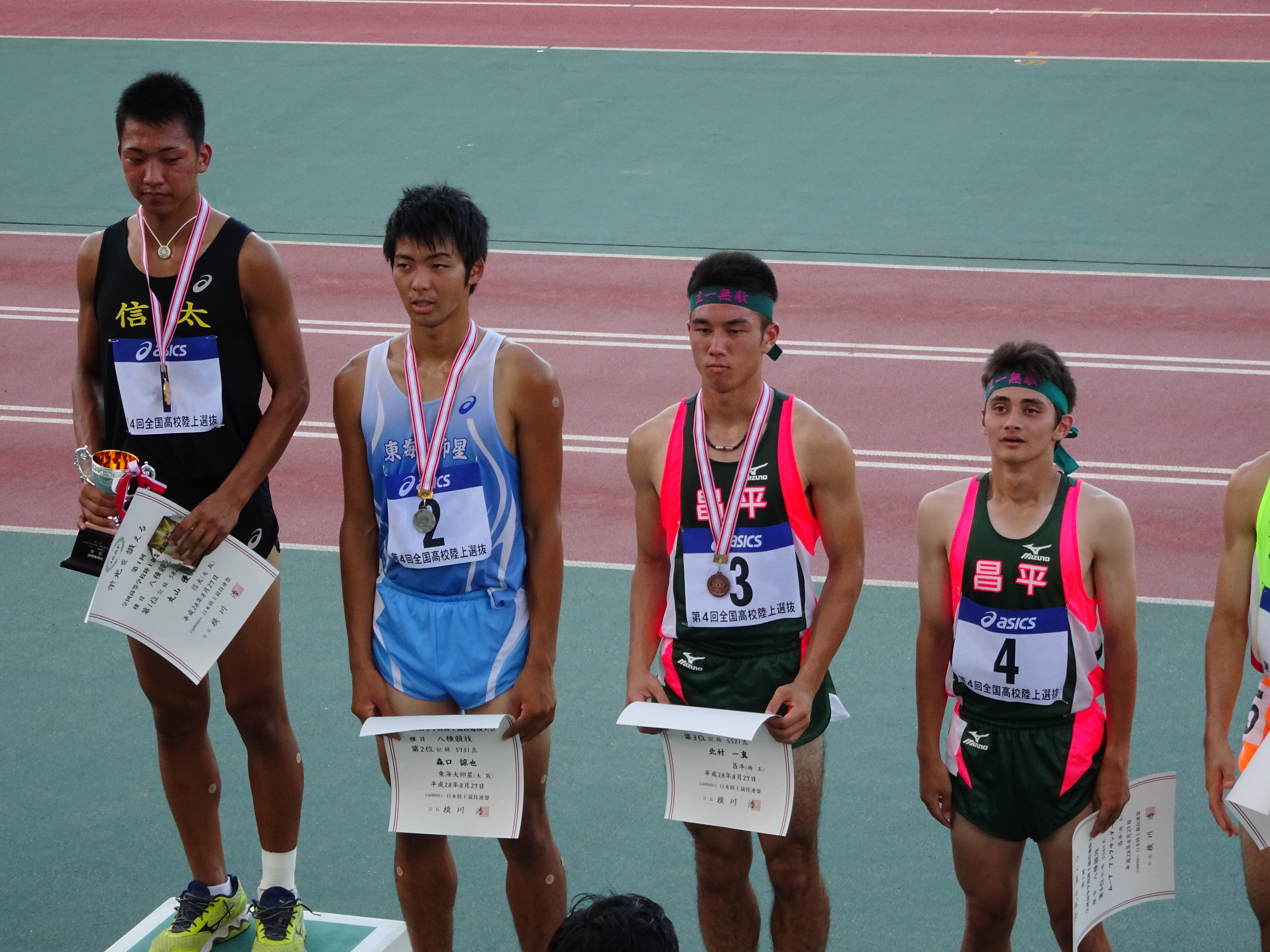 8月27日(土)・28日(日)、大阪ヤンマーフィールド長居陸上競技場で行われた「全国高校選抜陸上競技大会」の八種競技に全国標準記録を突破した3名の選手が本校から選出され、北村 一真(さいたま大原中出身)が総合得点5521点で第3位入賞、ムーア アレクサンダー海(三郷早稲田中出身)が5380点で第4位に入賞する事が出来ました。台風の影響で風に悩まされた大会となりましたが、3名とも集中を切らさず最後まで戦う事ができました。全競技終了後には、優勝した丸山選手(大阪信太高校)を中心に一つになり、全員で健闘を讃えました。