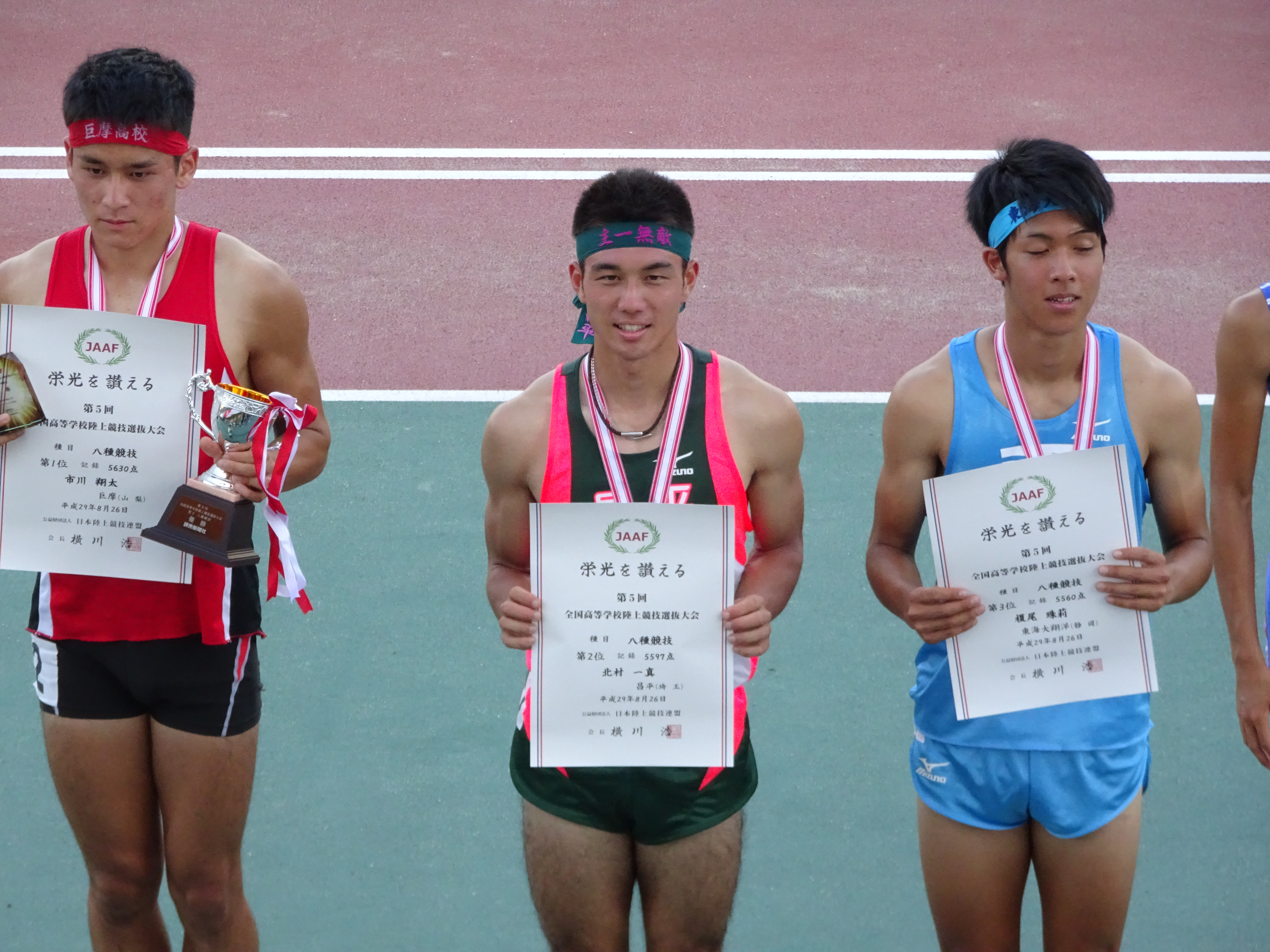 8月26日(土)からの2日間、大阪ヤンマーフィールド長居競技場で行われた「全国高等学校選抜陸上競技大会」に本校から北村 一真(さいたま大原中出身)が出場し、埼玉県高校新記録となる5597点を獲得し準優勝しました。前半はやや遅れをとりましたが、6種目でトップになり、残る7種目で再びリードを許し、最終種目1500m勝負となりましたが、6秒及ばず準優勝という結果でした。自ら持つ埼玉県記録を49点越えての準優勝。全ての種目に集中し頑張ったと思います。