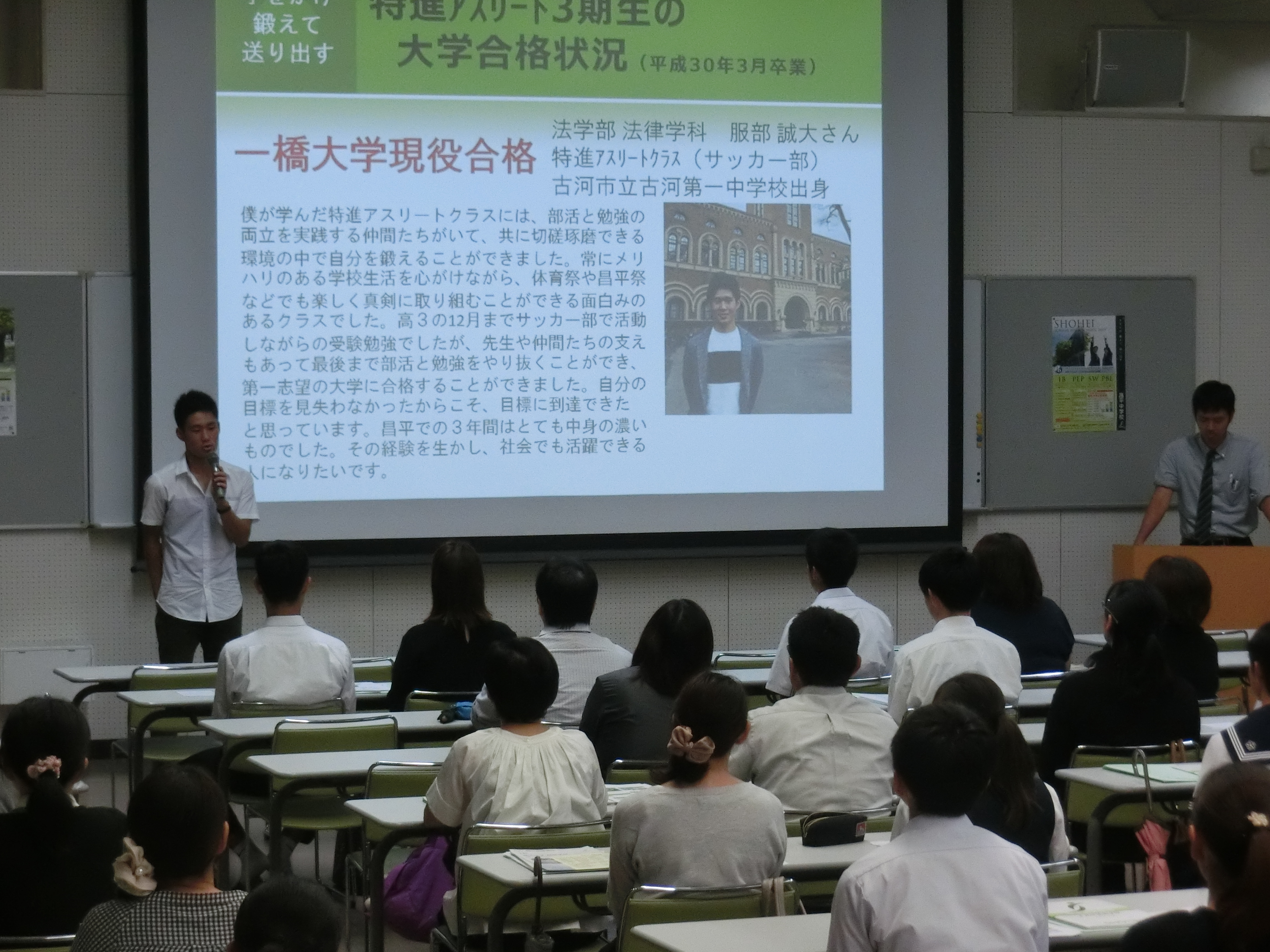 また、昨年特進アスリートクラスを卒業し、一橋大学に入学した服部君から、合格までの自身の学習の仕方や日常生活についてのアドバイスをもらいました。