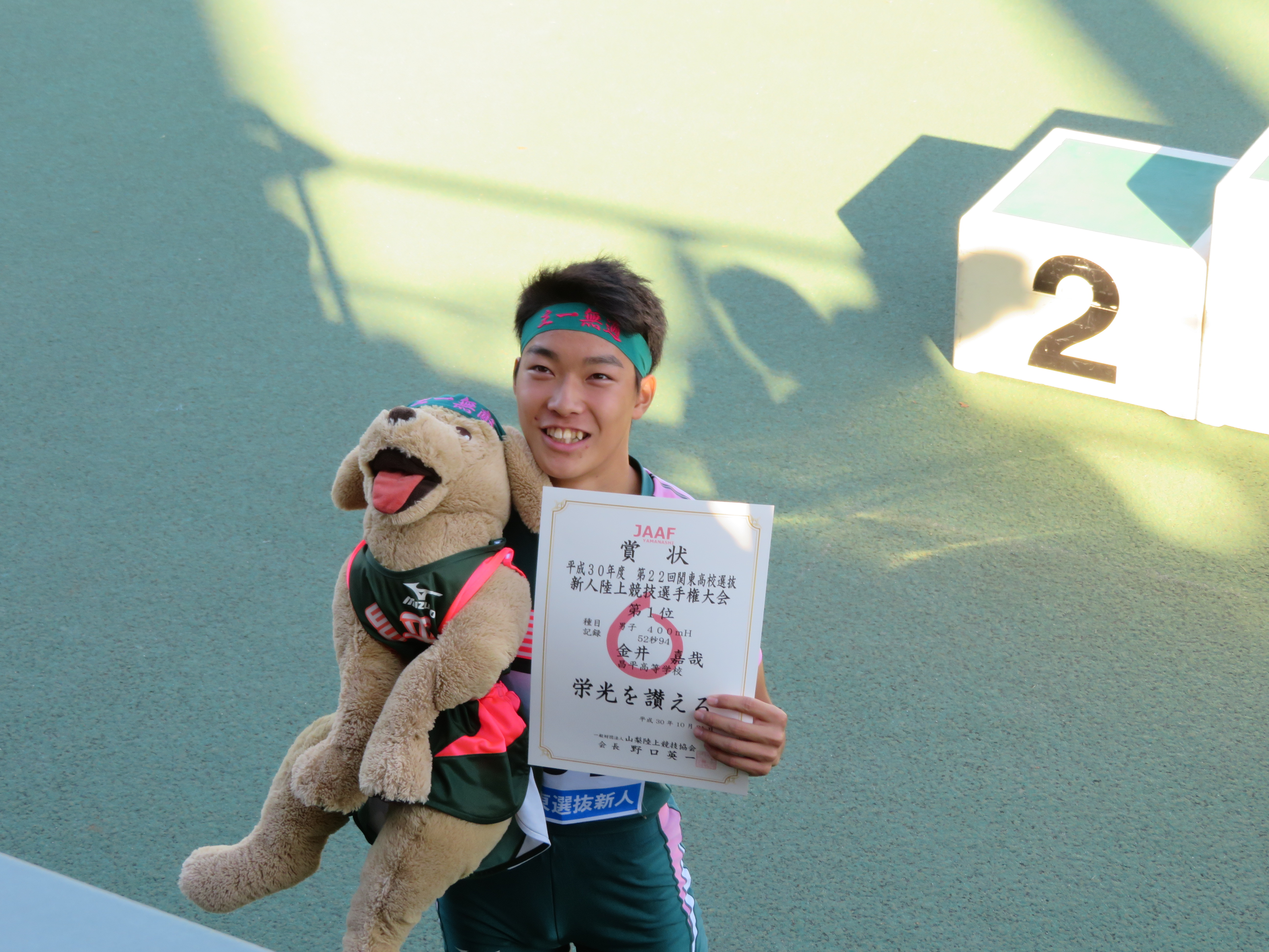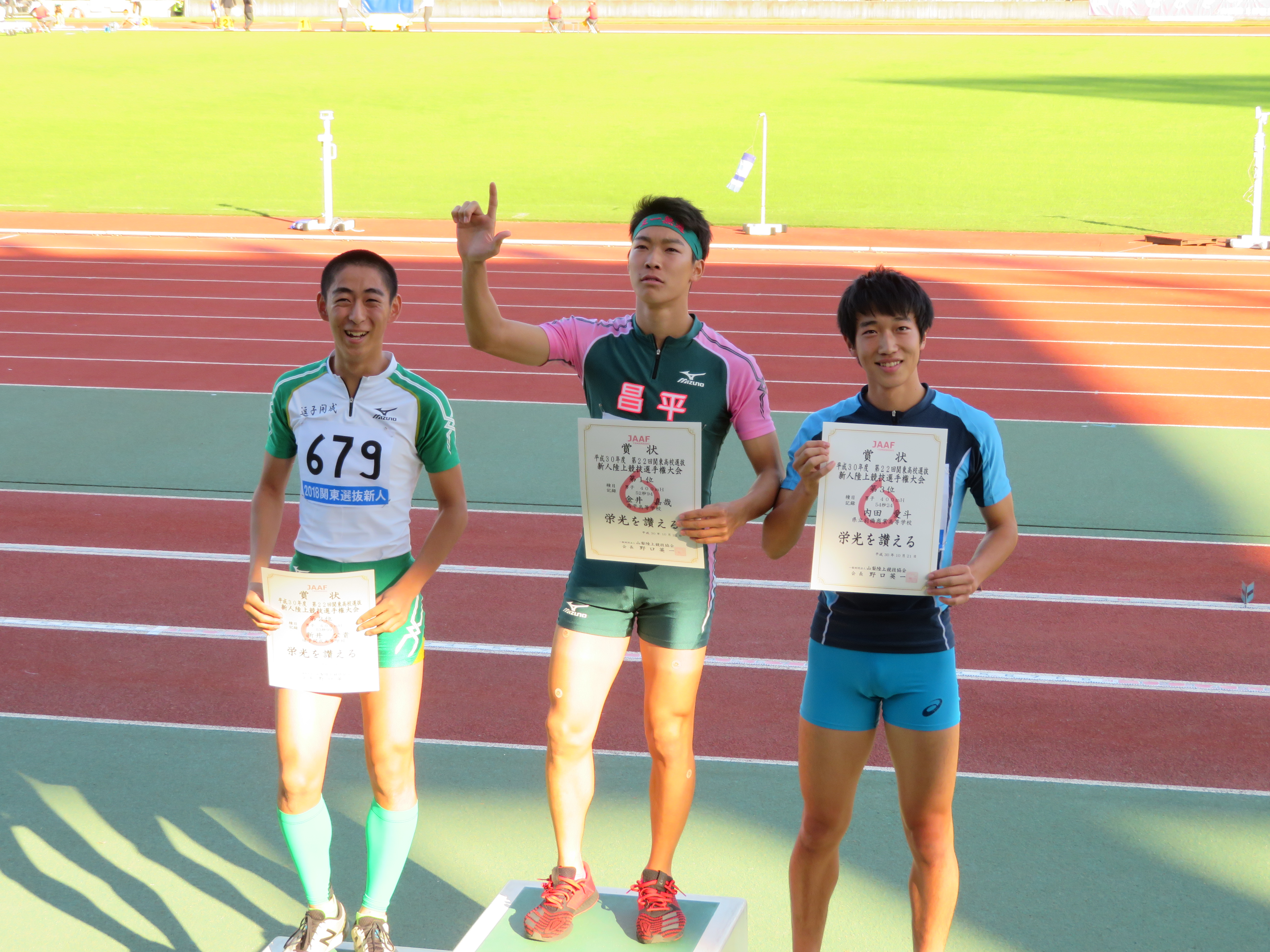 10月20日(土)・21日(日)の二日間、山梨県「小瀬中銀スタジアム」で行われた関東選抜新人陸上大会に男子陸上部から5名の選手が出場しました。400mハードルに出場した金井 嘉哉[春日部豊野中出身]が予選53秒67でトップ通過すると、決勝では自己記録を2秒回る52秒94の好記録で2位以下を1秒以上引き離し優勝することができました。