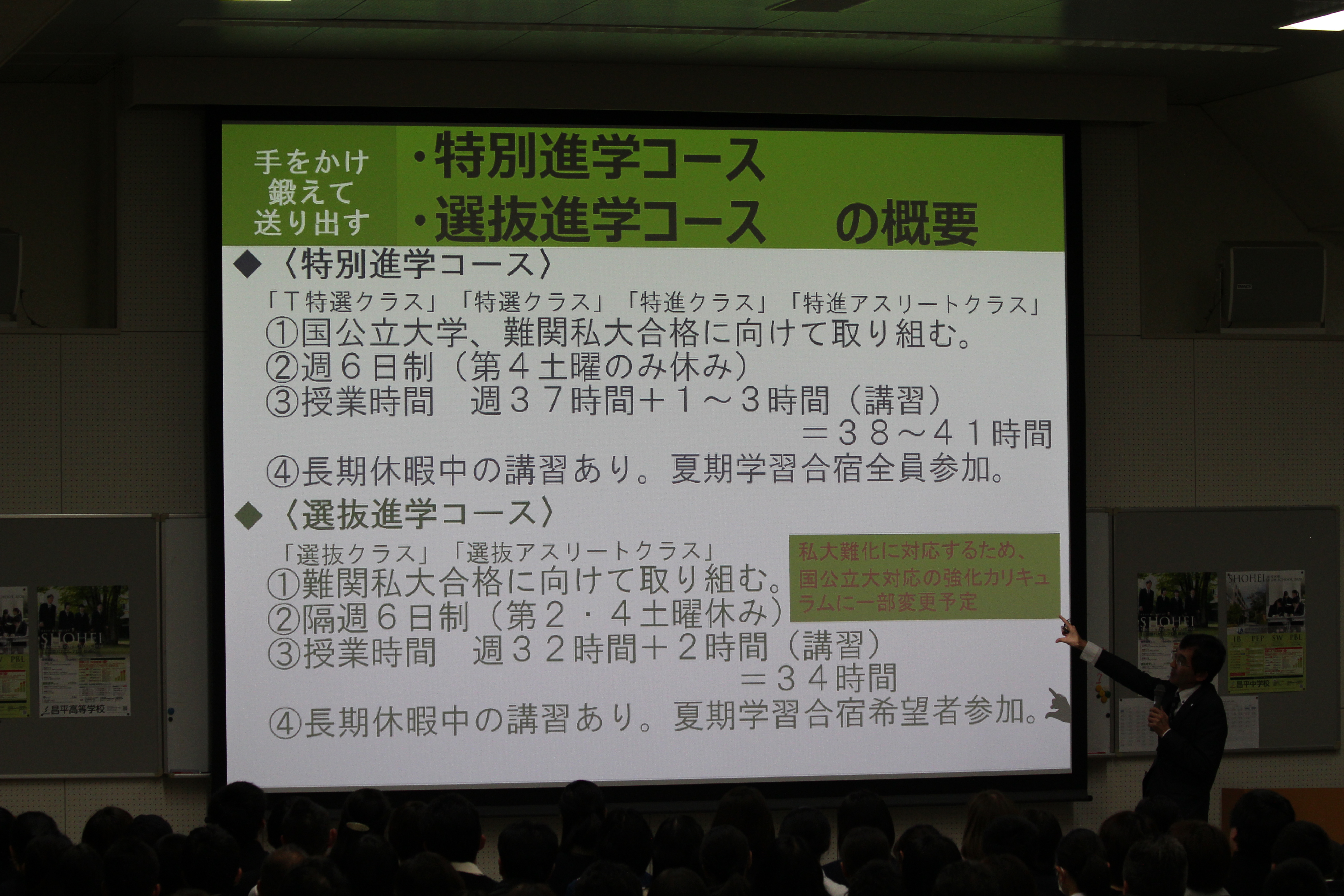 説明会では、教育方針をはじめとする学校の概要やコース制度についての説明がありました。