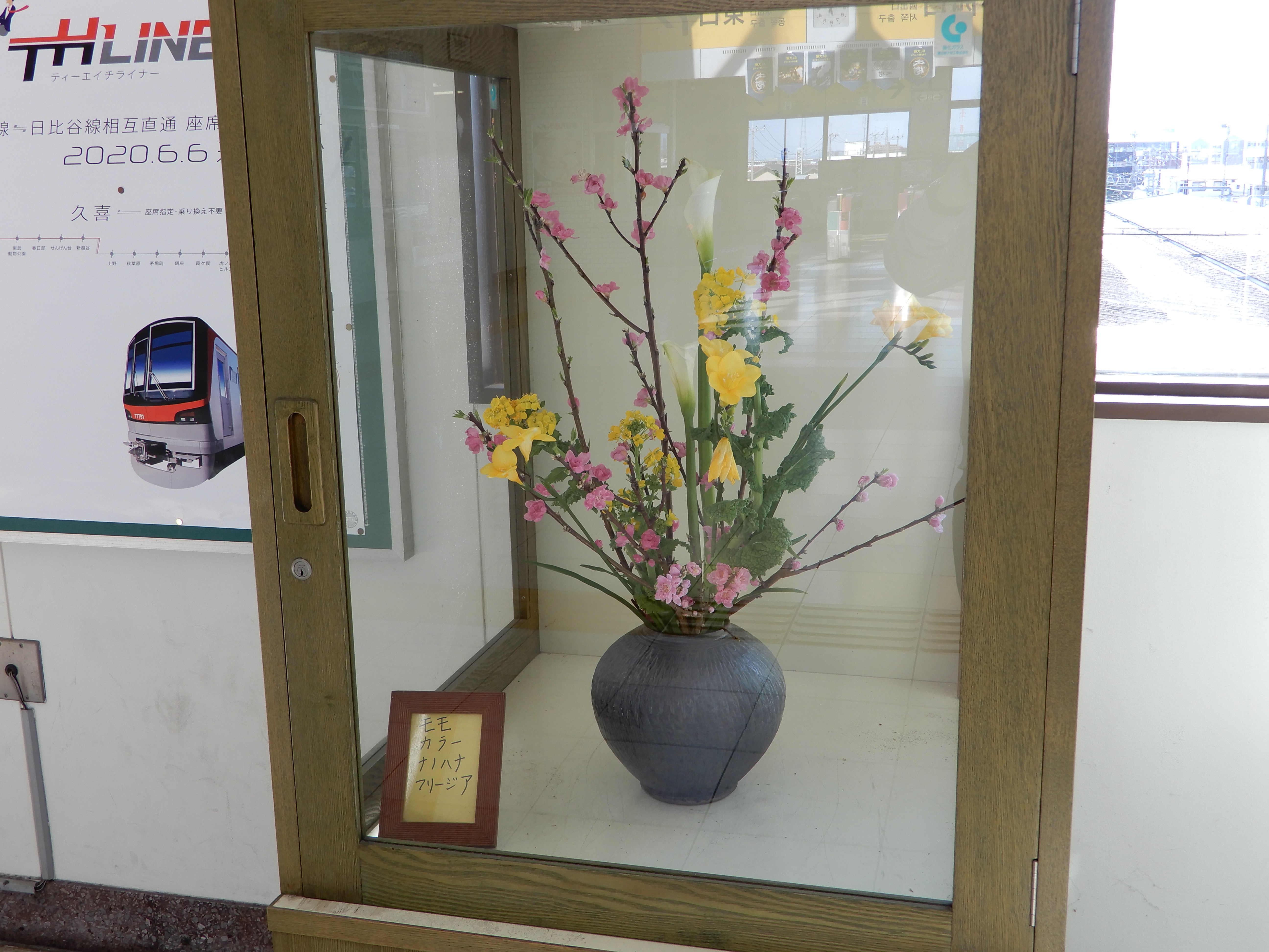 昌平高校の華道部は、毎週、杉戸高野台駅構内にて生け花を展示しています。