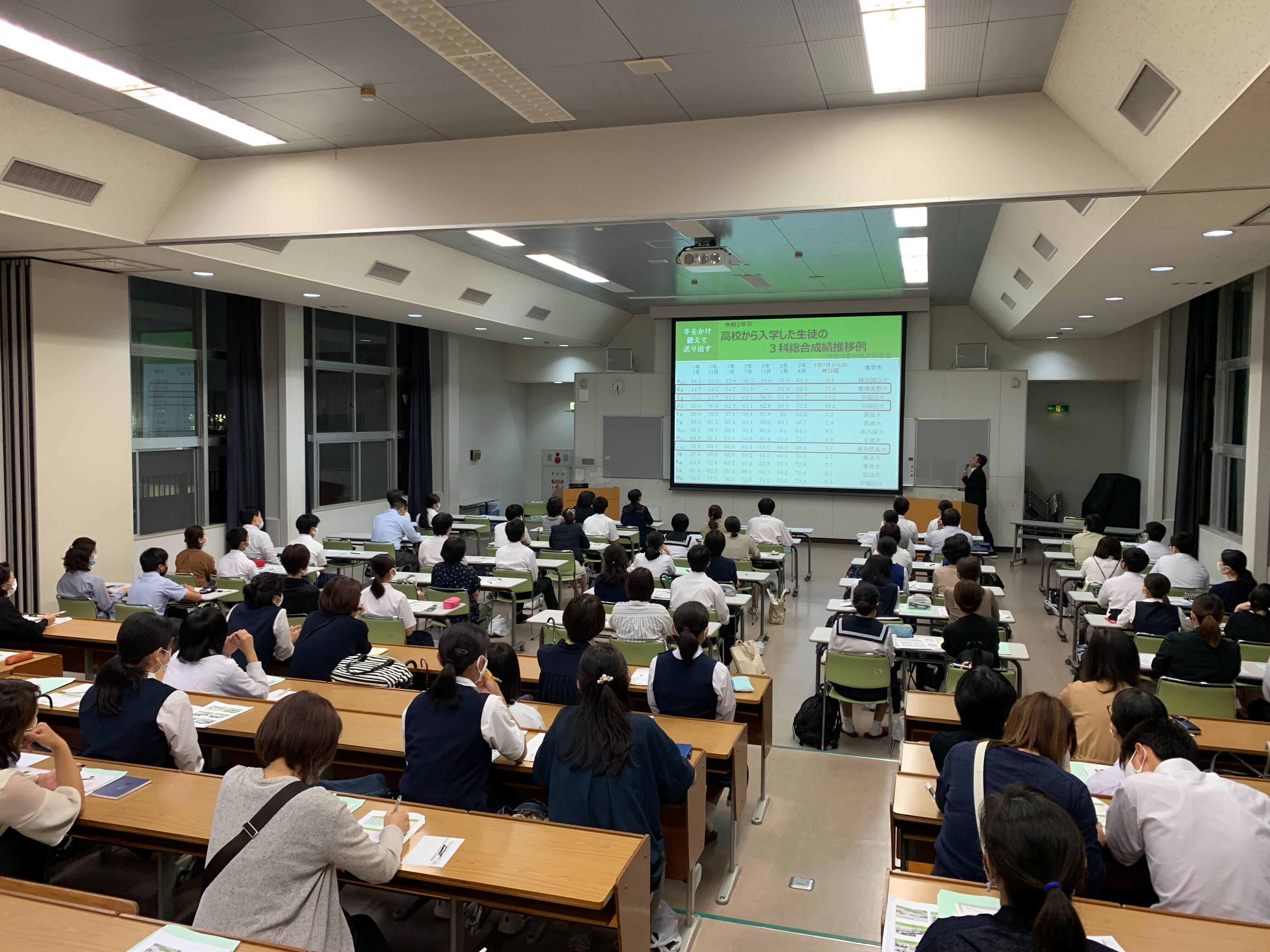 9月23日(水)放課後に、中学生と保護者の皆様を対象とした夜間学校説明会を開催いたしました。当日は天候が思わしくなく、時間帯も放課後と遅い時間ではありましたが、たくさんの中学生と保護者の方々がご参加くださいました。