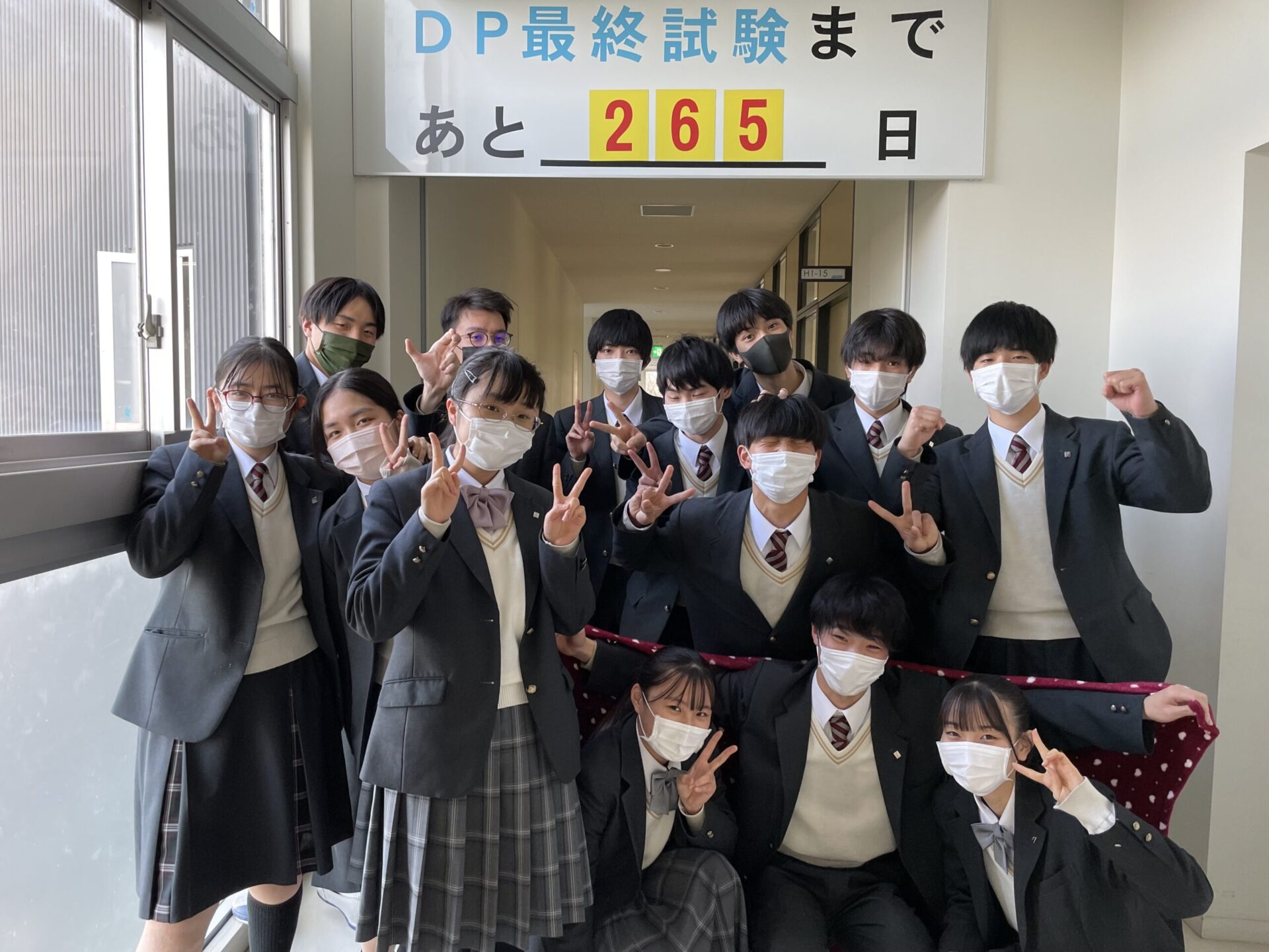 昌平高校の校門をくぐると、生徒の玄関に掲げられた「共通テストまで○○〇日」という看板が目に飛び込み、生徒達は気を引き締め登校します。昌平高校にはIB(DP)コースがあり、そこに所属する生徒は高3の秋にDP資格取得のための最終試験を受けます。大学合格を大きく左右する大事な試験です。そこで他のコースとは別に、IBコースの1,2,3年生の教室がある場所に写真のような看板を設置し、朝登校するとその日数を見て一日をスタートさせています。数字を変えるのは受験該当学年だけではなく1,2,3年生が交代で行なっています。大切なその日まで、あと・・・「265日!!」来年の今頃、その笑顔が見られますように!