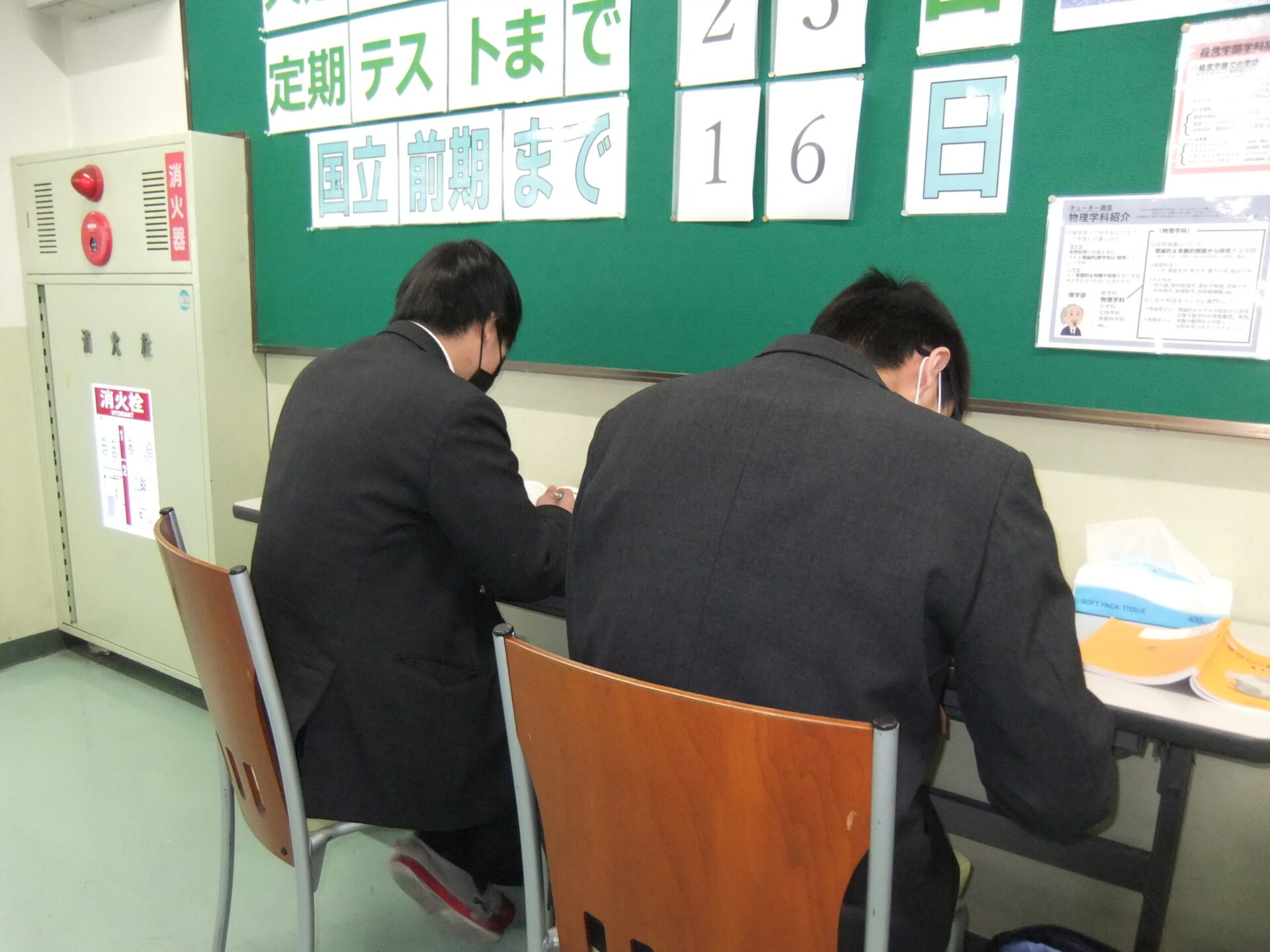 廊下の質問スペースでは,先生に聞いたり,お互いに教え合ったりする姿も見られます。感染予防を徹底の上,来るべき受験日に向けて万全の準備をしてほしいと思います。