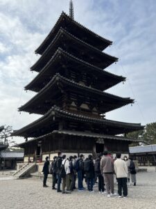 午前中は、バススガイドさんに解説を頂きながら、法隆寺で飛鳥・奈良時代の文化に触れてきました。