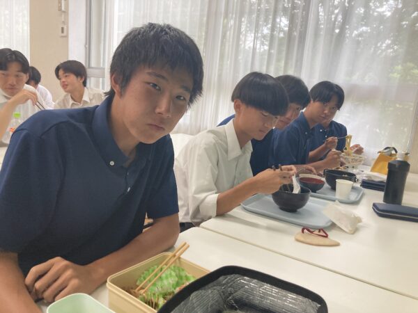 学校生活での楽しみのひとつはお昼休みです。今日も4時間目が終わるとすぐに食堂には行列ができていました。本日の定食「豚しゃぶ」のほか、「スタ丼」や「うどん」などを食べながら楽しい時間を過ごしていました。