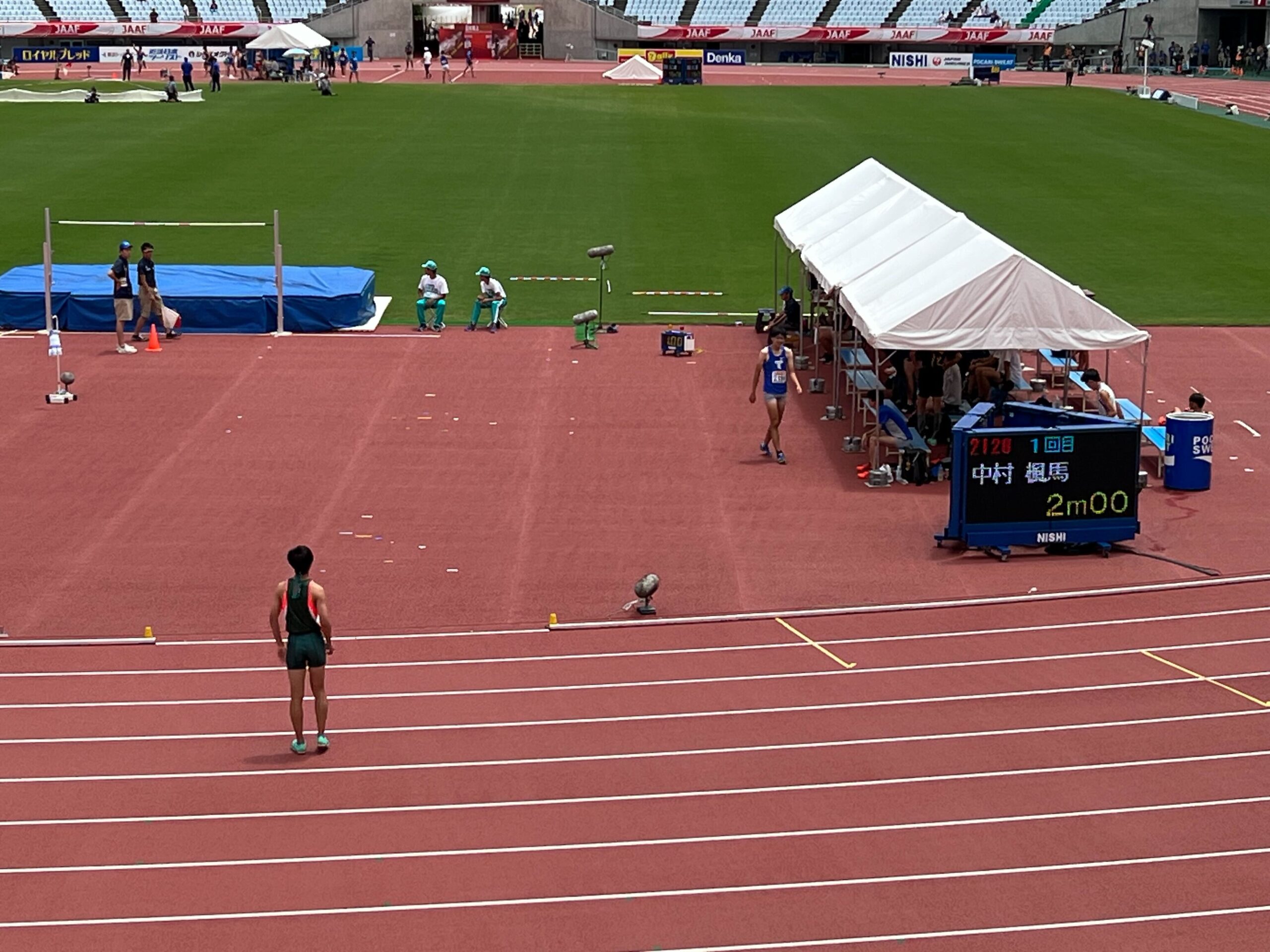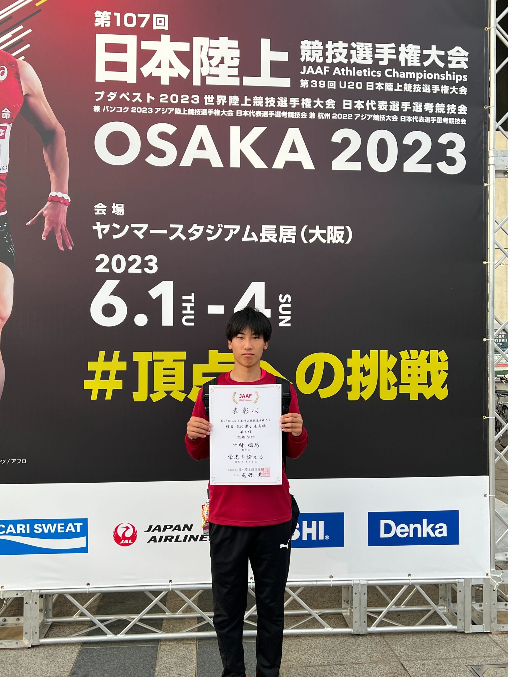 6月1日(木)から大阪ヤンマースタジアム長居で行われた第39回U20日本陸上競技選手権大会に3年生中村楓馬(3:上尾原市中学出身)がU20男子走高跳に出場しました。前日は台風2号の影響で交通機関が麻痺、12時間掛けて大阪入り。前日の疲労が残っていましたが、当日は試合に集中。2m00を1回目に跳び6位入賞を決めました。