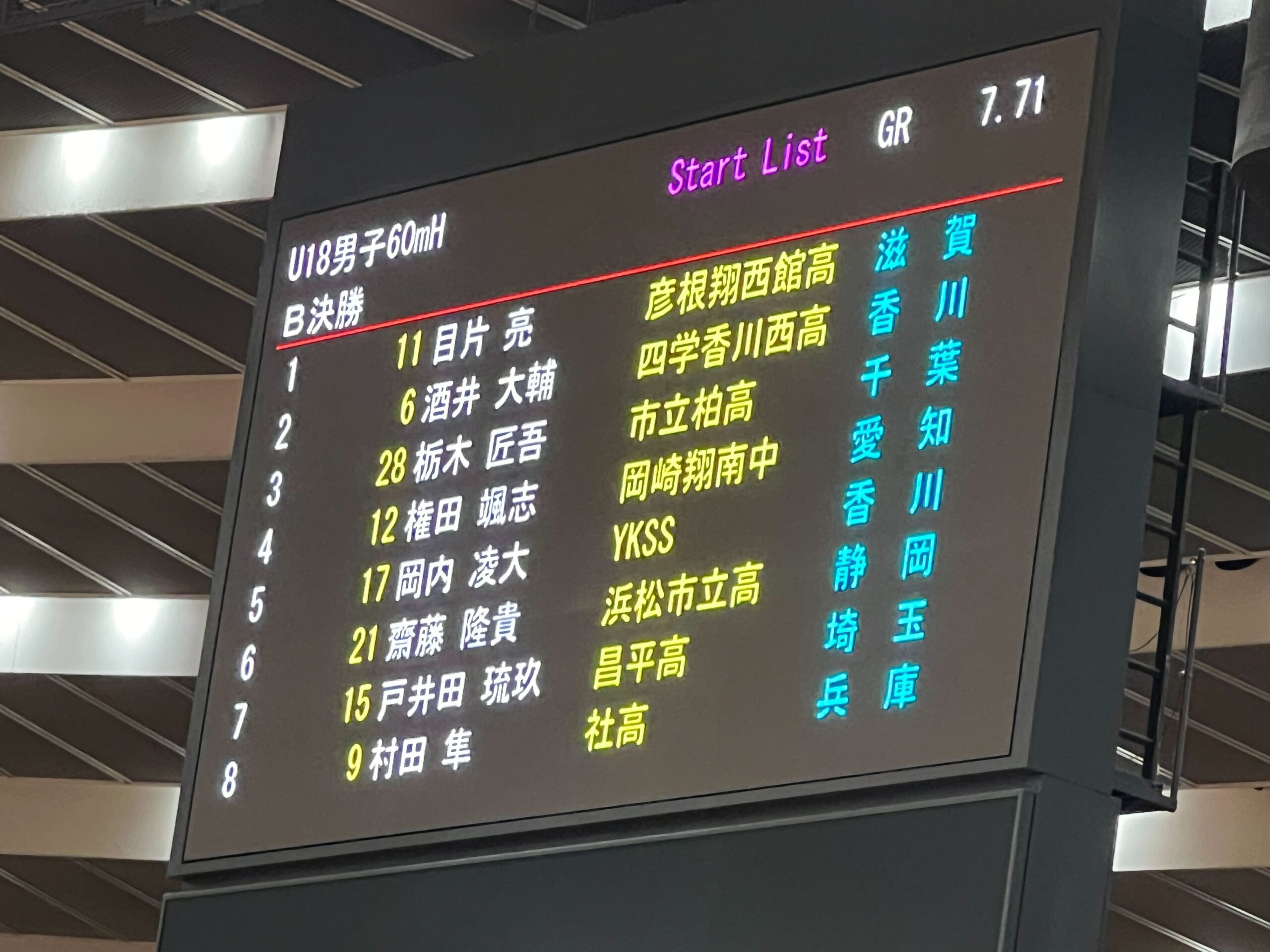 2月3日(土曜日)から大阪城ホールで行われた「2024日本室内陸上競技 大阪大会」に1年生戸井田琉玖[越谷北陽中出身]がU18:60mJハードルに出場しました。予選8秒21で2着に入り午後のB決勝に進出。B決勝8秒11で走り1位に、A決勝・B決勝トータルで全体5番目の記録で終了しました。