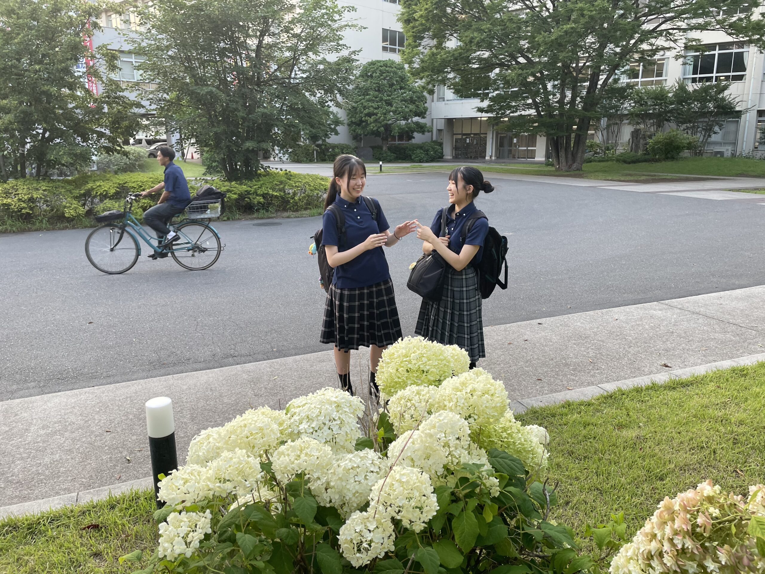 中庭の白紫陽花を愛でながら、はじける笑顔で帰宅する生徒の姿。