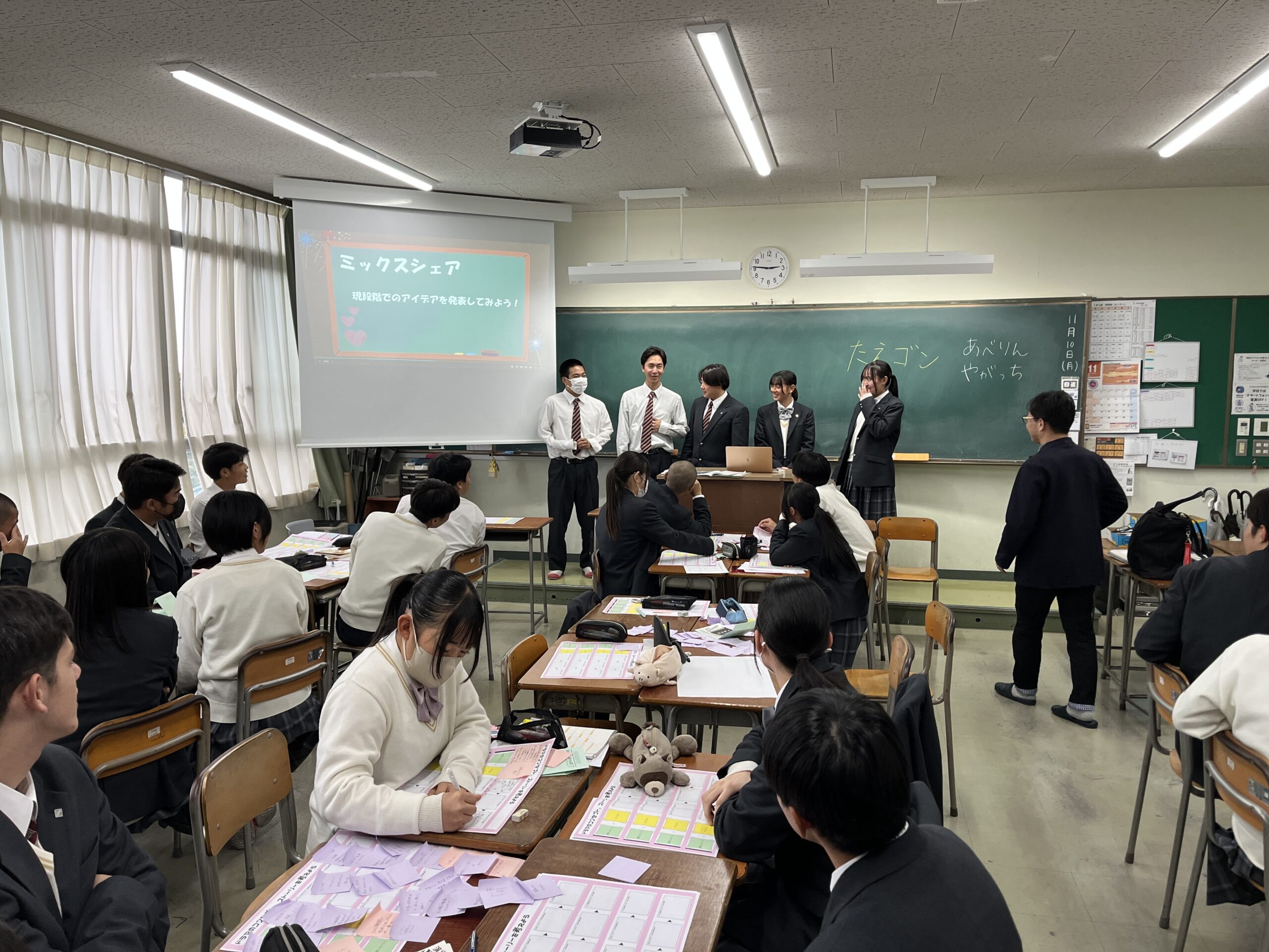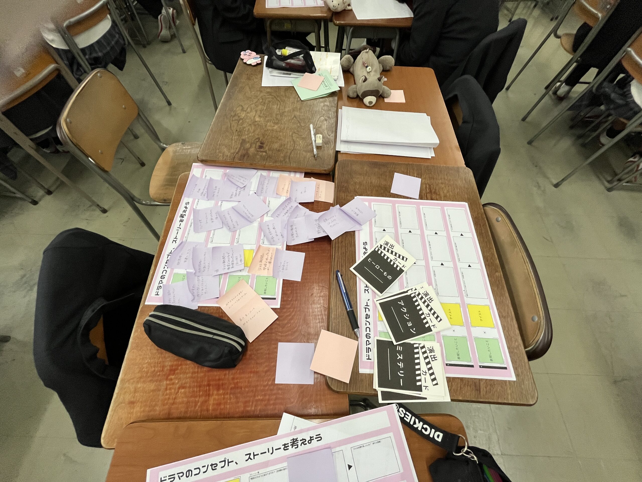 授業では、生徒たちが5人グループに分かれ、「学校生活で心が動いた瞬間」を付箋に書き出しながらエピソードを共有しました。その内容をもとに、各グループで一つのショートドラマのストーリーを構成しました。