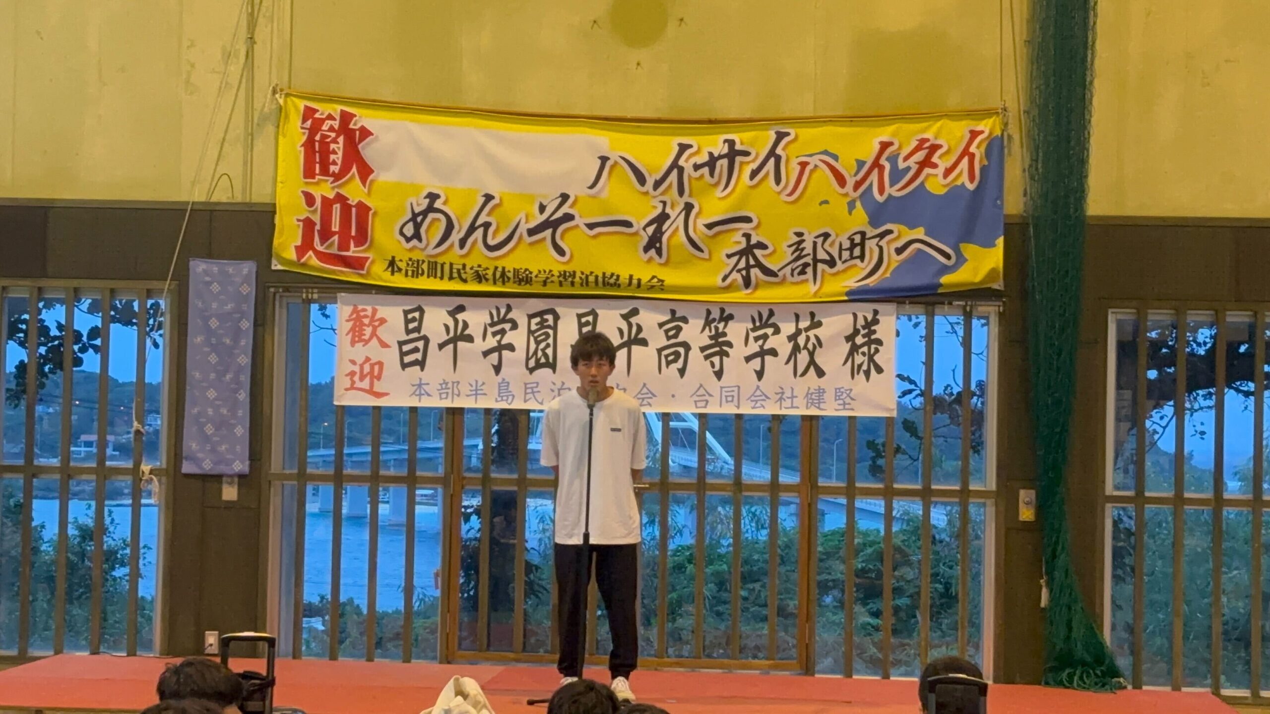 夜からは本部町での民泊が始まりました。現地の方からの歌と踊りでの歓迎、2-6梶本君のあいさつで開町式を終え、それぞれの民泊先へと向かいました。寮生活を送っているアスリートクラスの生徒が多い沖縄班ですが、普段とはまた違う環境での生活や、明日の午前中に行われる家業体験から新しい学びや刺激を得てくれると思います。