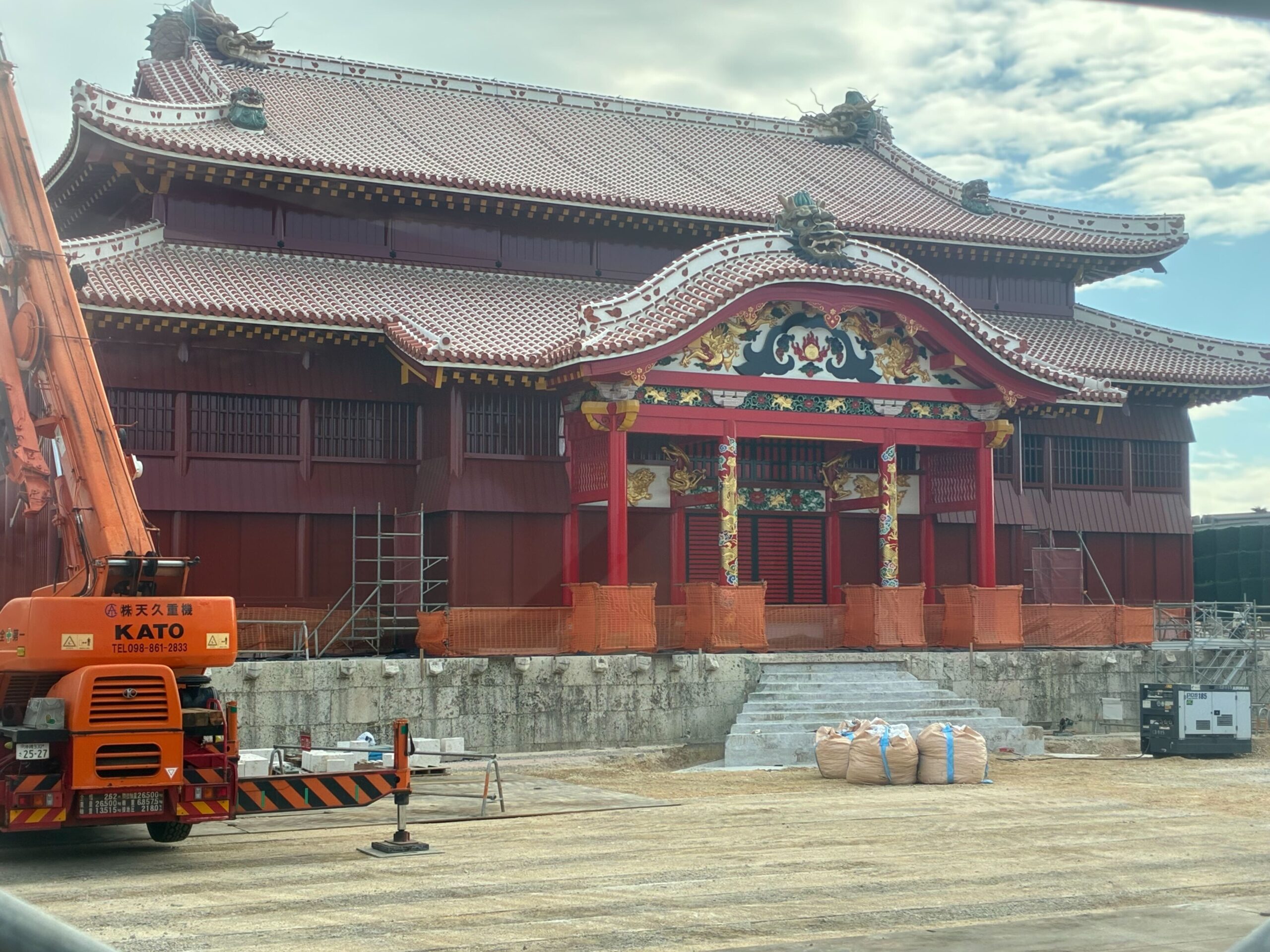 首里城は2019年に焼失してから復旧工事が続いているのですが、晴れて来年の秋には工事が終わるそうです。工事中といっても外装工事はほとんど終わっていて、私たちが想像する真っ赤な首里城を見ることができました。昌平高校の修学旅行としては工事中の首里城を見ることができるのはこれが最後なので、生徒たちは貴重な体験ができたと思います。