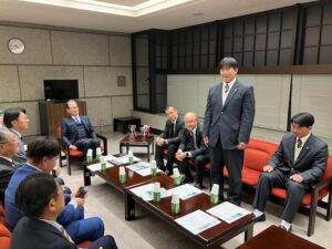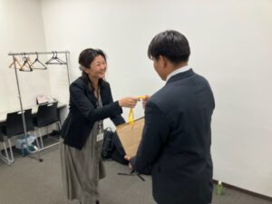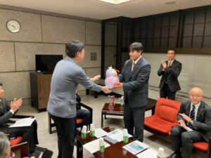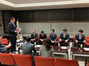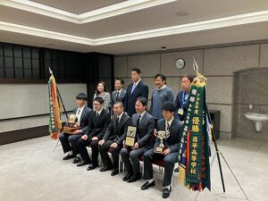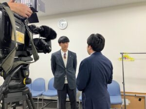その後、テレビ埼玉本社を訪問し、全国大会出場の報告をいたしました。黒澤常務取締役から激励のお言葉をいただき、両主将が「全国舞台での活躍」を誓いました。