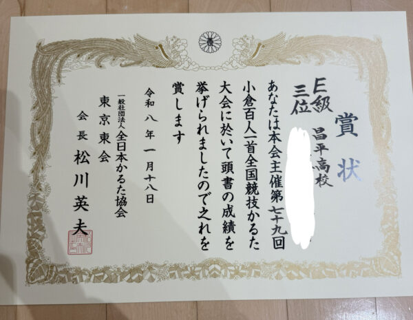 高1の4月から始めて1年かけてもなかなか昇段できない高校生も大勢いる厳しい世界で、当該生徒のように、受験が終わってからかるたを始め、たった1ヶ月で結果を出すことは簡単なことではありません。
