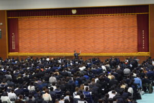 本校の校名「昌平」は、学問の神様として知られる孔子にゆかりがあります。つまり、「昌平」の門をくぐる者には、まず第一に学問に対する誠実な姿勢が求められます。この精神を言葉にしたものが、本校の校訓である「礼儀・勤勉・明朗」です。本日の資料『入学のしおり』をよく読み、気持ちを引き締めて高校生活のスタートに備えてください、という話がありました。