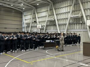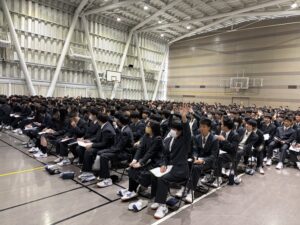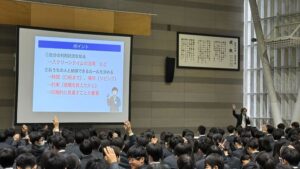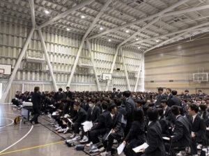 また、講演会に先立つ1時間目には、進路指導部および生活指導部の先生方による訓話が行われました。高校生活のスタートにあたり、学習面と生活面の両方から大切な心構えを学びました。集会の締めくくりには、音楽科の川﨑先生による校歌指導も行われました。サブアリーナには、1年生たちの若さあふれる元気な歌声が響き渡り、学年としての結束がより一層強まった時間となりました。